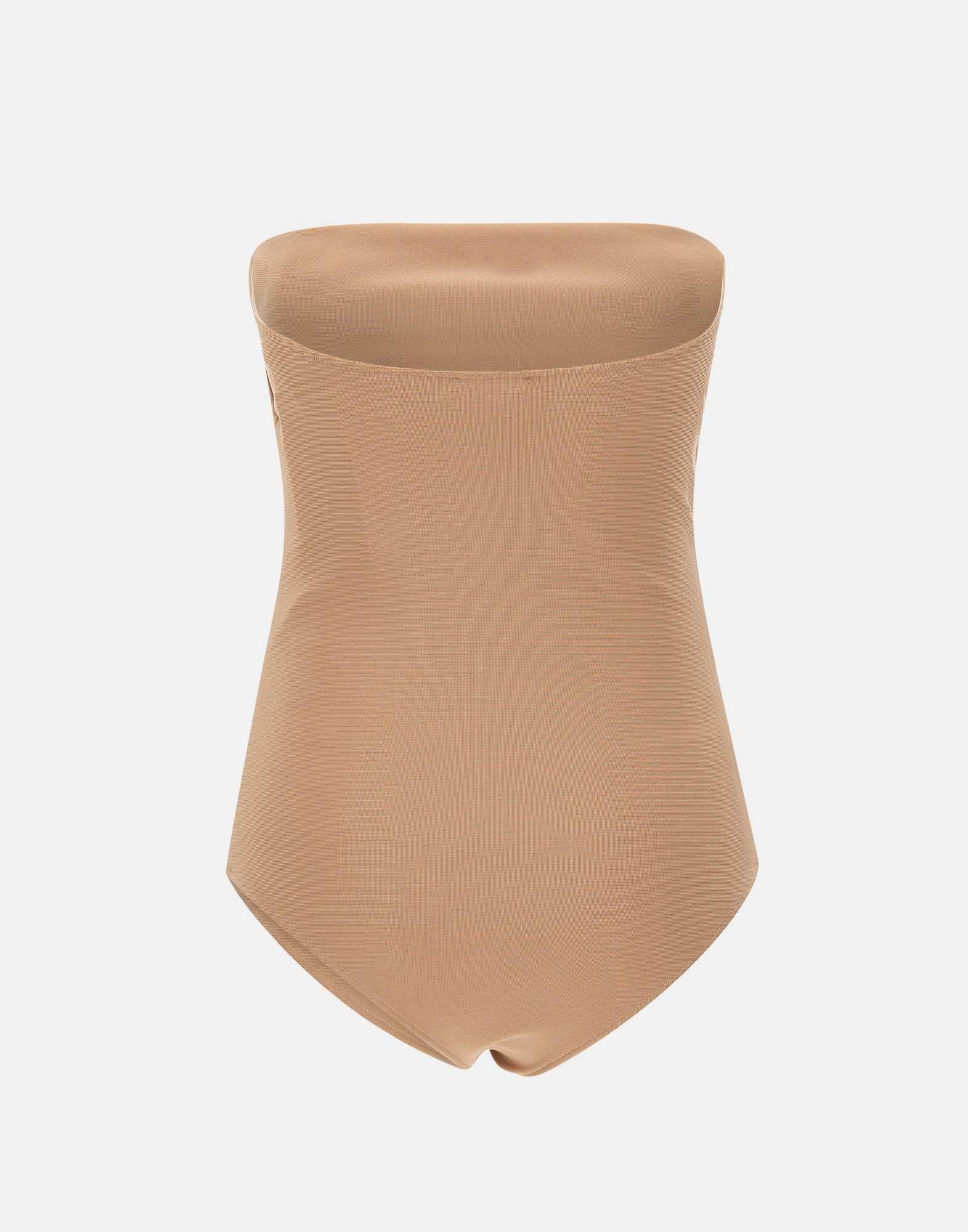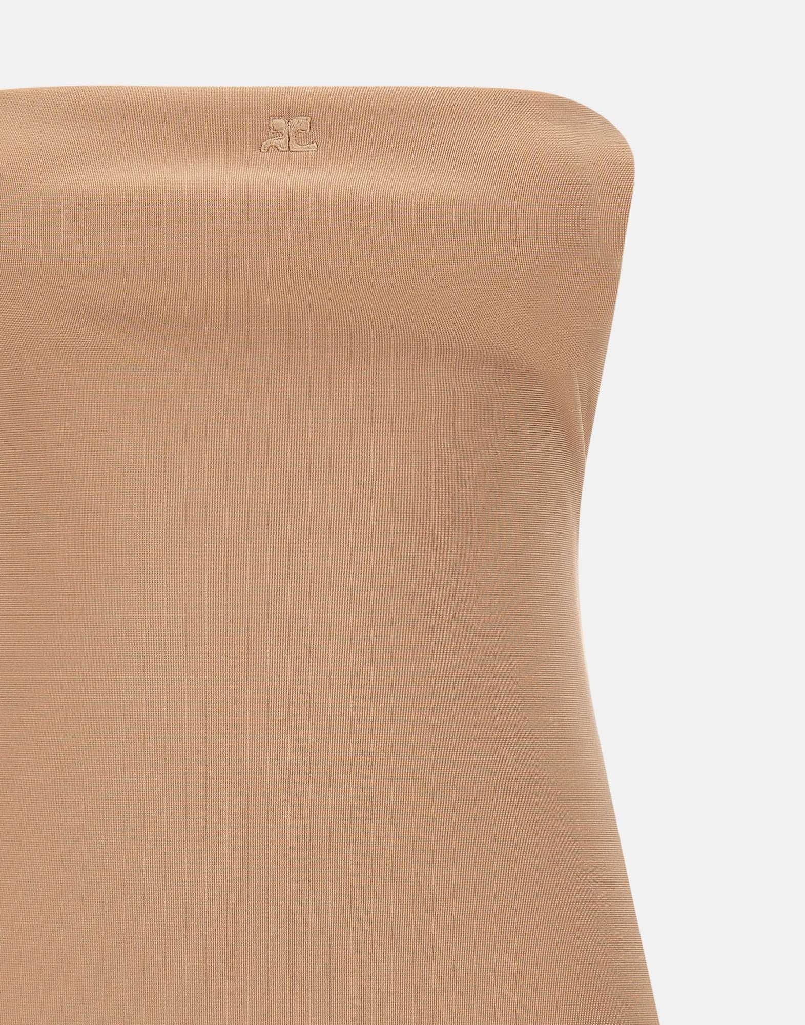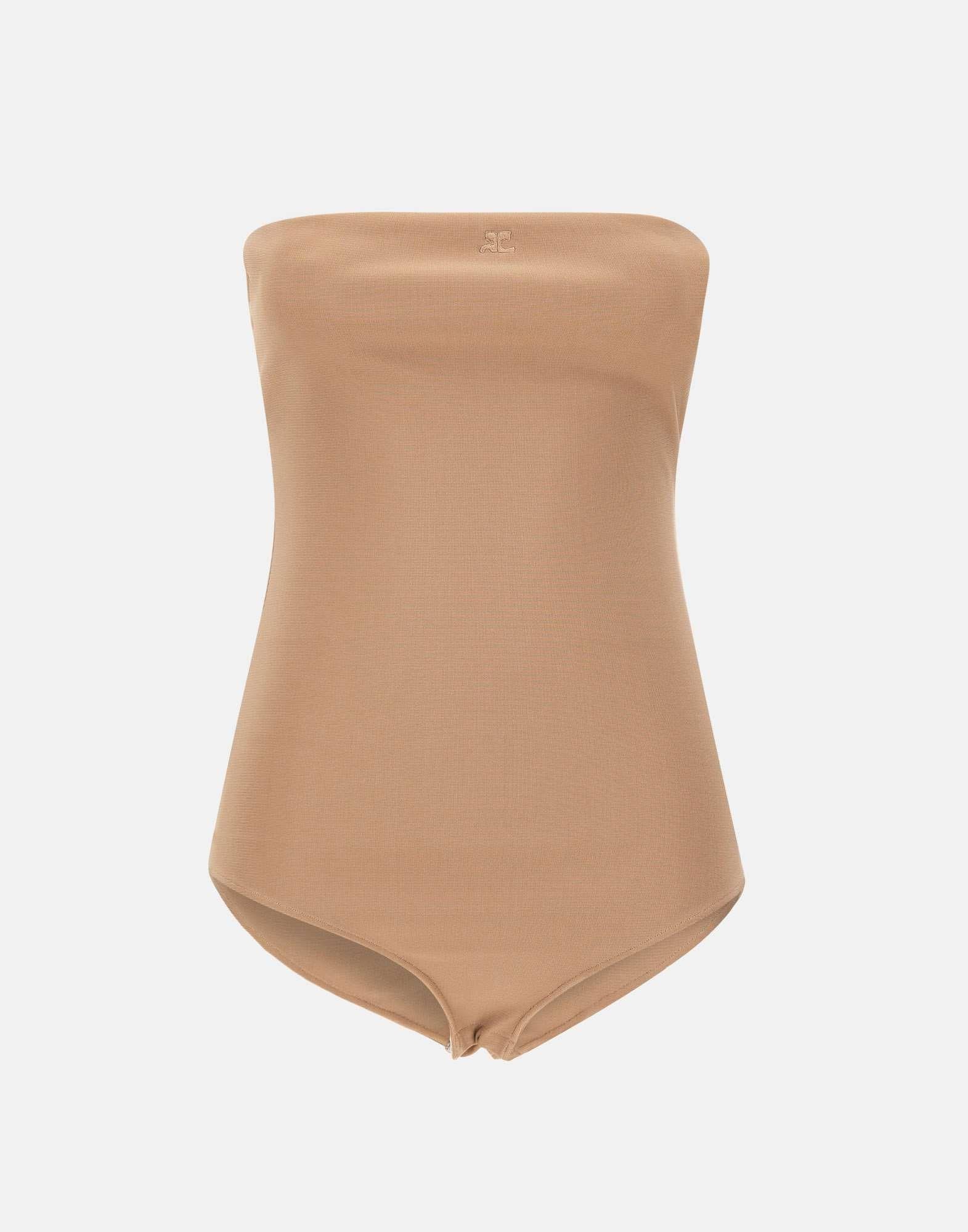 Body Courrèges modello "Bustier Lingerie Jersey Bodysuit", realizzato in jersey di viscosa stretch color nude. Il design senza spalline unisce linee essenziali e dettagli raffinati, arricchito da un inserto lingerie sul retro e dal logo AC ricamato sul davanti. Vestibilità regular. Made in Italy.