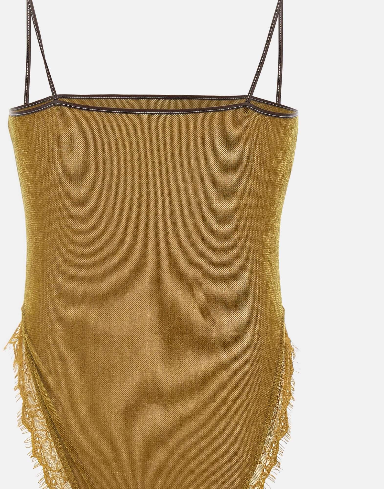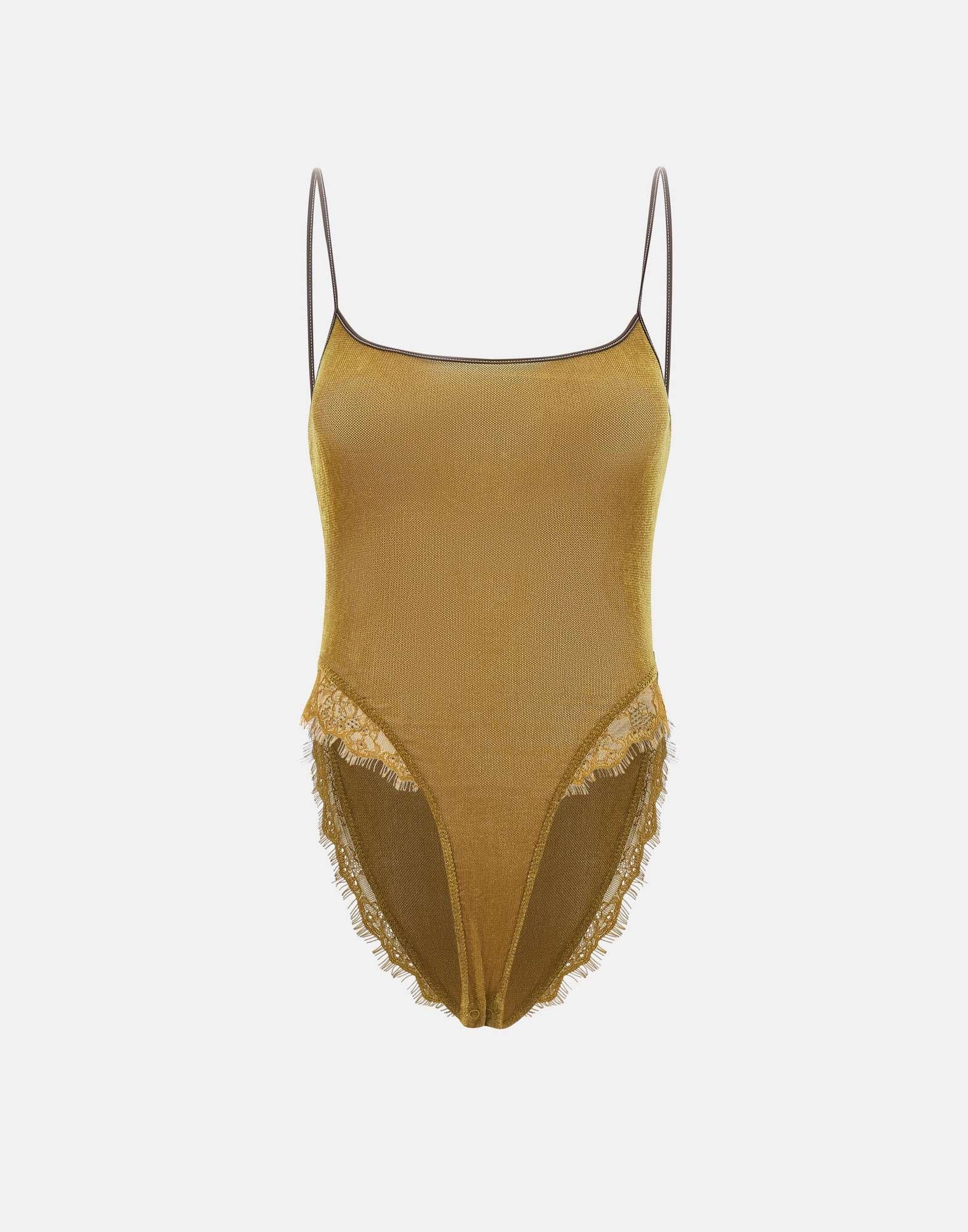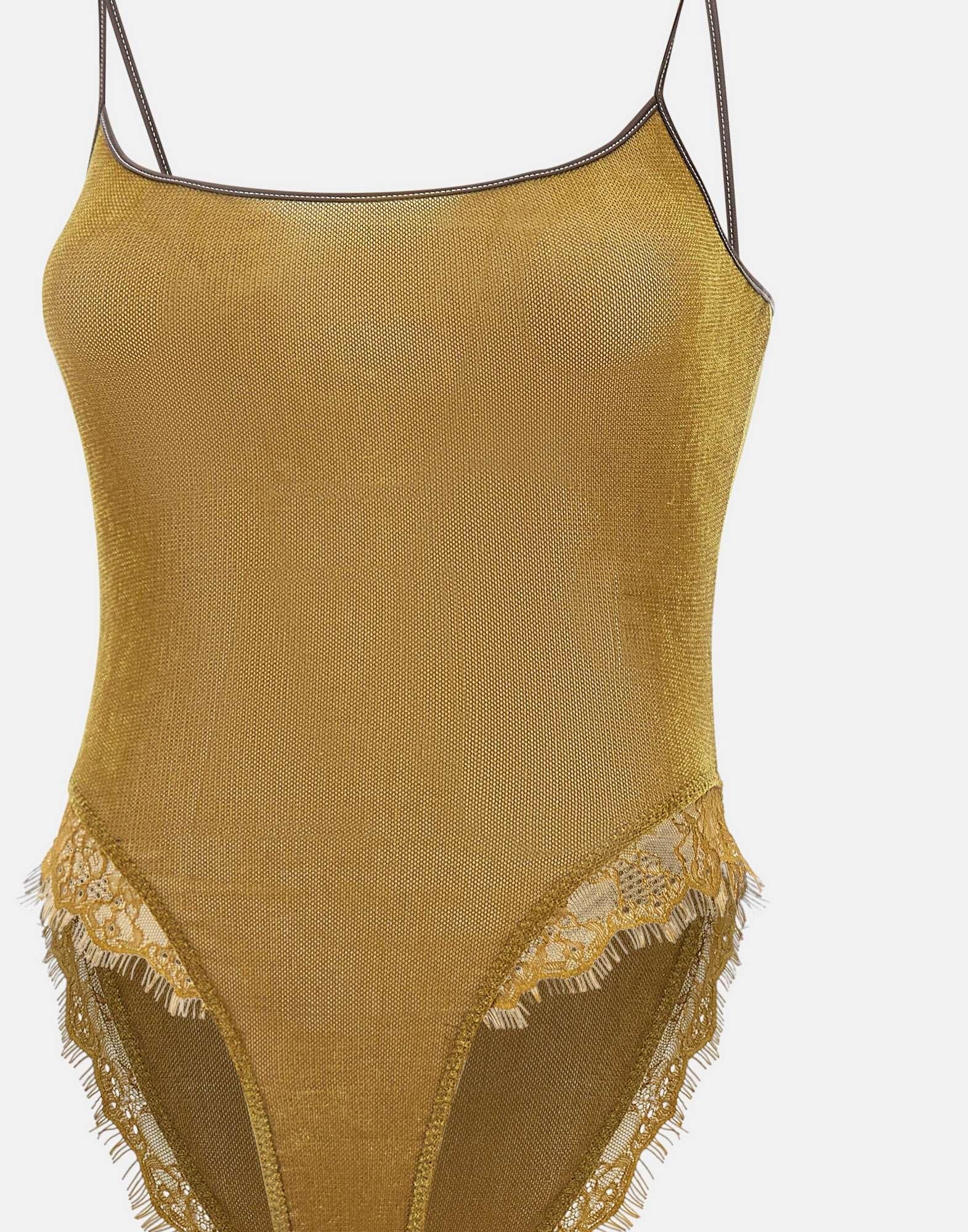 Body Jacques Wei "Olive Green Velvet Lace" realizzato in velluto verde oliva con raffinati bordi in pizzo e profili in pelle a contrasto. Il modello presenta bretelline sottili e una pratica chiusura con bottoncini al fondo. Una creazione dal fascino sensuale e sofisticato, con vestibilità regular, perfetta per look eleganti o da indossare come capo statement.