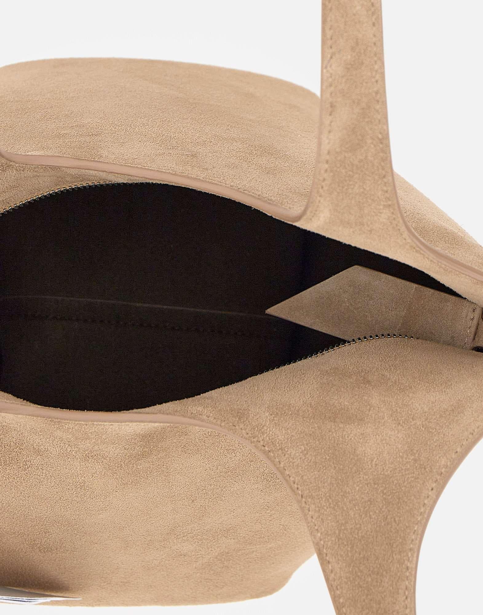 Borsa a spalla donna The Attico "La Scoop" realizzata in pelle scamosciata color tabacco, dal carattere deciso e contemporaneo. Il modello presenta una forma irregolare distintiva ed e dotato di chiusura zip monoscorrimento per una maggiore sicurezza. Completata da due manici superiori, e impreziosita dal logo impresso sul davanti e da un dettaglio metallico logato sul fondo, che ne rafforza l’identita iconica. Un accessorio di forte personalita, pensato per accompagnare look moderni e ricercati. Dimensioni: altezza 55 cm, larghezza 42 cm, profondita 26 cm. Made in Italy.