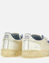 Sneakers Premiata donna "BSKT CLAYD 7515" in pelle liscia e trattamento used, ultraleggere, color crema e bianco con dettagli a contrasto blu avio, iconico logo laterale, lacci piatti in cotone con finalini colorati, fodera in morbida pelle, logo sulla linguetta, fori per la traspirazione, fussbet interno 28,3mm, suola con profilo a cassetta in gomma con serigrafia Premiata 2,5cm. Calzata regolare.