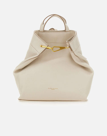 Zaino donna Gianni Chiarini "Zahara" realizzato in pelle martellata color avorio, pensato per unire funzionalità e stile. Dotato di doppio manico per portarlo a mano e spallacci regolabili con fibbie dorate. La chiusura superiore con bottone a pulsante apre su un interno essenziale con tasca applicata, mentre sul retro è presente una tasca laterale con zip. Il maxi gancio dorato laterale, una volta chiuso, trasforma il design dello zaino con un dettaglio distintivo. Logo stampato sul fondo della parte frontale. Made in Italy. Dimensioni: 31x34x12 cm.
