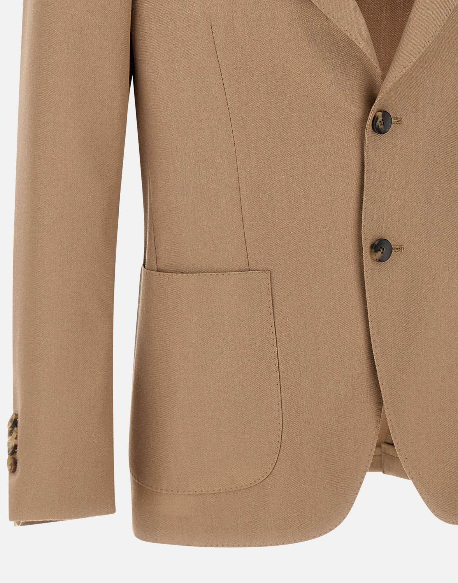 Blazer uomo Lardini in lana, cashmere e seta, beige sabbia, collo con rever classico a lancia e spilletta iconica, chiusura con due bottoni, due tasche anteriori, taschino sul petto, polsini con quattro bottoni, sfoderata, due spacchetti laterali posteriori, vestibilità regolare con spalla naturale dall'aspetto rotondo. Made in Italy.