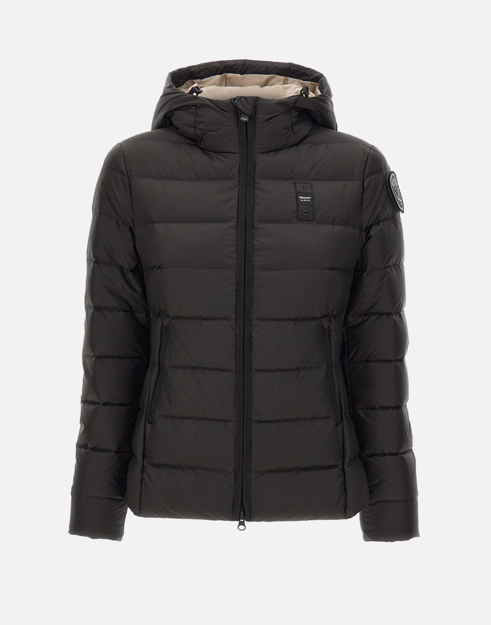 Blauer "Charme", nero, unisce estetica fashion e performance tecniche. Realizzato in nylon lucido idrorepellente, è trapuntato a righe orizzontali e imbottito in piuma 90/10 da 160 g, che assicura calore leggero e non ingombrante. Il design femminile con taglio slim fit che valorizza il punto vita è completato da cappuccio fisso con coulisse, chiusura a zip nascosta a due vie con copri-cursore, tasche anteriori con zip e tasche interne con velcro e zip. I dettagli come la fodera in nylon a contrasto colore, la coulisse regolabile sul fondo e il patch glitterato con passante logo confermano lo stile ricercato del brand.