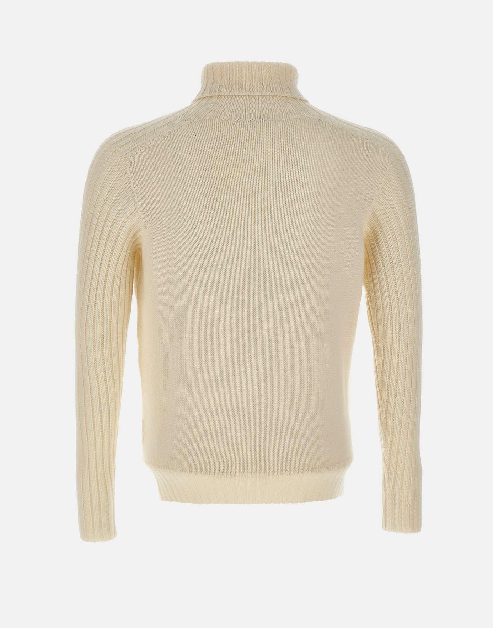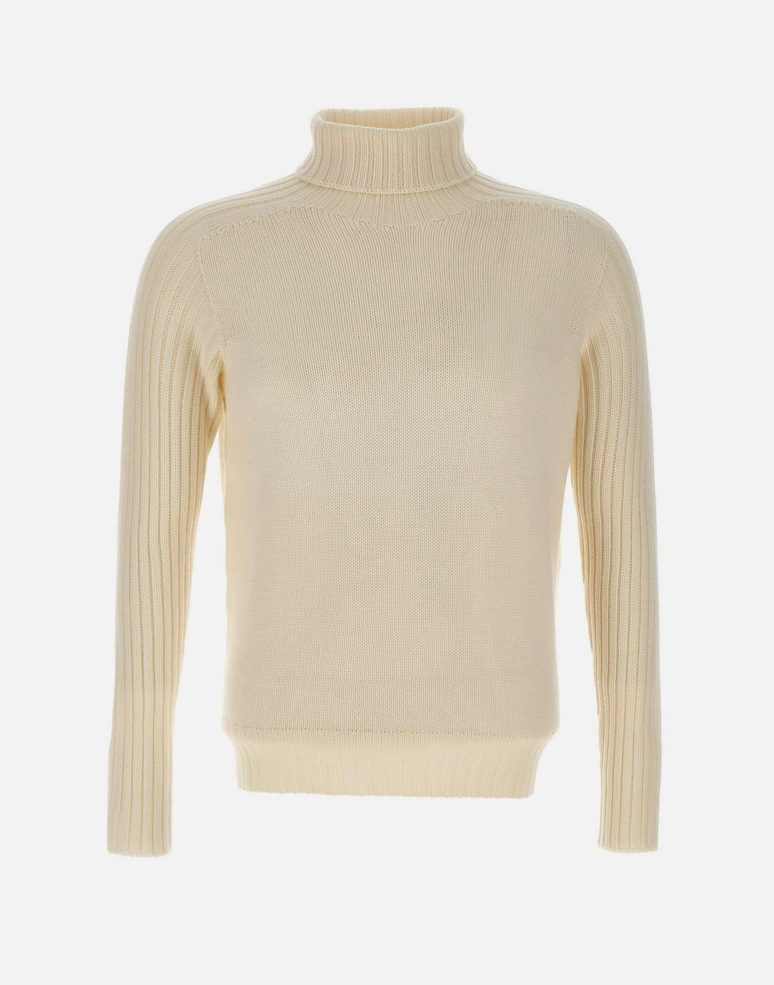 Maglione Gran Sasso color latte, appartenente alla Luxury Collection, realizzato in pregiata Rain Wool con trattamento Teflon che rende il filato idrorepellente e resistente all'umidità. Il modello presenta collo alto, maniche lunghe e bordi a costine per una linea elegante e confortevole. Un capo raffinato, ideale per la stagione fredda. Regular fit. Made in Italy.