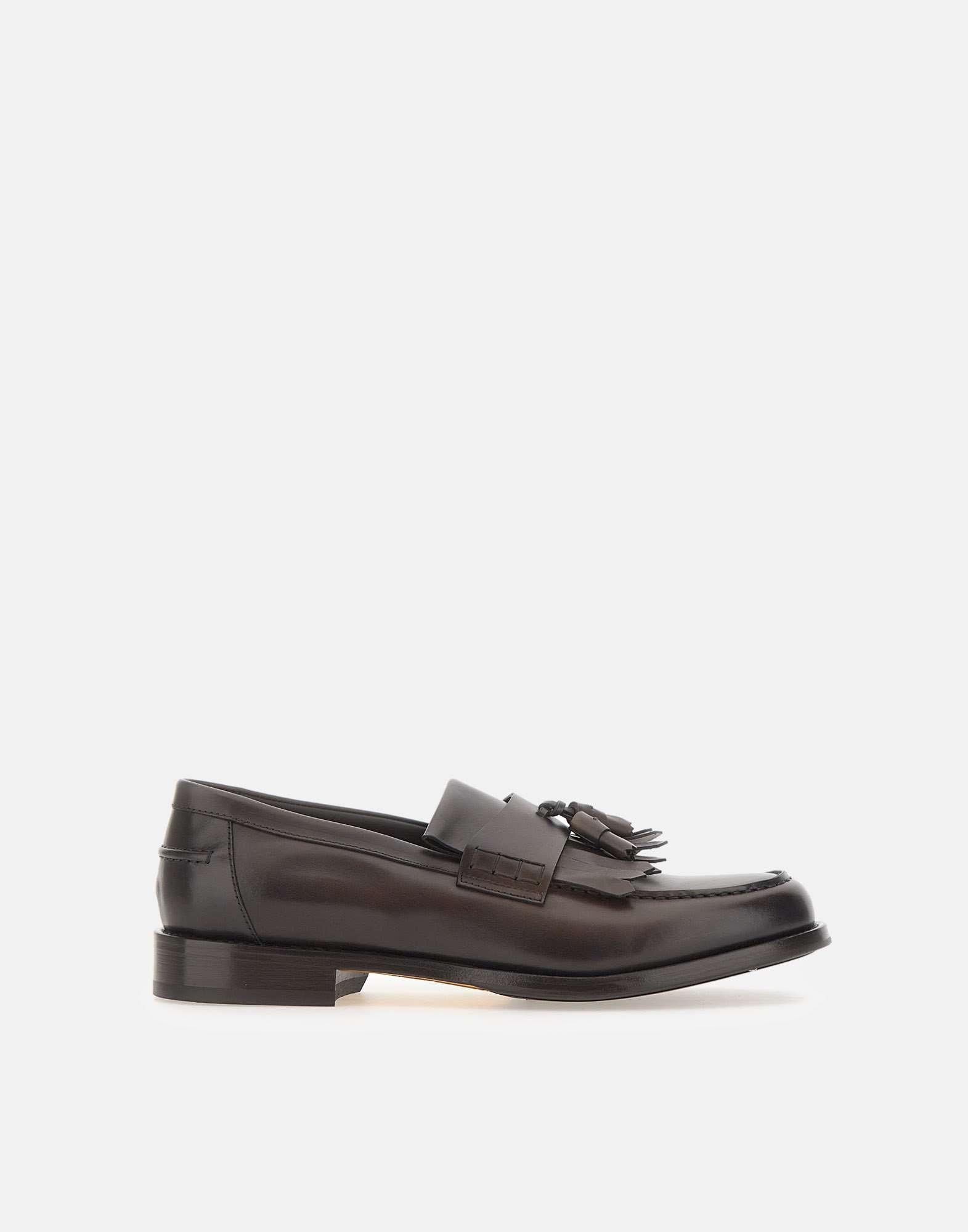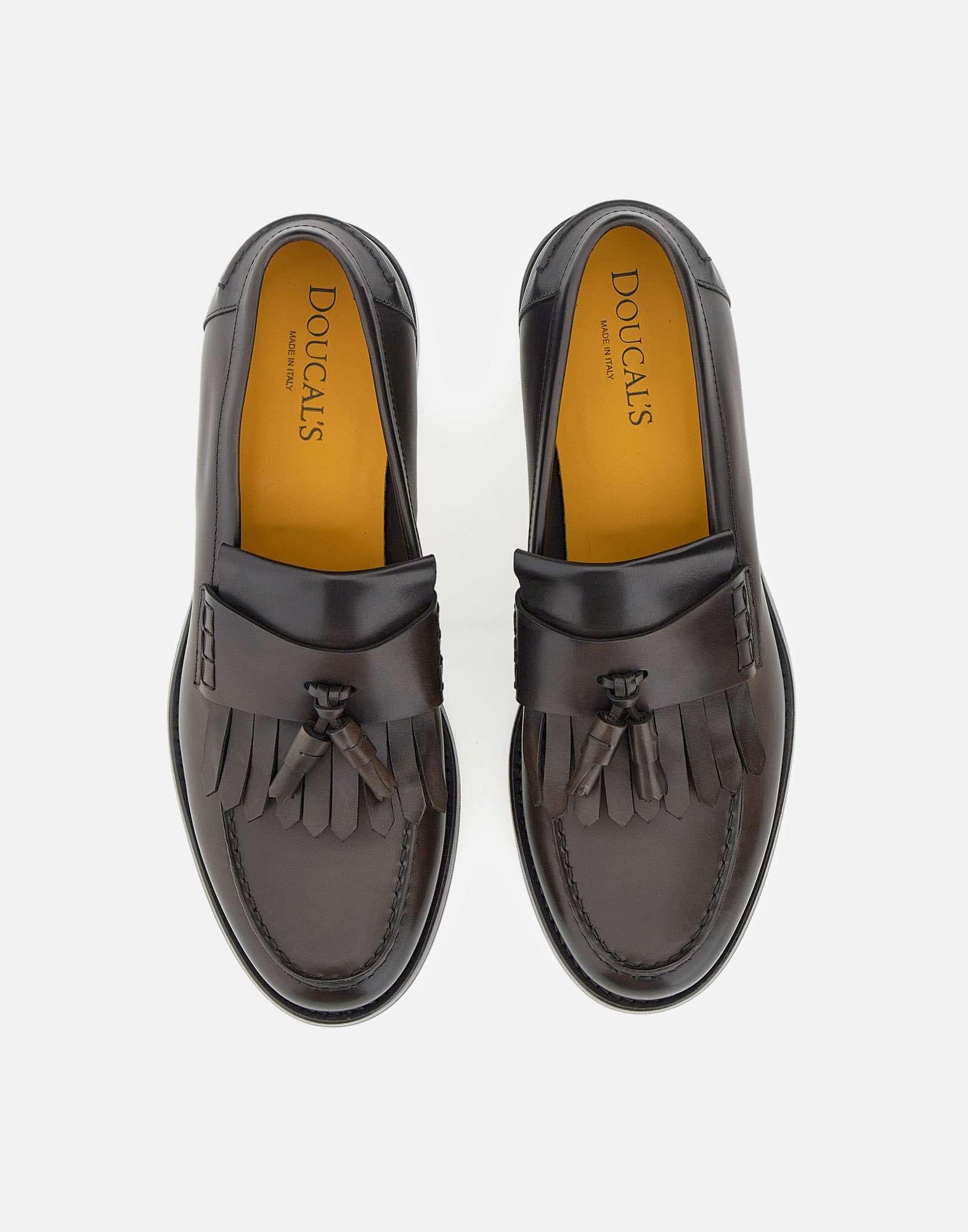 Mocassini Doucal’s "Decò" realizzati in pelle liscia color testa di moro, impreziositi da nappine decorative e impunture a contrasto che ne sottolineano l’artigianalità. La soletta logata, la suola in cuoio e gomma tono su tono e la calzata regolare garantiscono comfort e durata. Un modello elegante e senza tempo, simbolo della maestria calzaturiera italiana.