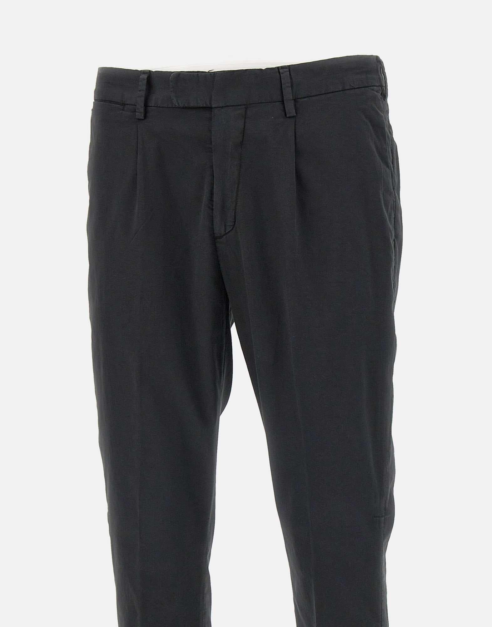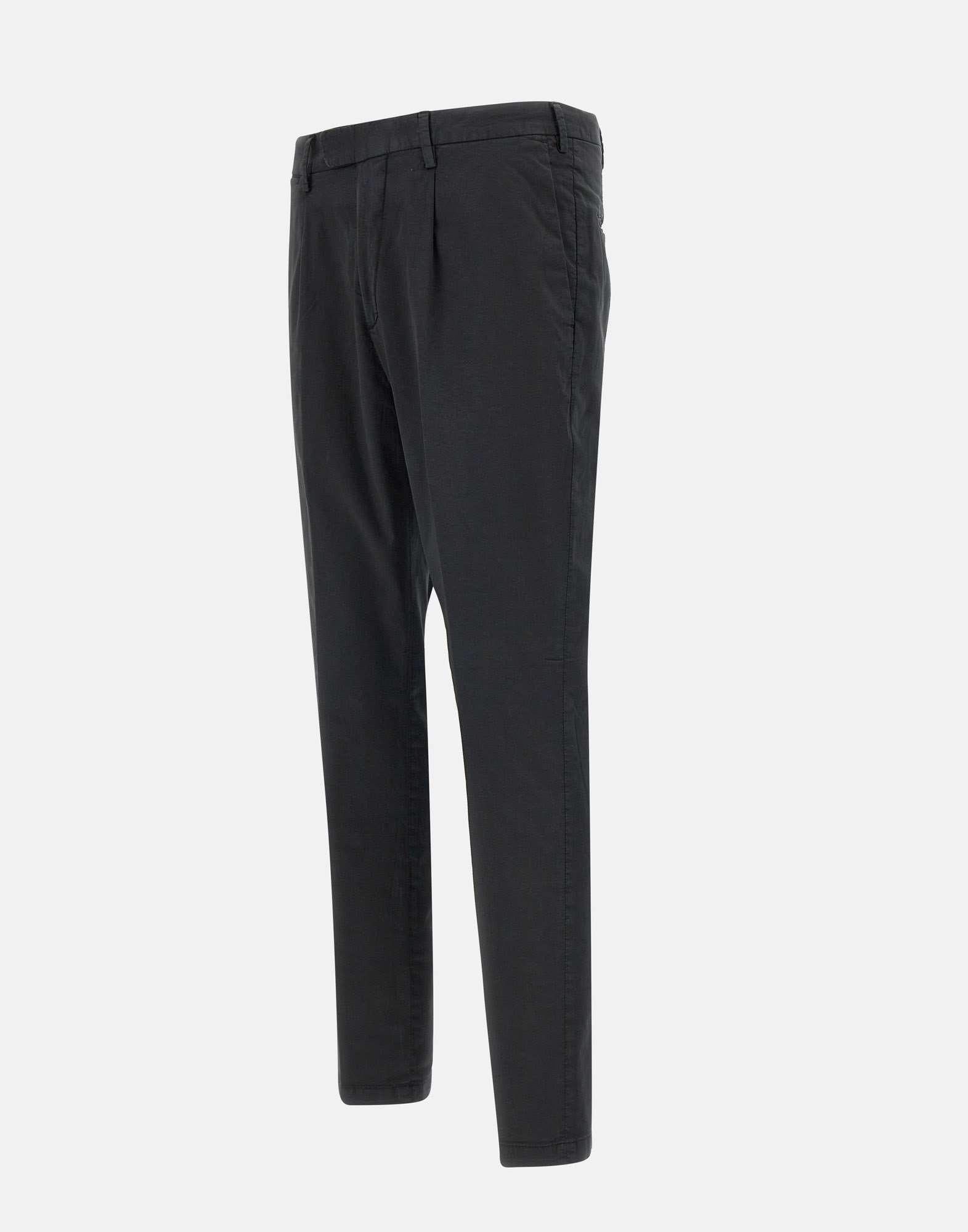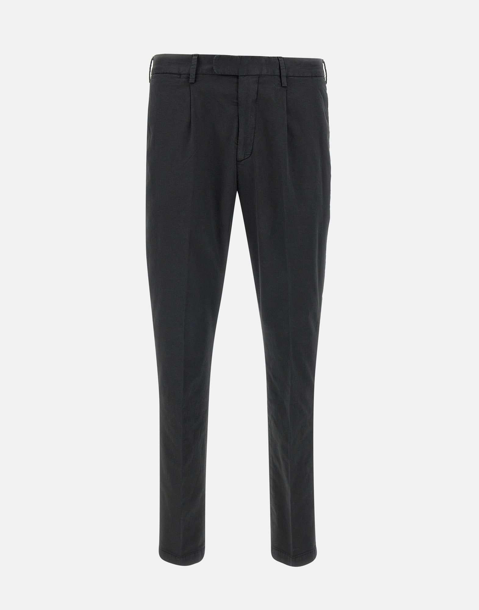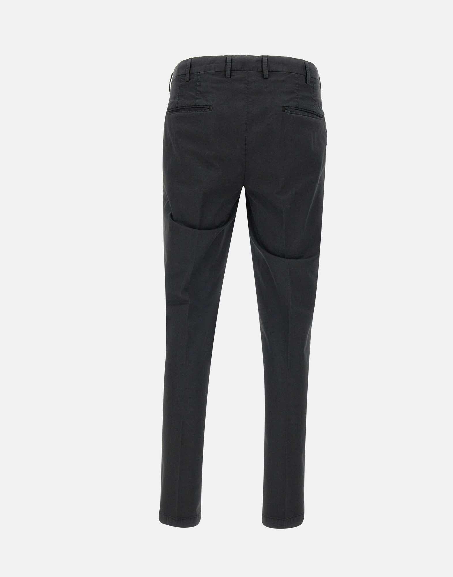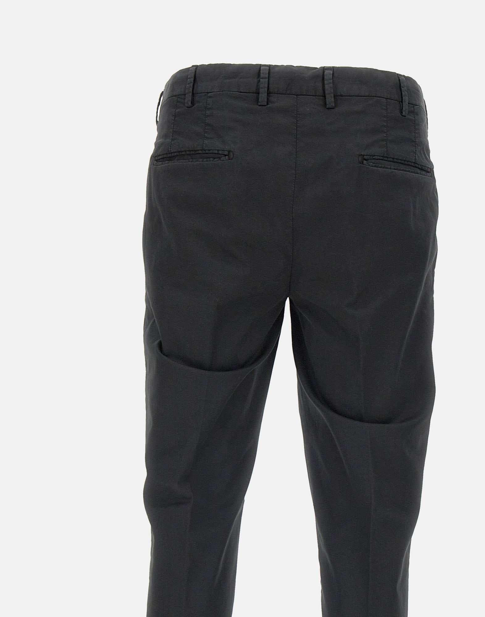 Pantaloni uomo "Chino" Devore Incipit in cotone pima superior e seta, colore nero, tecnologia Flexowaist System che conferisce una variabilità dell'indosso in vita conferendo dove occorre una taglia in più, chiusura con bottoni in corno naturale del Sudan e zip, vita regolare con passanti per cintura, tasche laterali, tasche monofiletto sul retro, slim fit. Made in Italy.