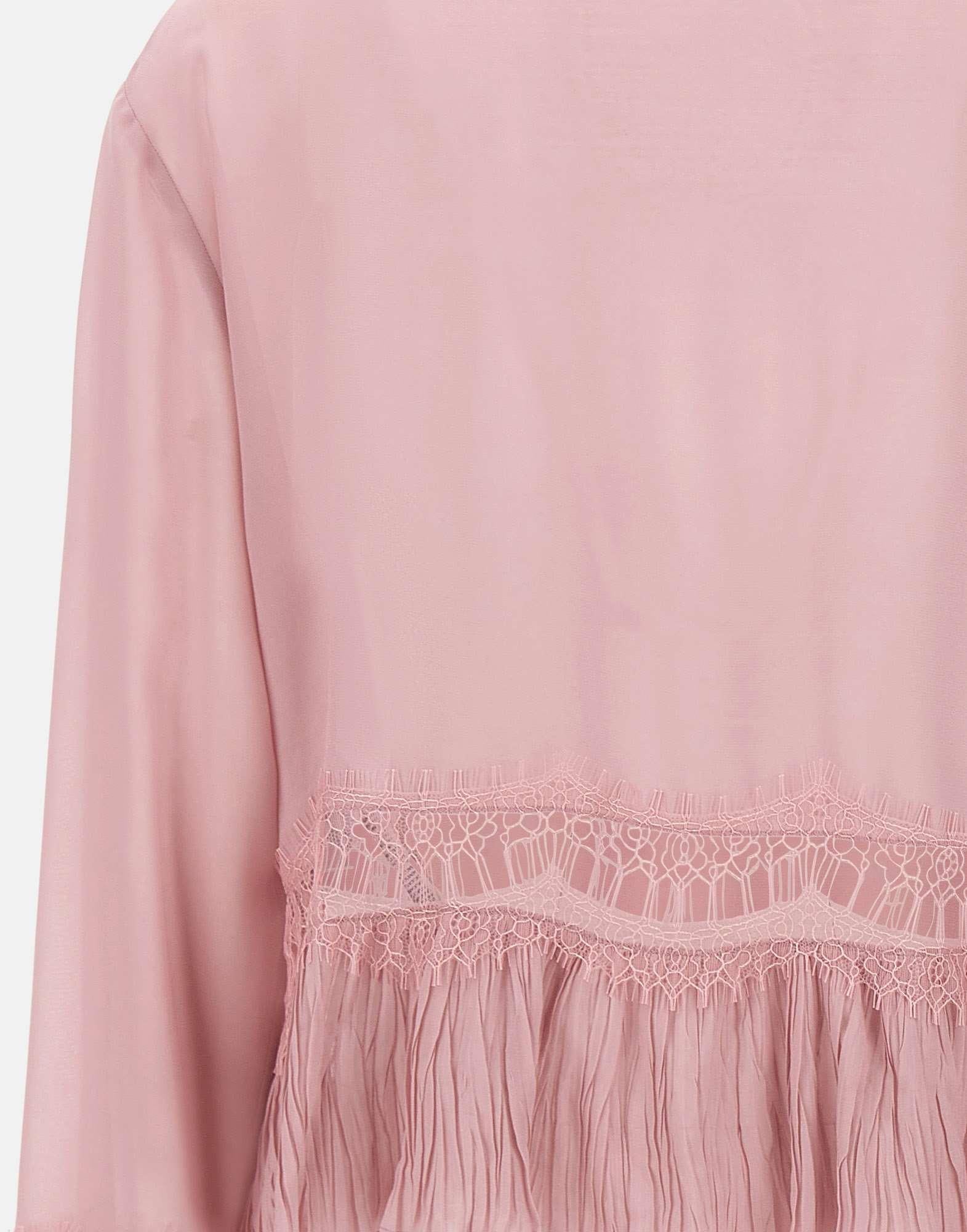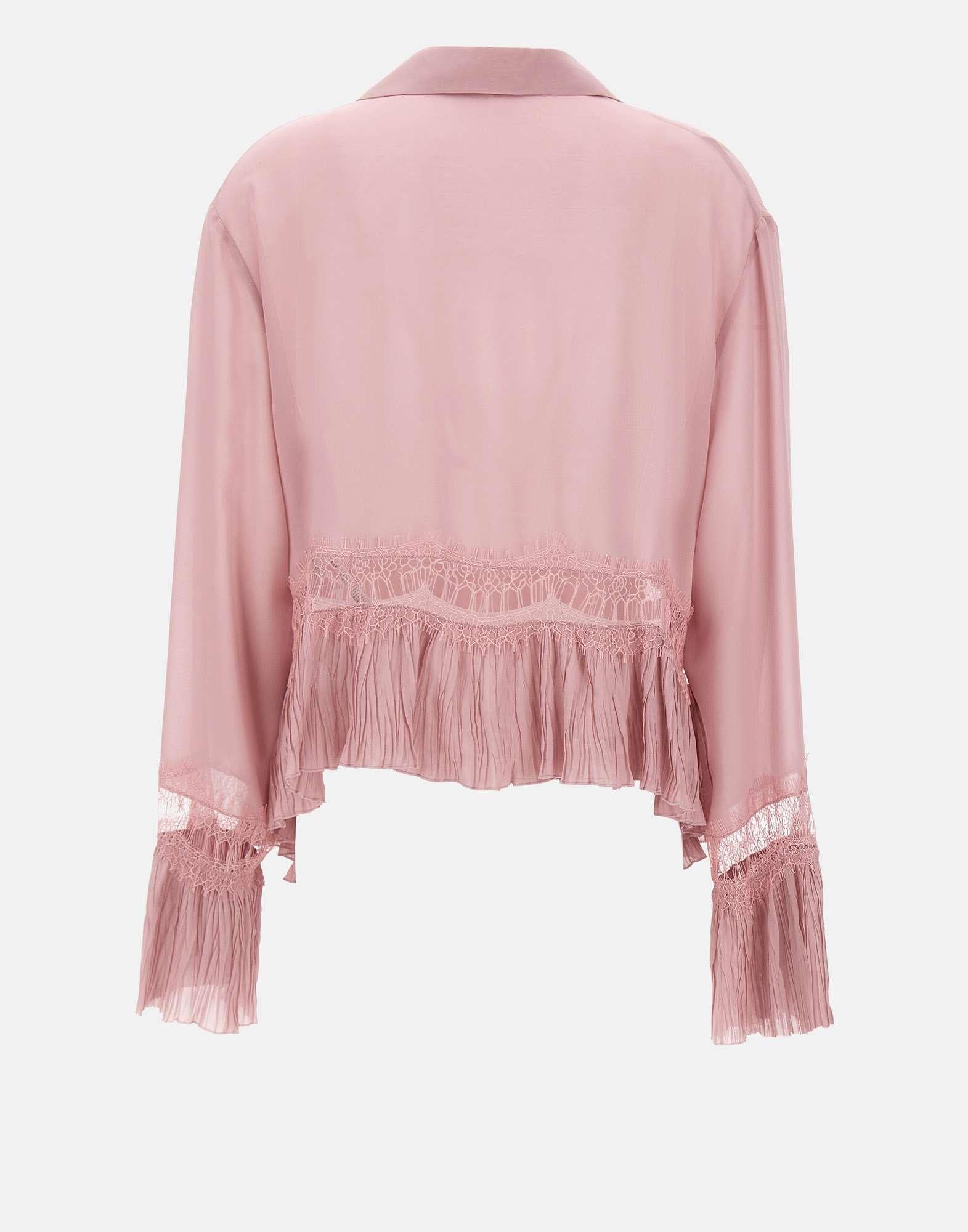 Blusa donna Blumarine realizzata in georgette di viscosa color rosa semi trasparente, impreziosita da inserti in pizzo per un effetto delicato e femminile. Presenta collo a camicia e chiusura frontale con due lacci sottili. Le maniche lunghe sono completate da polsini ampi e plissettati. Il design asimmetrico è definito da orlo plissettato, piu lungo e a punta sul davanti, per una linea fluida e leggera. Vestibilità rilassata. Made in Italy.