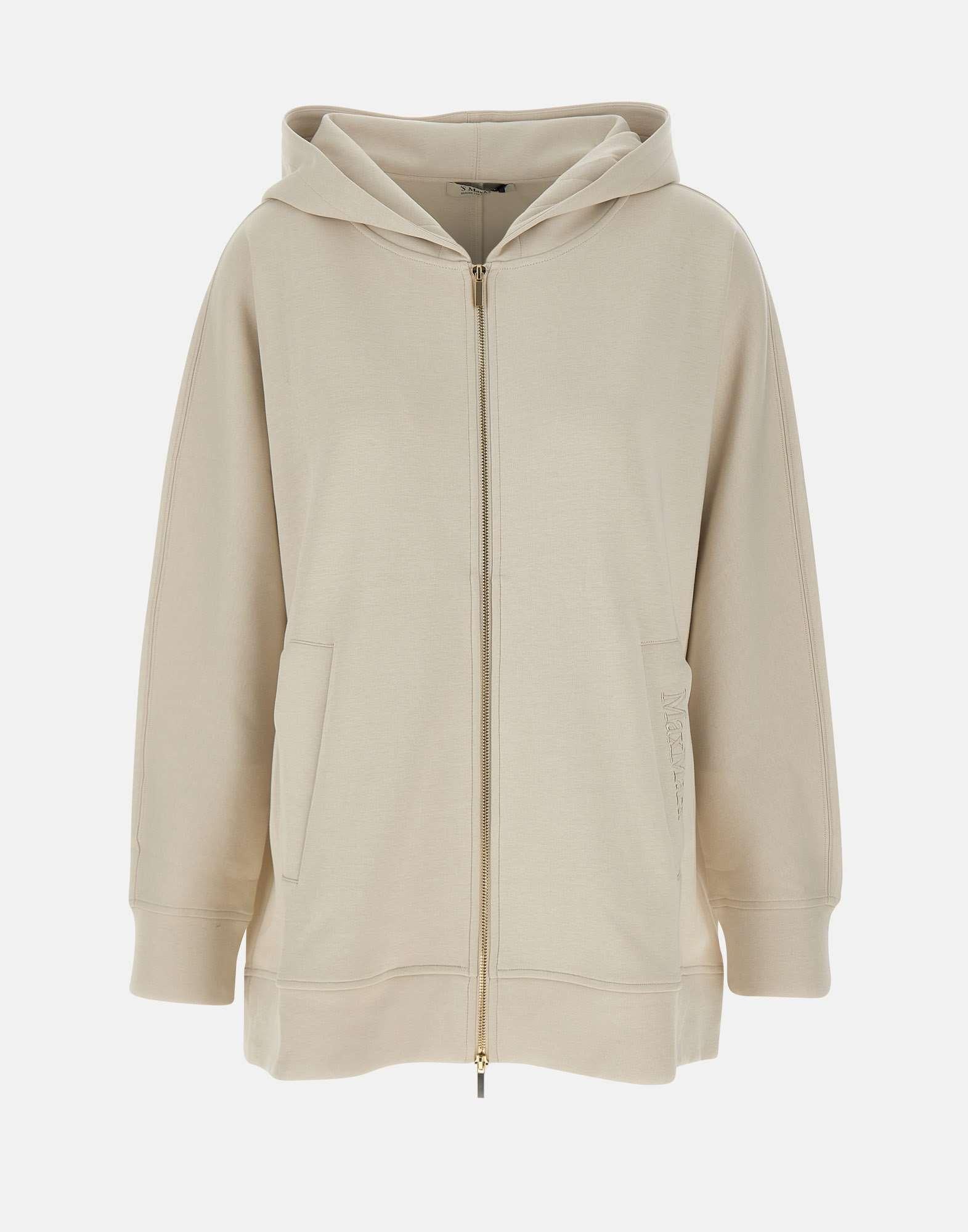 Felpa "Verbano" 'S Max Mara, ghiaccio, in jersey di cotone, maniche lunghe a kimono, cappuccio, chiusura frontale con zip a due vie oro, tasche a filettone sui fianchi, logo Max Mara ricamato in tono sulla tasca sinistra, interno garzato, vestibilità oversize.