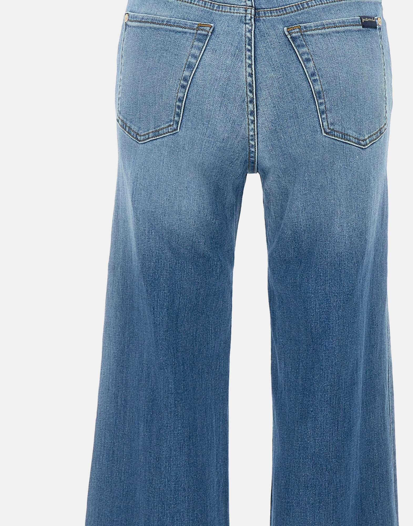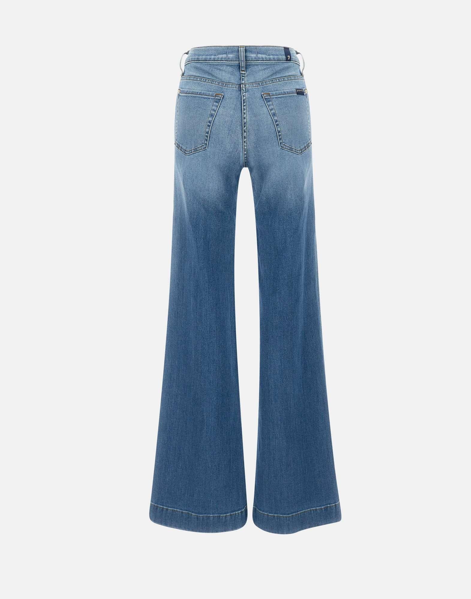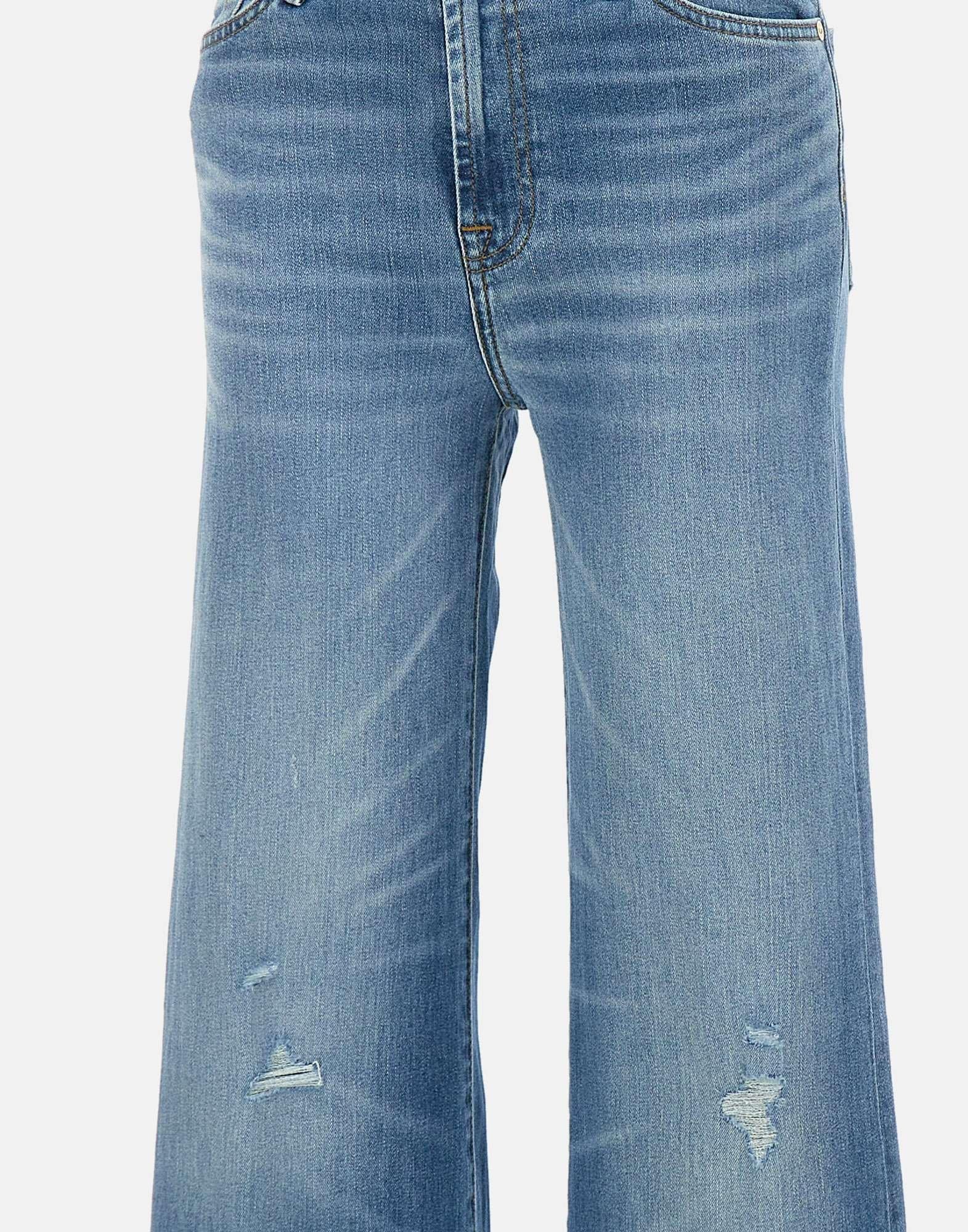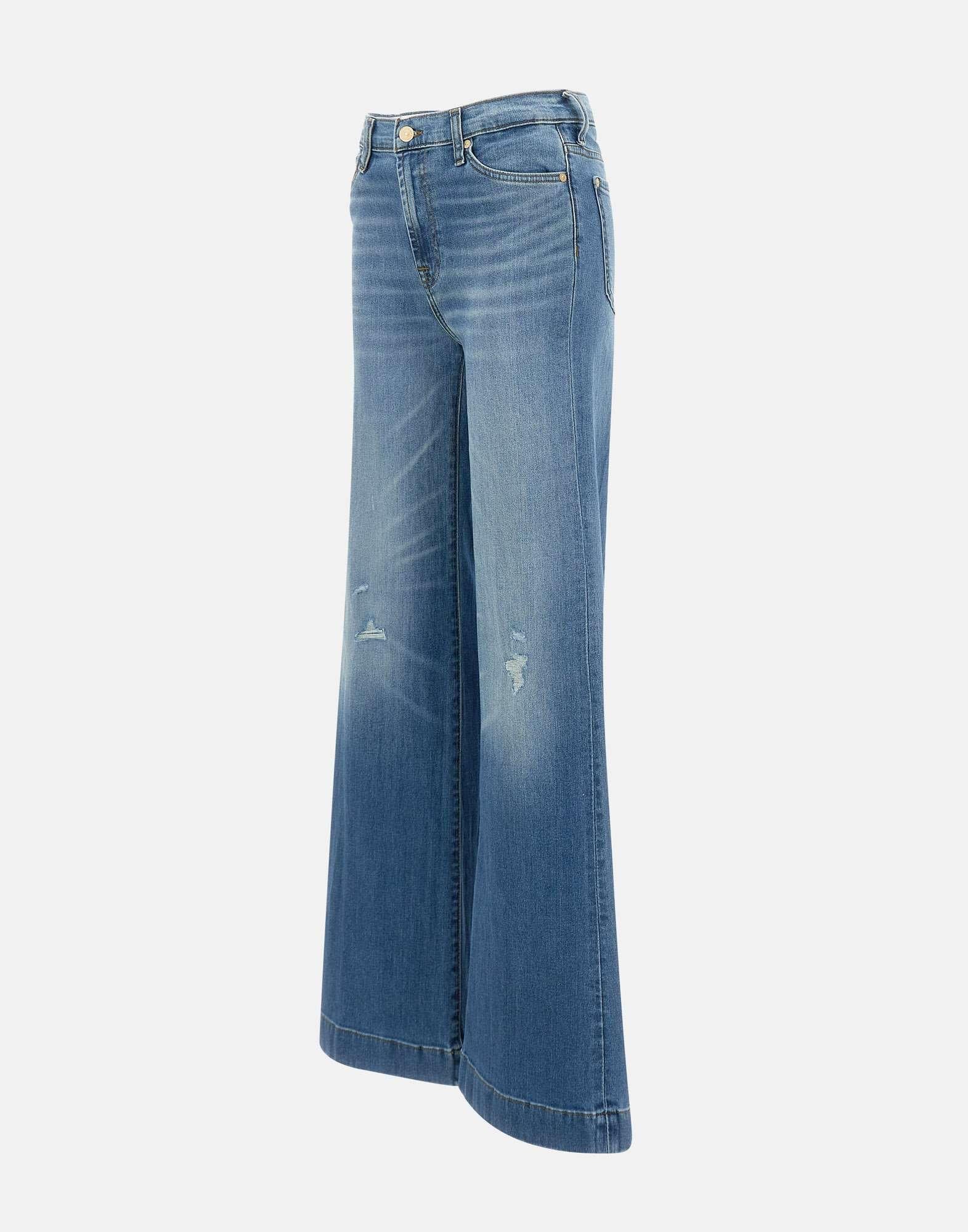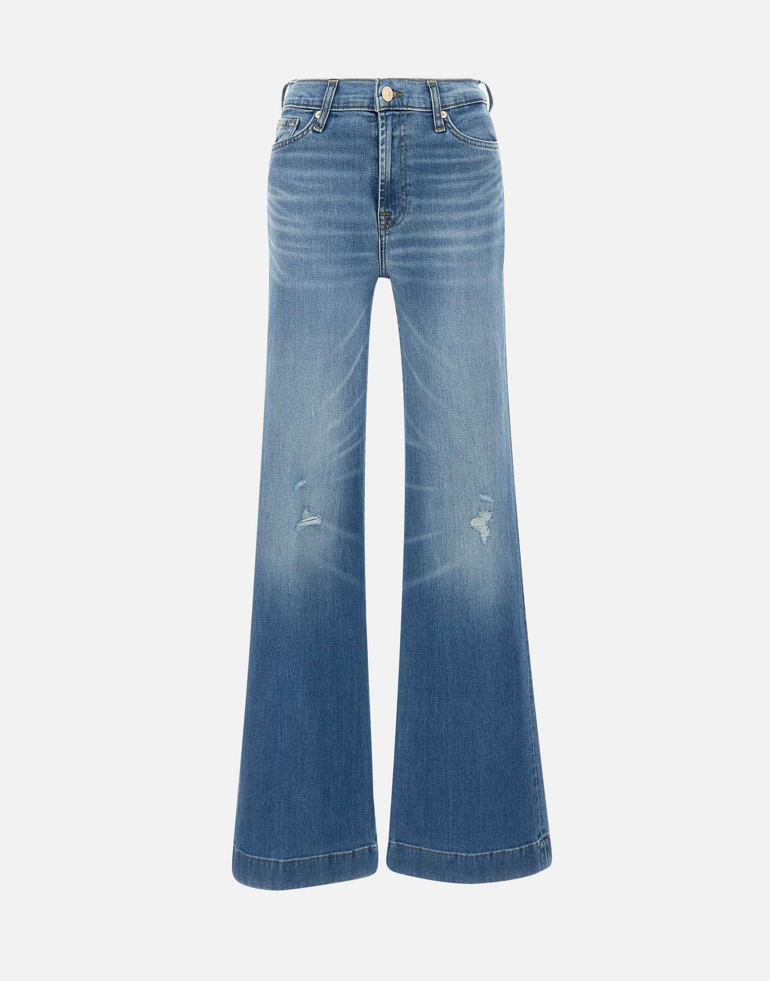 Jeans "Modern Dojo" 7ForAllMankind, blu chiaro, wash mimosa, cinque tasche, chiusura con bottone logato e zip, dettagli destroyed, passanti per cintura, gamba dritta e ampia con fondo 27cm e bordo cucito 5cm, etichetta logo sul retro, slim illusion fit