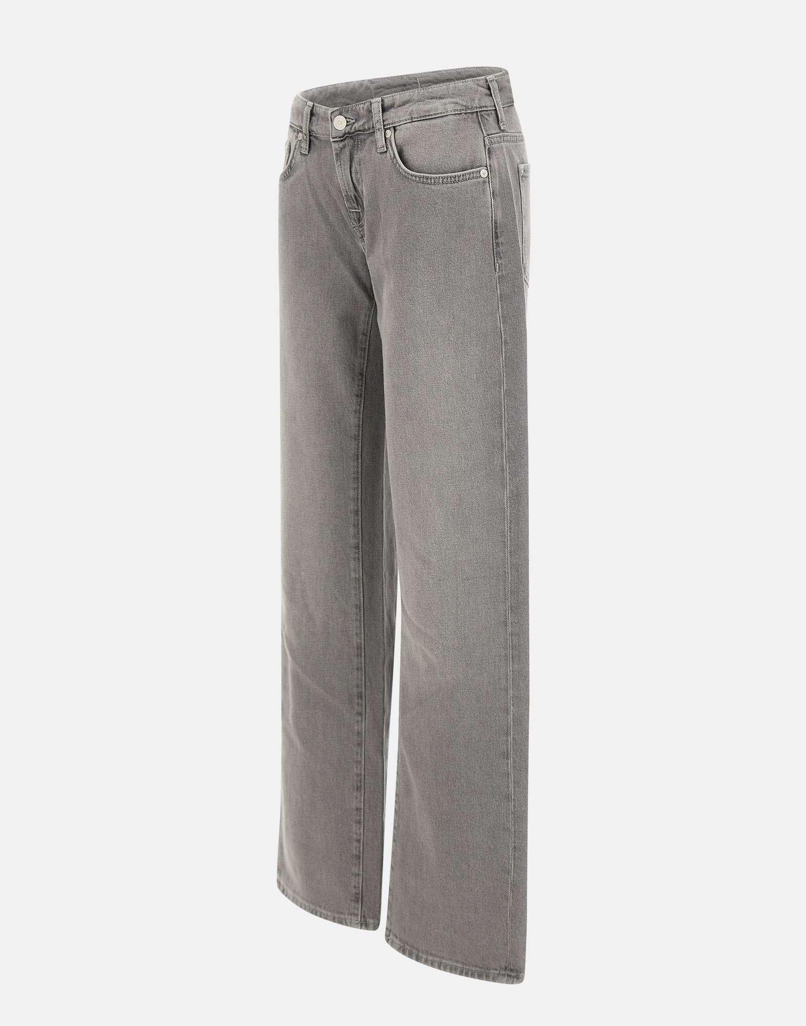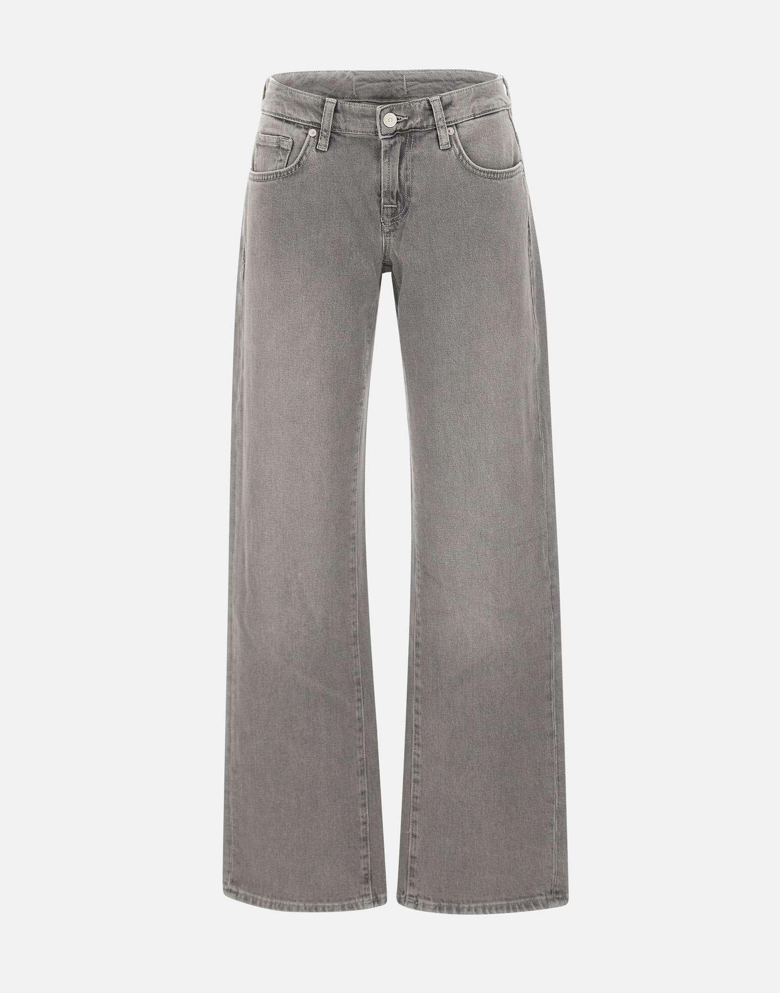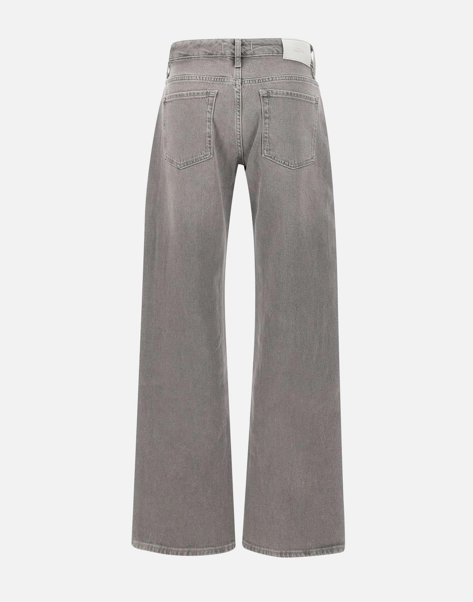 in cotone grigio sbiadito, caratterizzati da una silhouette rilassata a vita bassa con gamba dritta classica che mantiene la forma offrendo al tempo stesso comfort. Il modello presenta struttura a cinque tasche, chiusura con zip e bottone e passante logato bianco. Un denim versatile e contemporaneo, ideale per look quotidiani dal carattere moderno. Ampiezza fondo: 24cm. Made in Italy.
