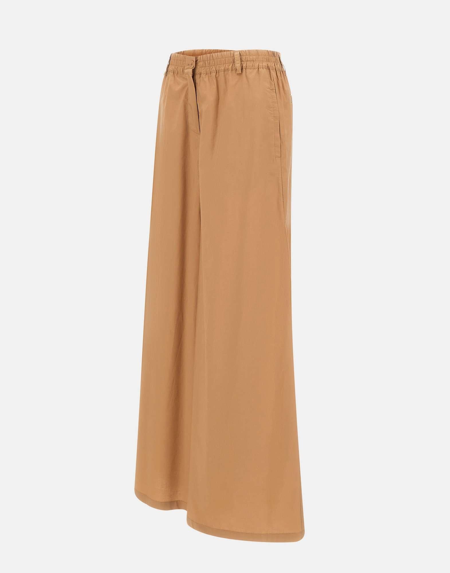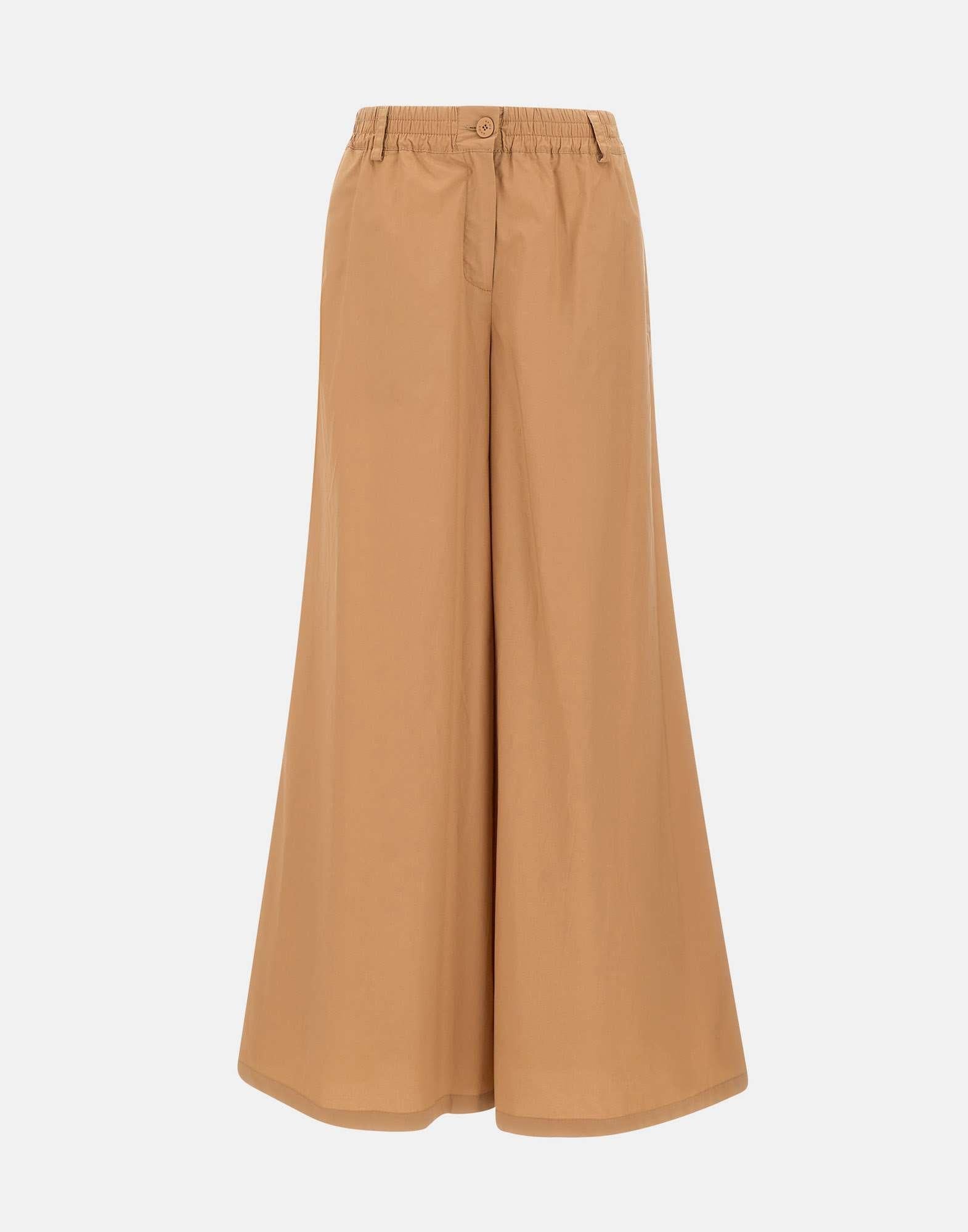 Pantaloni donna Kaos realizzati in cotone color cammello, dal taglio palazzo elegante e contemporaneo. Il modello presenta vita elasticizzata con passanti per cintura, pensata per un comfort ottimale e una vestibilità versatile. Rifiniti con tasche anteriori e posteriori a filetto, si chiudono con zip nascosta da patta e bottone logato per un finish pulito. Ampiezza fondo 48 cm. Vestibilità regolare. Made in Italy.