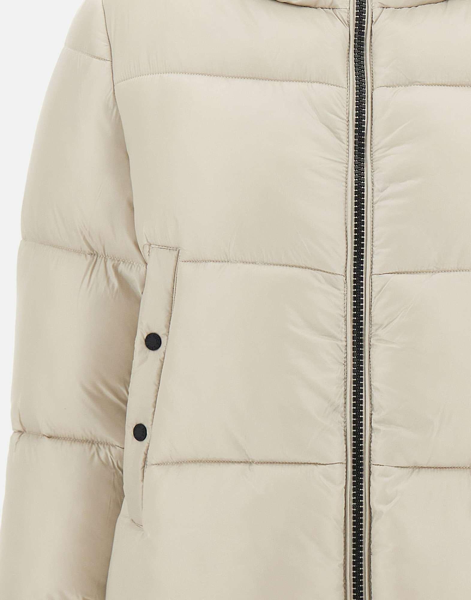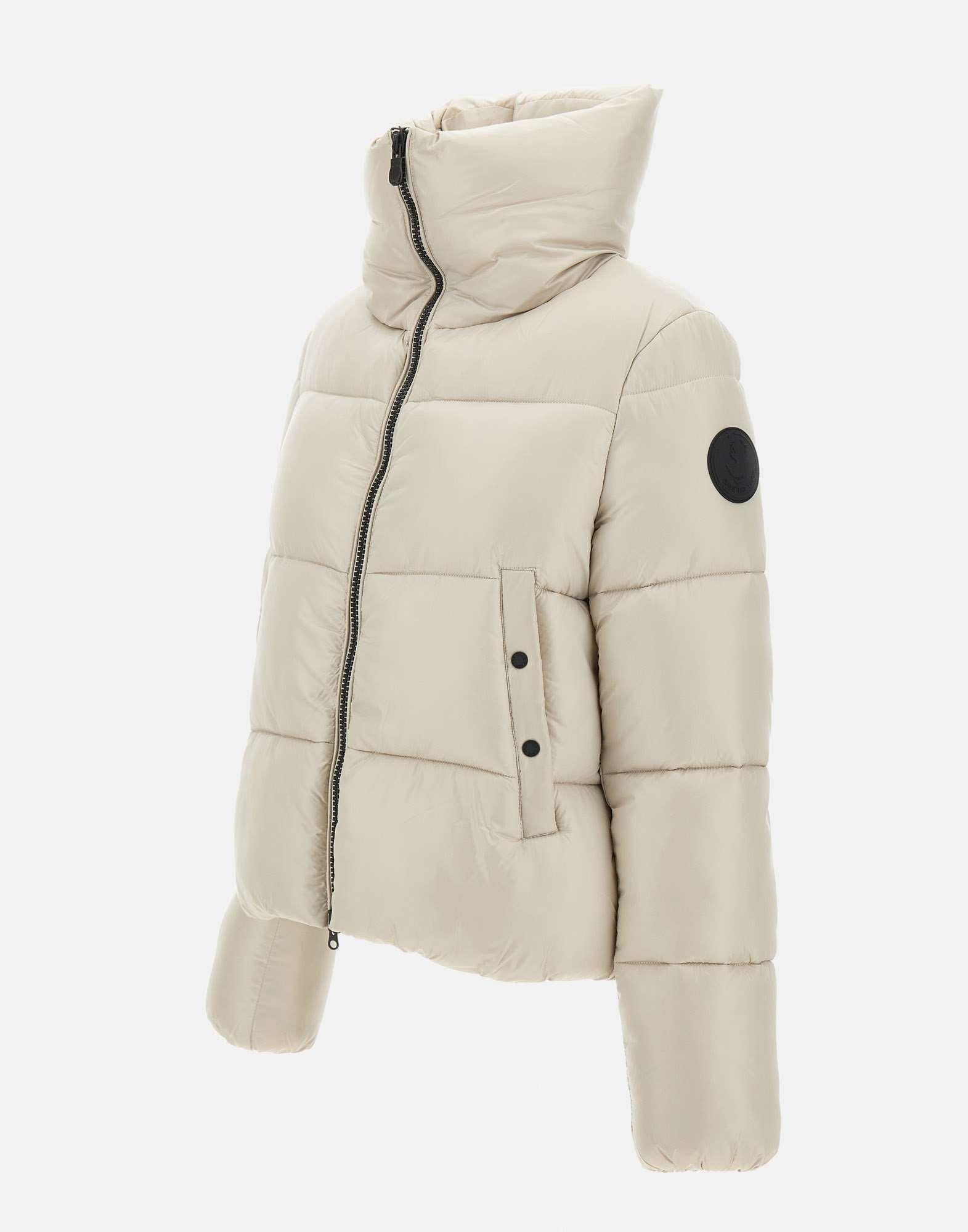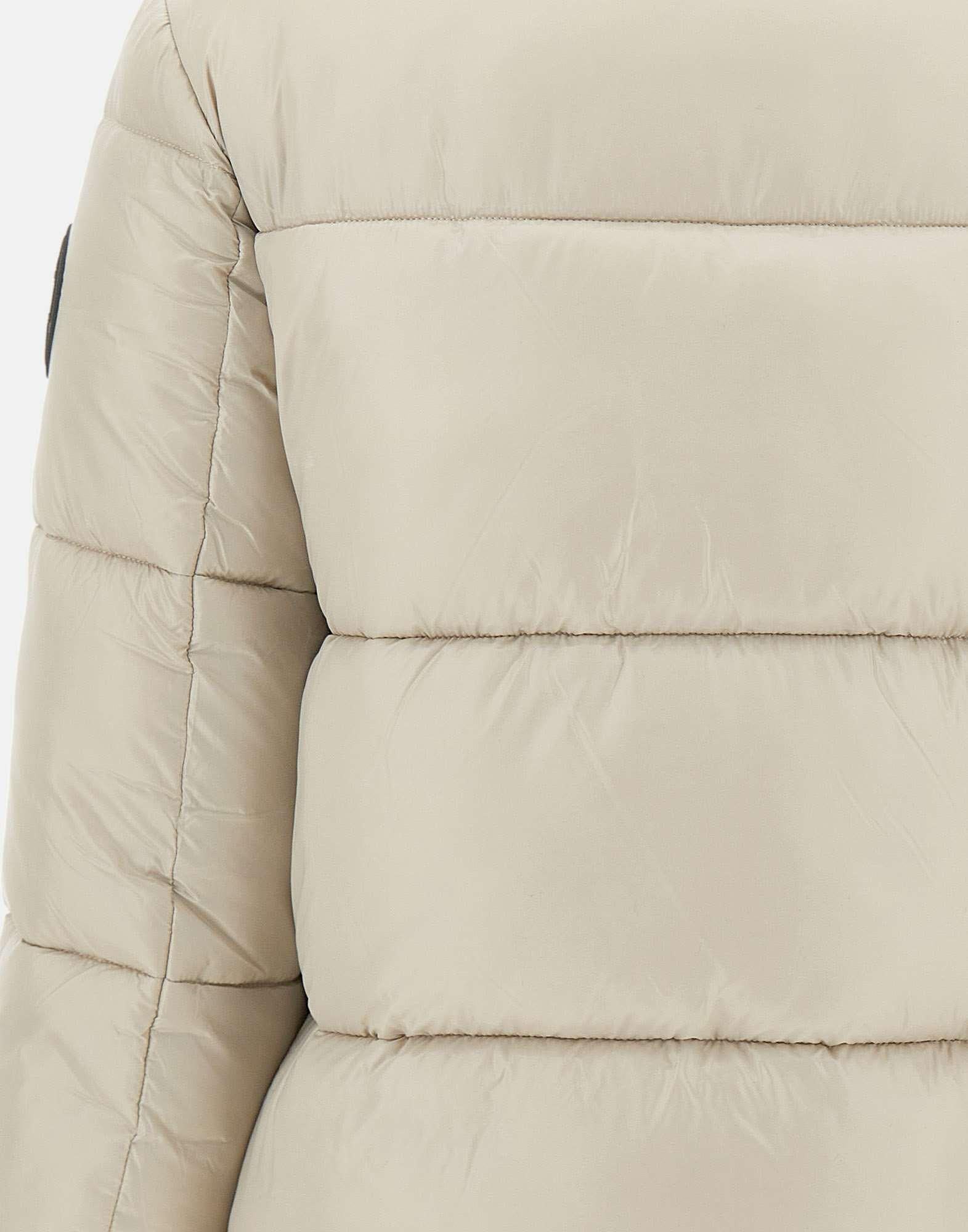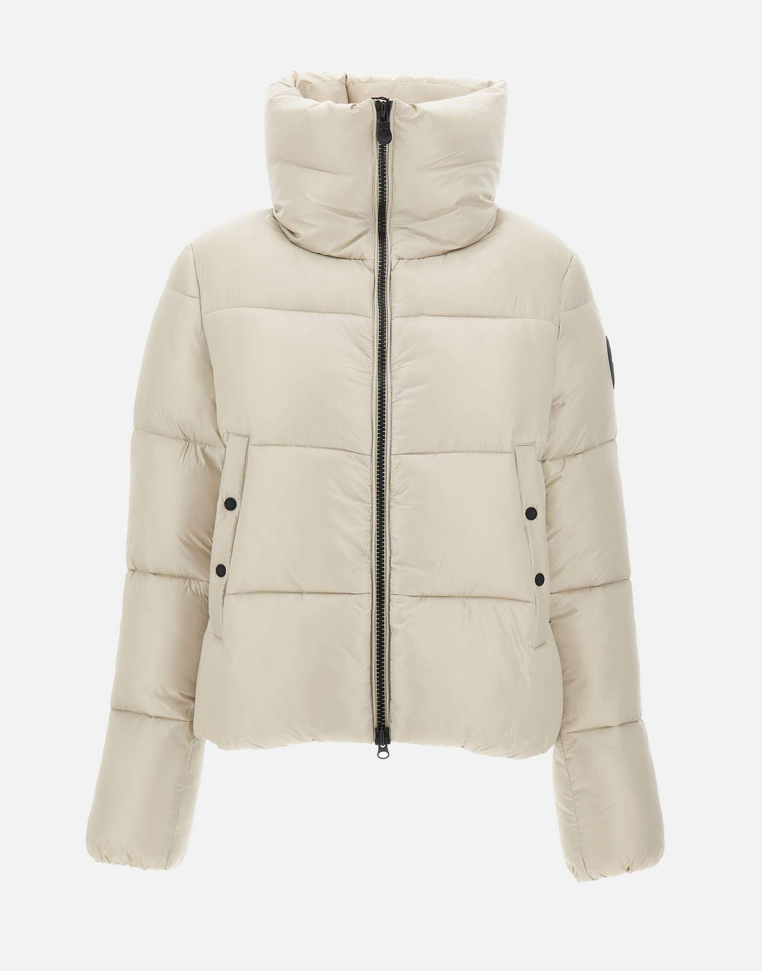 Piumino donna Save The Duck "Isla" in nylon riciclato colo avorio, leggero e compatto, con mano morbida e rotonda. La costruzione ad alta densità garantisce ottime performance antivento, mentre il finissaggio dona un aspetto luminoso e una finitura laqué dal carattere contemporaneo. Questo piumino donna animal free presenta collo alto avvolgente per proteggere dal freddo, zip centrale e tasche con bottoni neri a contrasto. Completano il design il tirazip personalizzato e il logo rotondo sulla manica. Taglio corto e vestibilità regolare, ideale per look invernali versatili in chiave luxury boutique italiana.