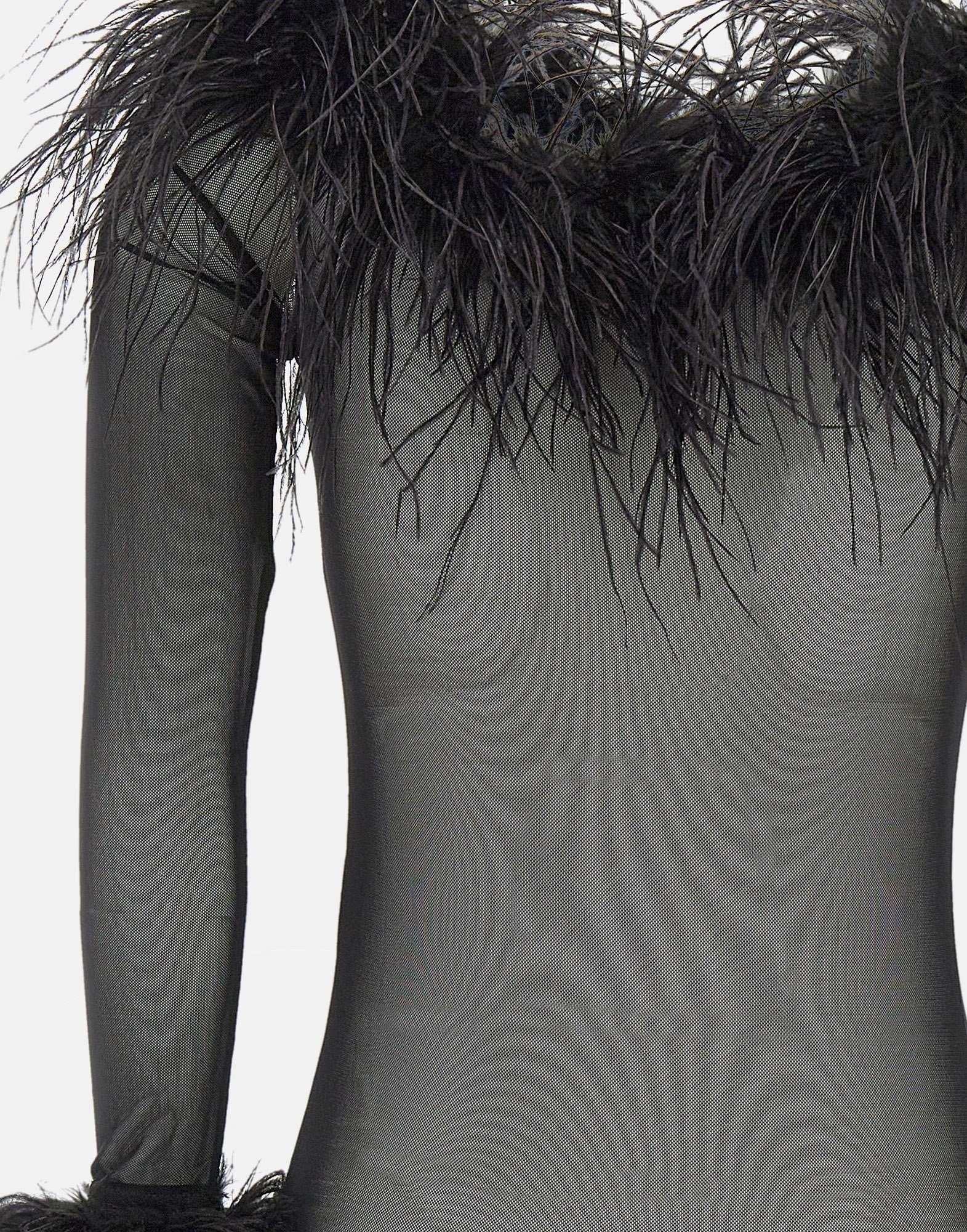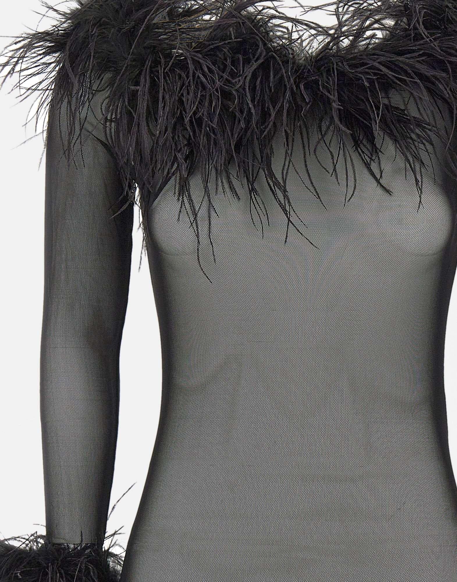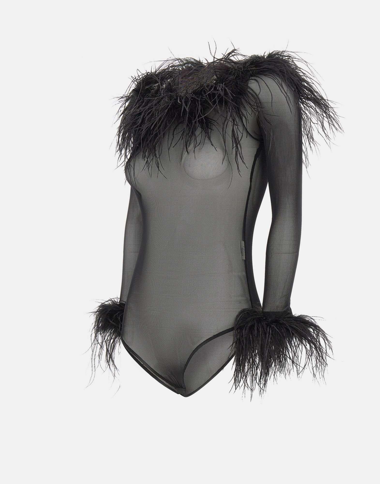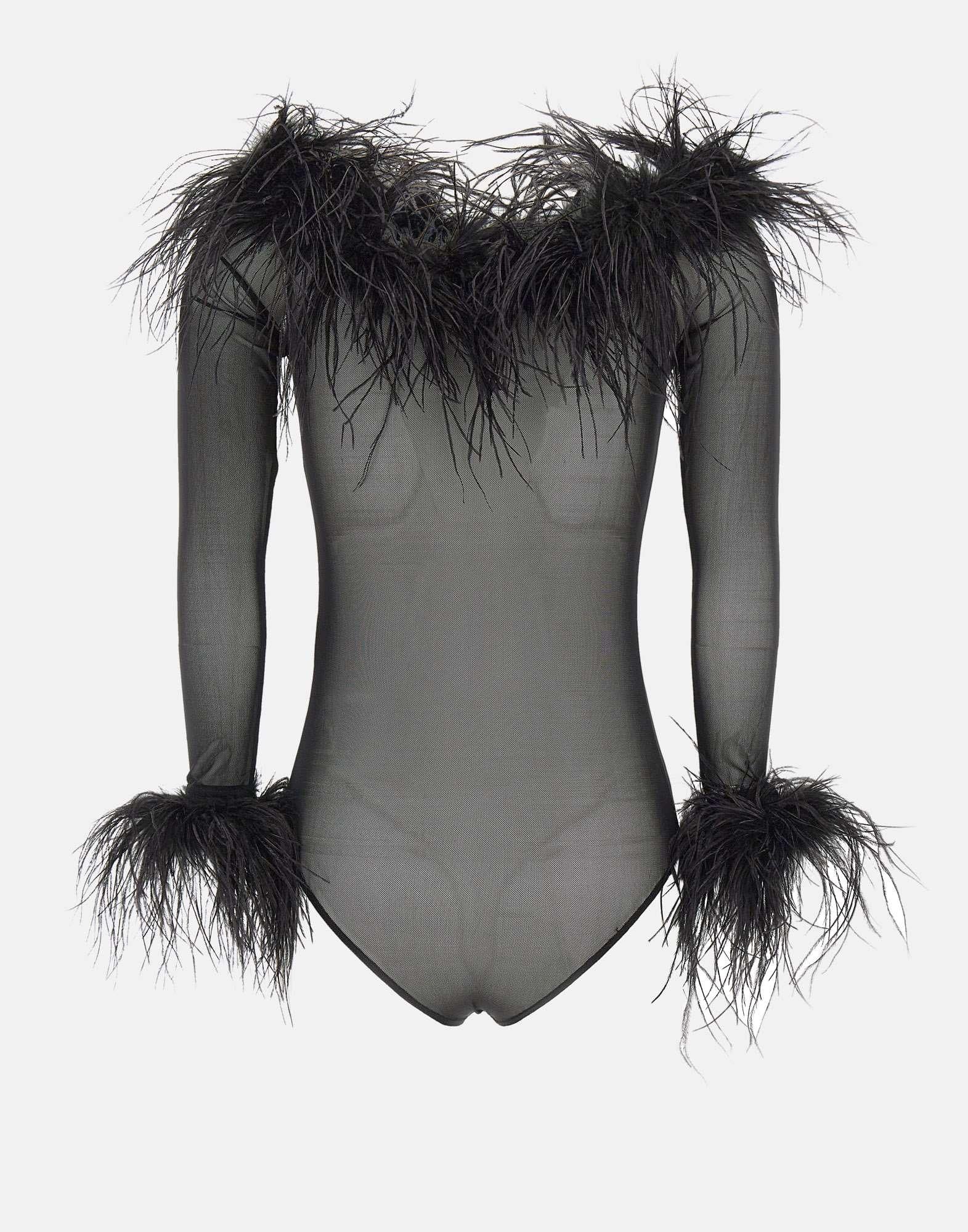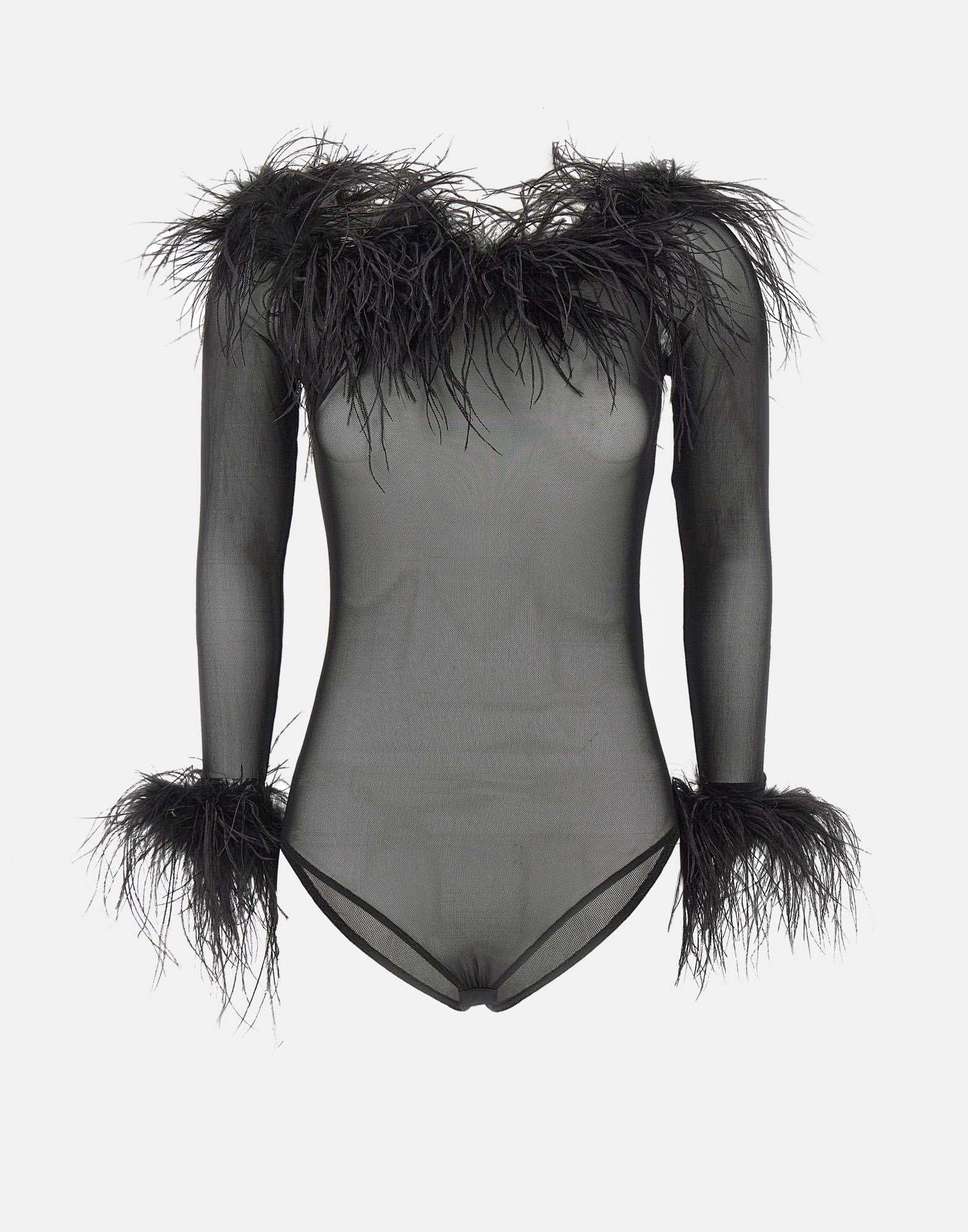 Il body "Zuben" di Twentyfourhaitch, in tulle elasticizzato nero, esprime uneleganza essenziale e sofisticata. La silhouette aderente valorizza le forme con uno scollo a barca e maniche lunghe, mentre i bordi impreziositi da piume removibili fissate con bottoni invisibili aggiungono un tocco scenografico e versatile. La chiusura al fondo classica garantisce comfort e praticità. Slim fit.