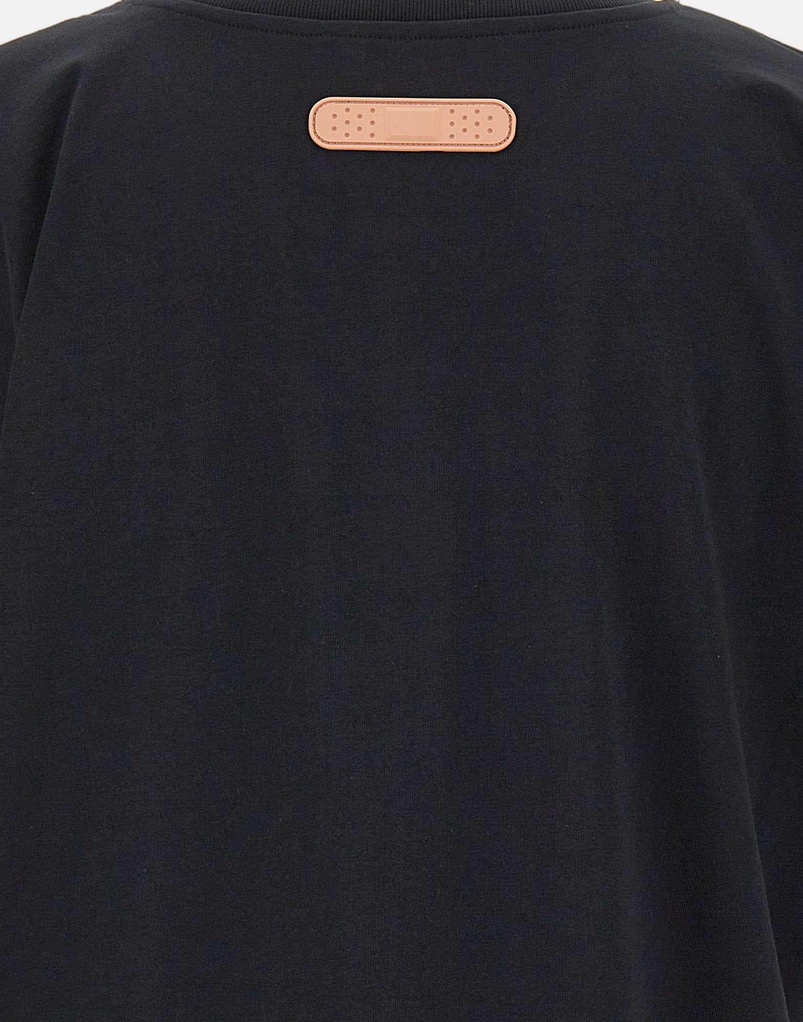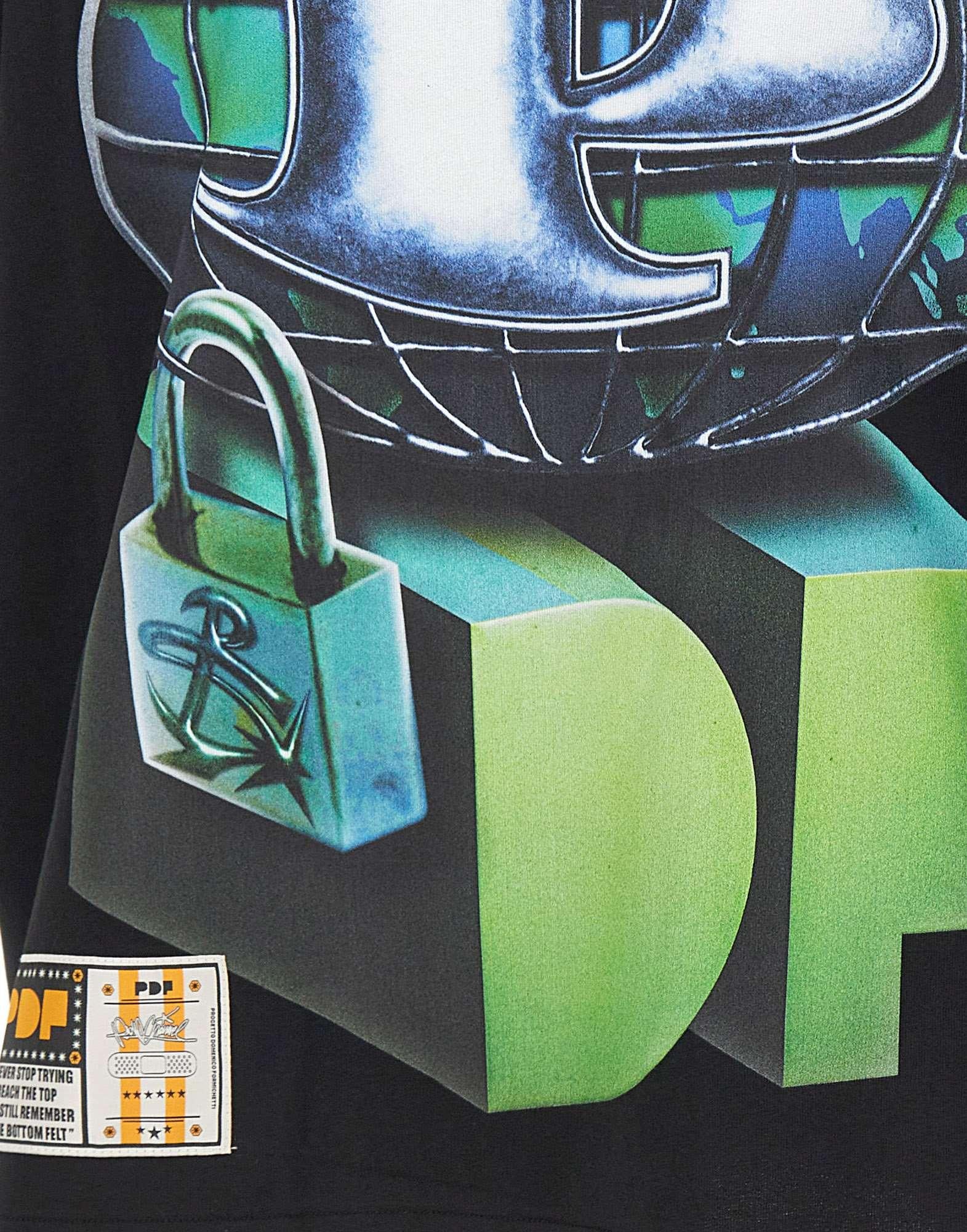 T-shirt uomo PDF "Skinny Barti PDF World" realizzata in cotone color nero, caratterizzata da una stampa digitale verde e blu sulla parte frontale che definisce il forte impatto grafico del capo. Il modello presenta girocollo a costine e maniche corte, elementi essenziali che valorizzano una linea contemporanea e versatile. L'etichetta logo applicata sul fondo aggiunge un dettaglio distintivo, mentre il patch cerotto sul retro richiama il linguaggio creativo del brand. Il taglio corto e largo dona alla t-shirt una silhouette moderna e decisa, perfetta per look streetwear dal carattere originale. Made in Italy.