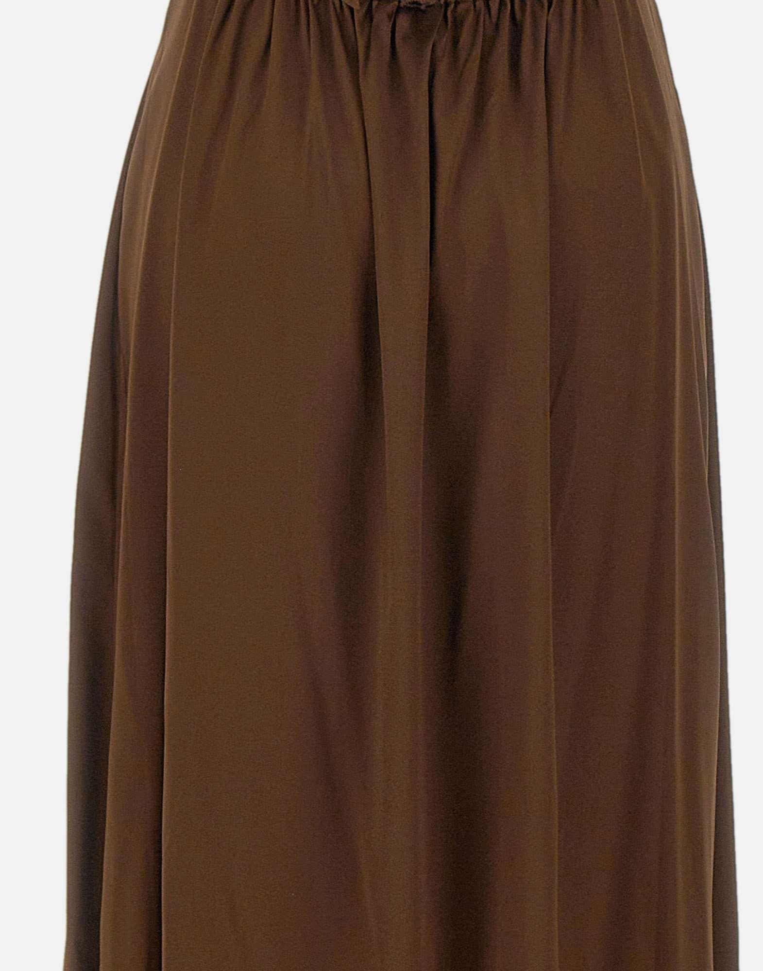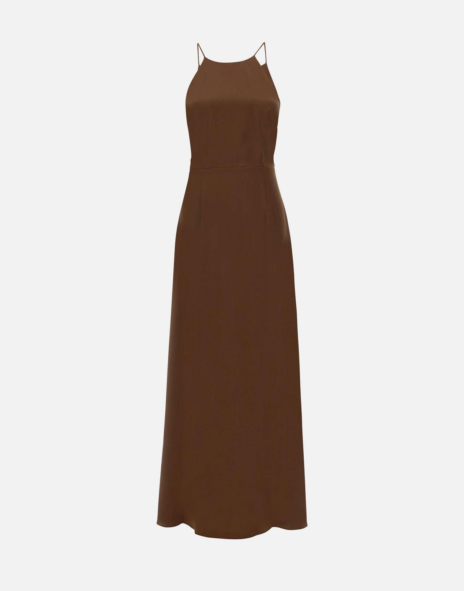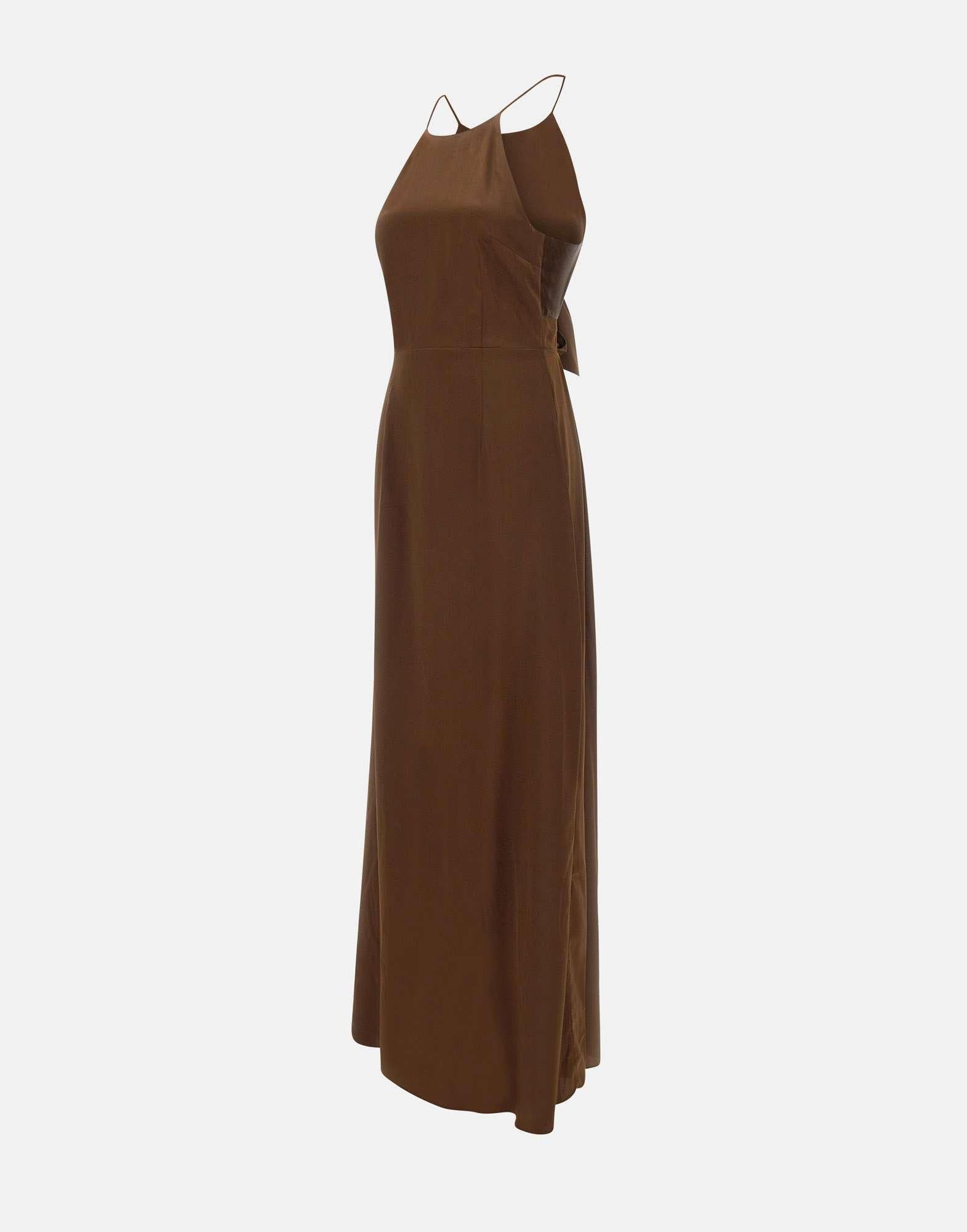 Abito The Garment "Cata" in seta color caffè, caratterizzato da un elegante scollo all'americana e da una linea lunga e fluida che valorizza la figura. Il nodo sul retro consente di regolare la vestibilità, mentre le spalline sottili e l'apertura sulla schiena donano al capo un fascino raffinato e sensuale. La vita elasticizzata accentua la silhouette, rendendo l'abito confortevole e sofisticato al tempo stesso. Un modello che incarna un'eleganza senza tempo, perfetto per le occasioni più esclusive.