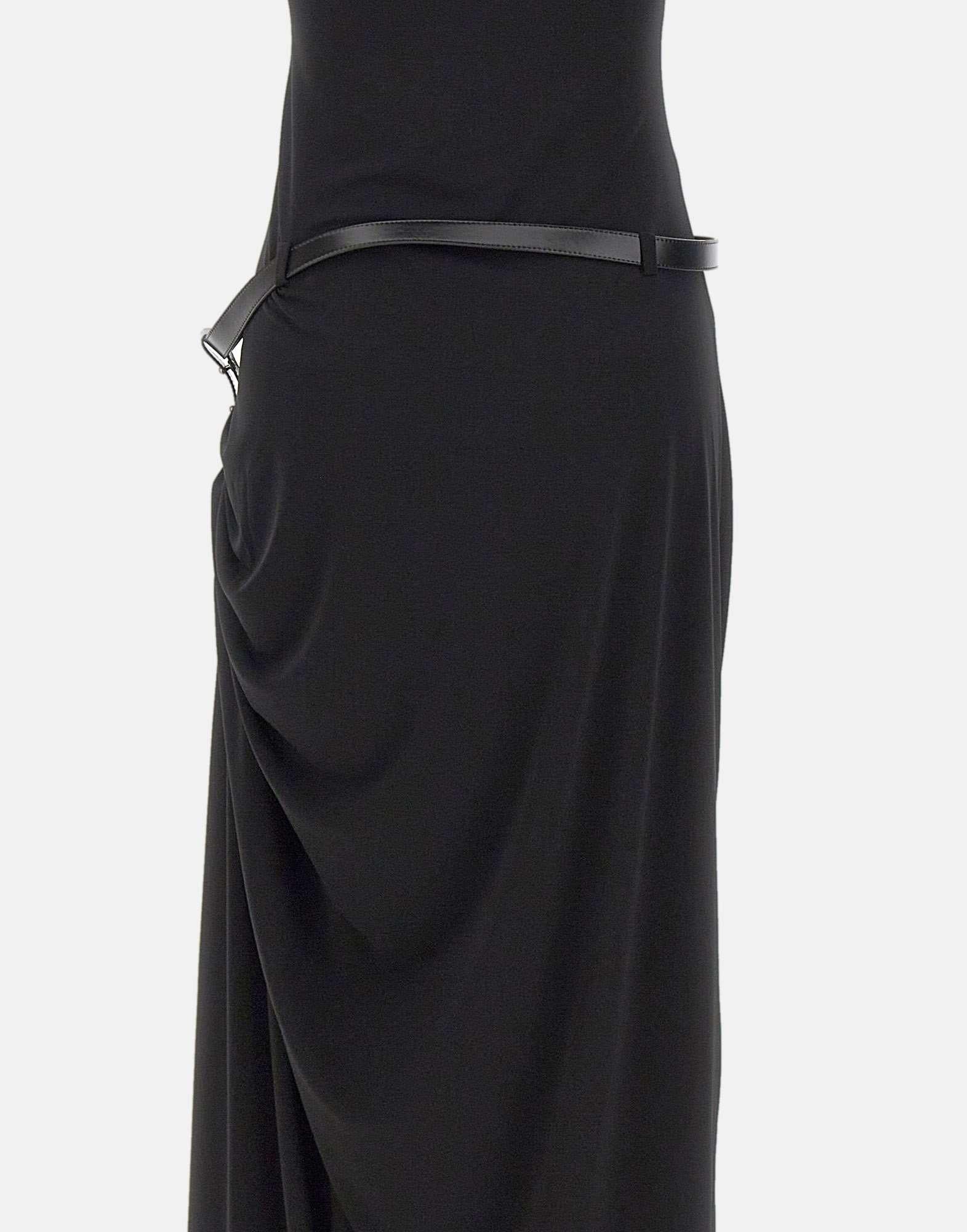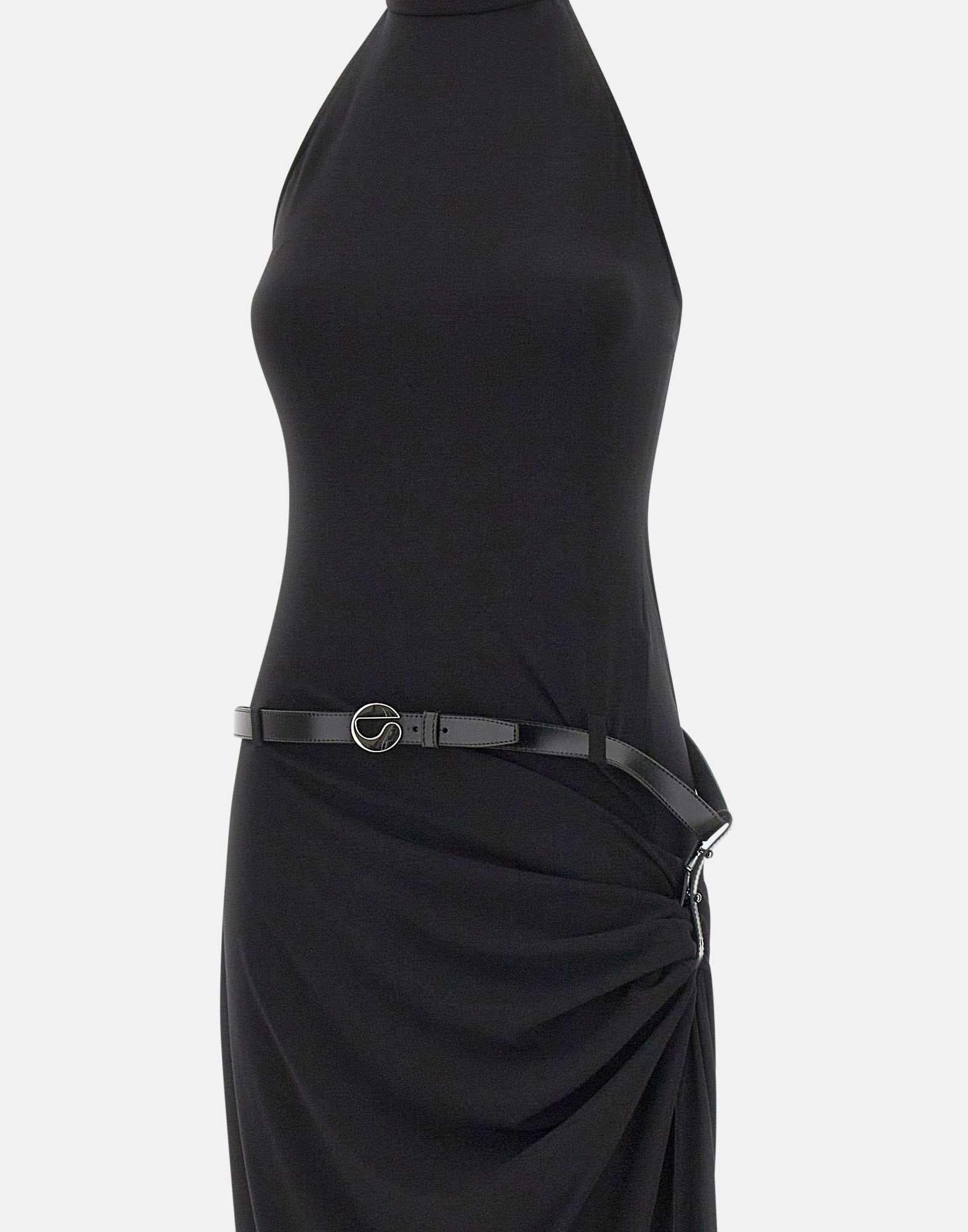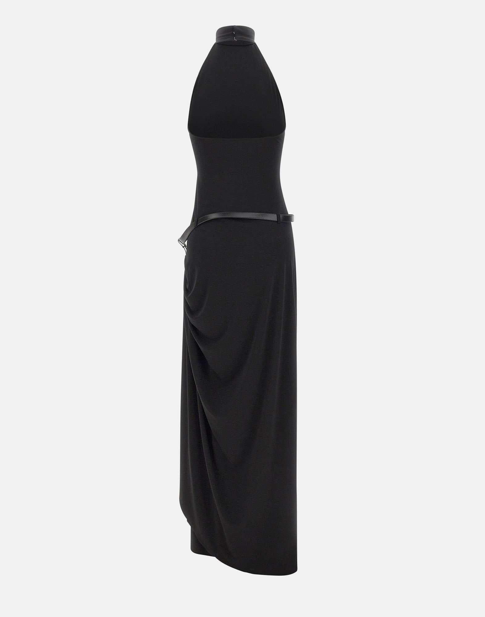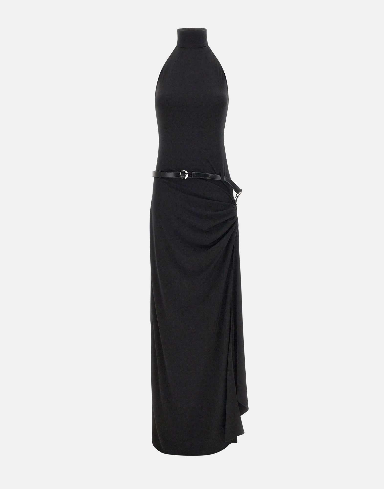Abito donna Coperni realizzato in tessuto elasticizzato nero. Il modello lungo fino a terra è drappeggiato sui fianchi, creando un movimento fluido con un contrasto strutturato. Il corpetto scolpito presenta scollatura alta all'americana con spalle scoperte ed è completato da cerniera laterale nascosta. Lo spacco è valorizzato da cintura in pelle con fibbia argento, per un dettaglio deciso e contemporaneo.