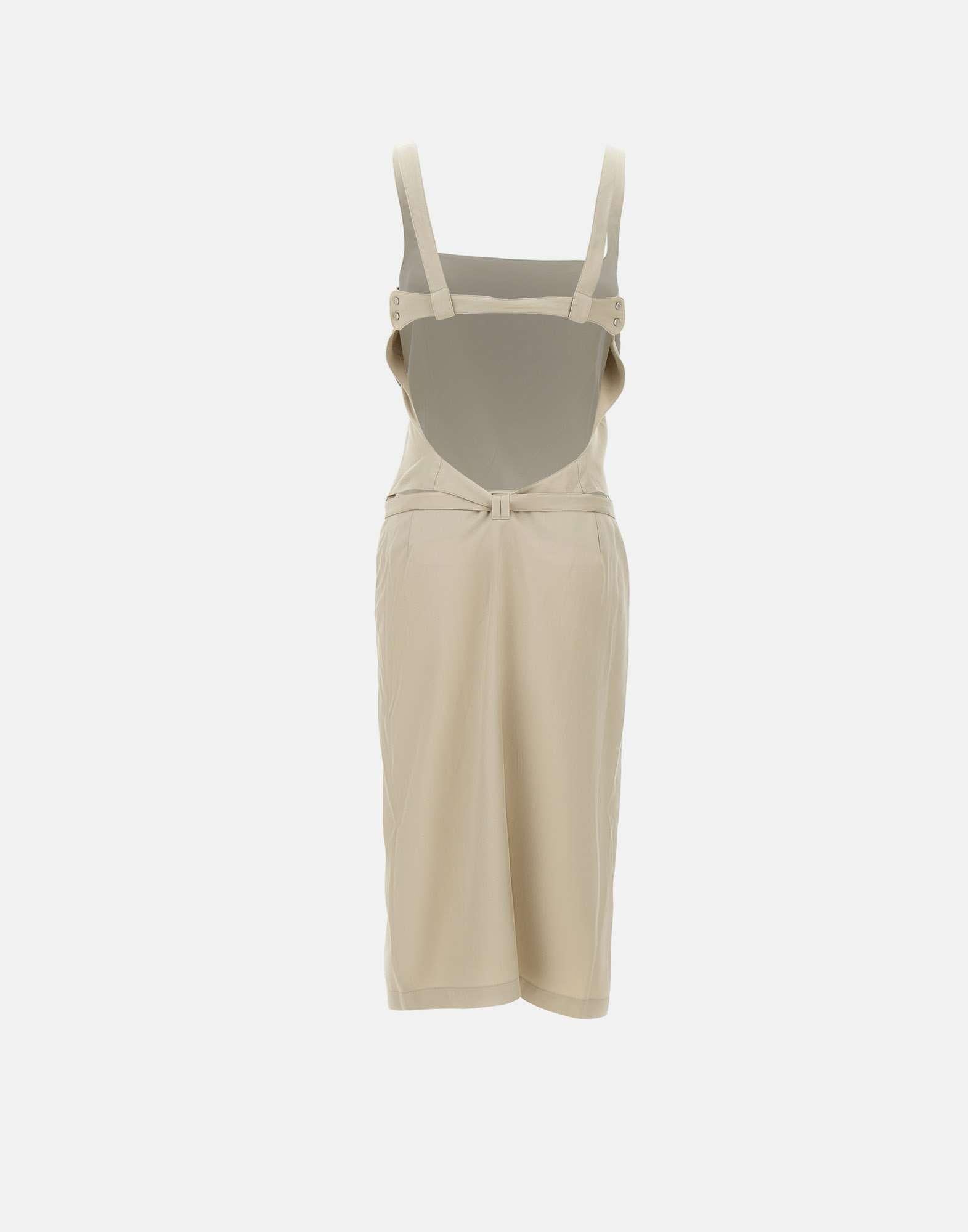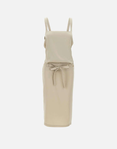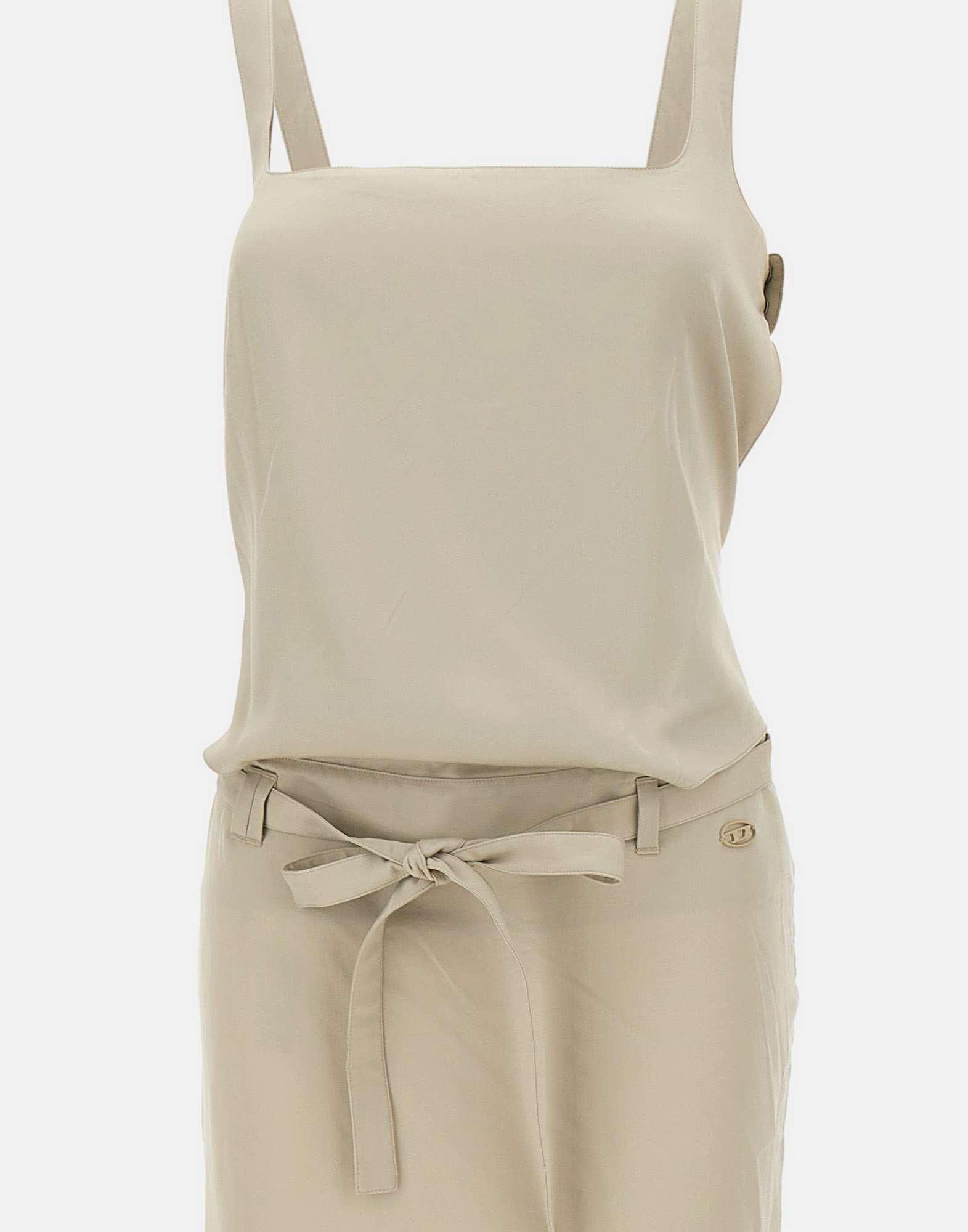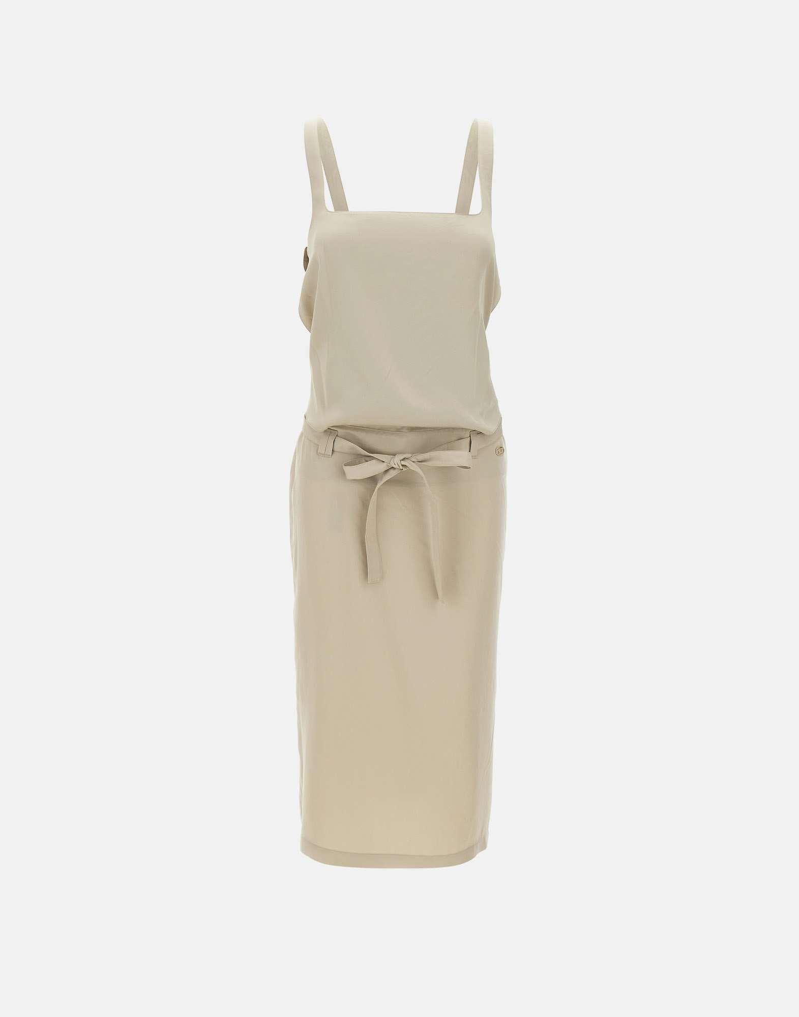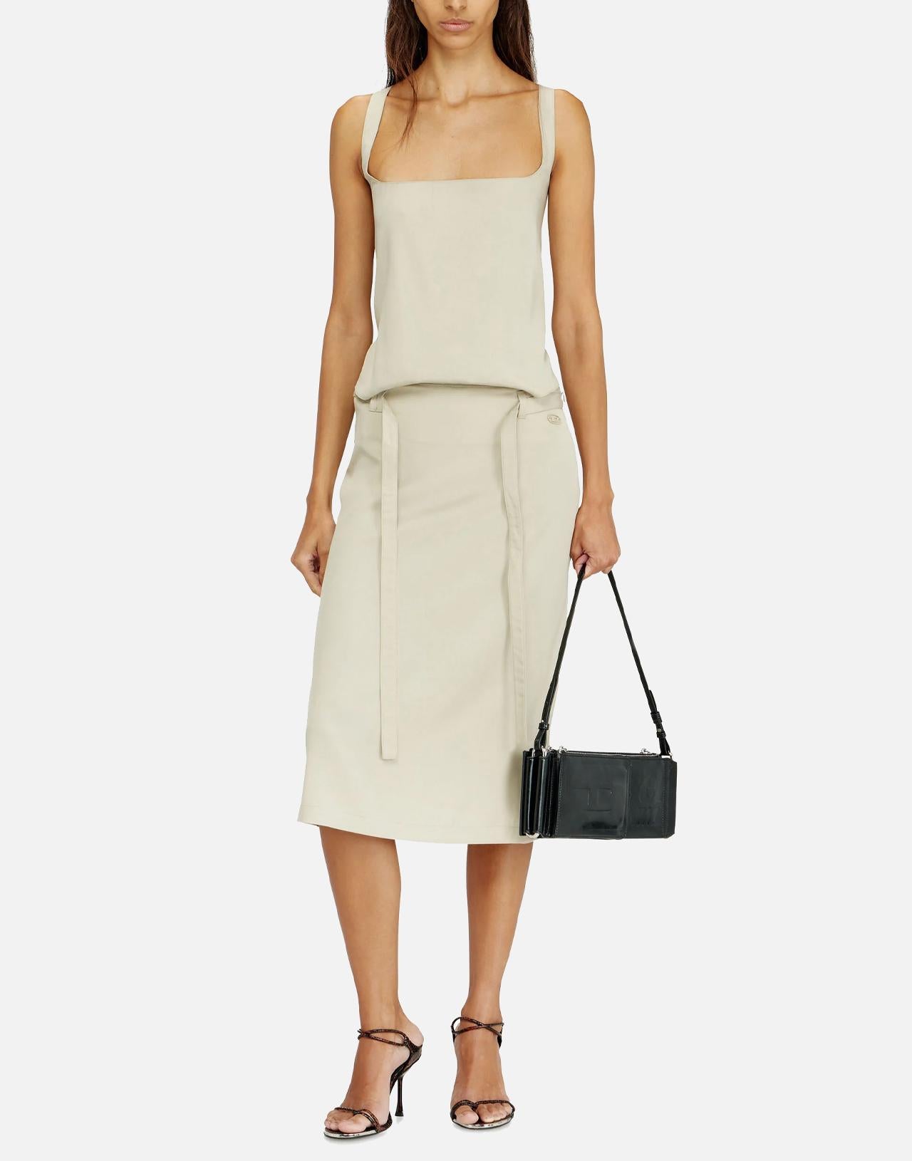 Abito midi donna Diesel "D-Sana" realizzato in morbido lyocell color verde salvia, pensato per dare fluidità alla silhouette ispirata al grembiule. Il design presenta scollo quadrato e schiena scoperta incorniciata dalle spalline, abbottonate sul retro con bottoni a pressione. La lunga cintura in vita, da annodare, avvolgere o lasciare libera, richiama i codici biker decostruiti della collezione e aggiunge carattere al look. Chiusura con zip invisibile sul lato. Logo Oval D applicato sul fianco sinistro a firmare il capo.
