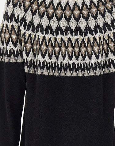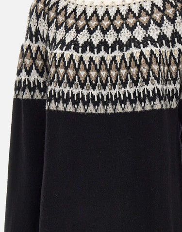 Abito donna Elena Mirò in misto lana e yak, con fondo nero e fantasia geometrica impreziosita da pietre luminose decorative. Presenta scollo tondo, maniche lunghe e bordi a costine che assicurano una vestibilità confortevole. La relaxed fit dona morbidezza e libertà di movimento, ideale per look eleganti e contemporanei con un tocco brillante.