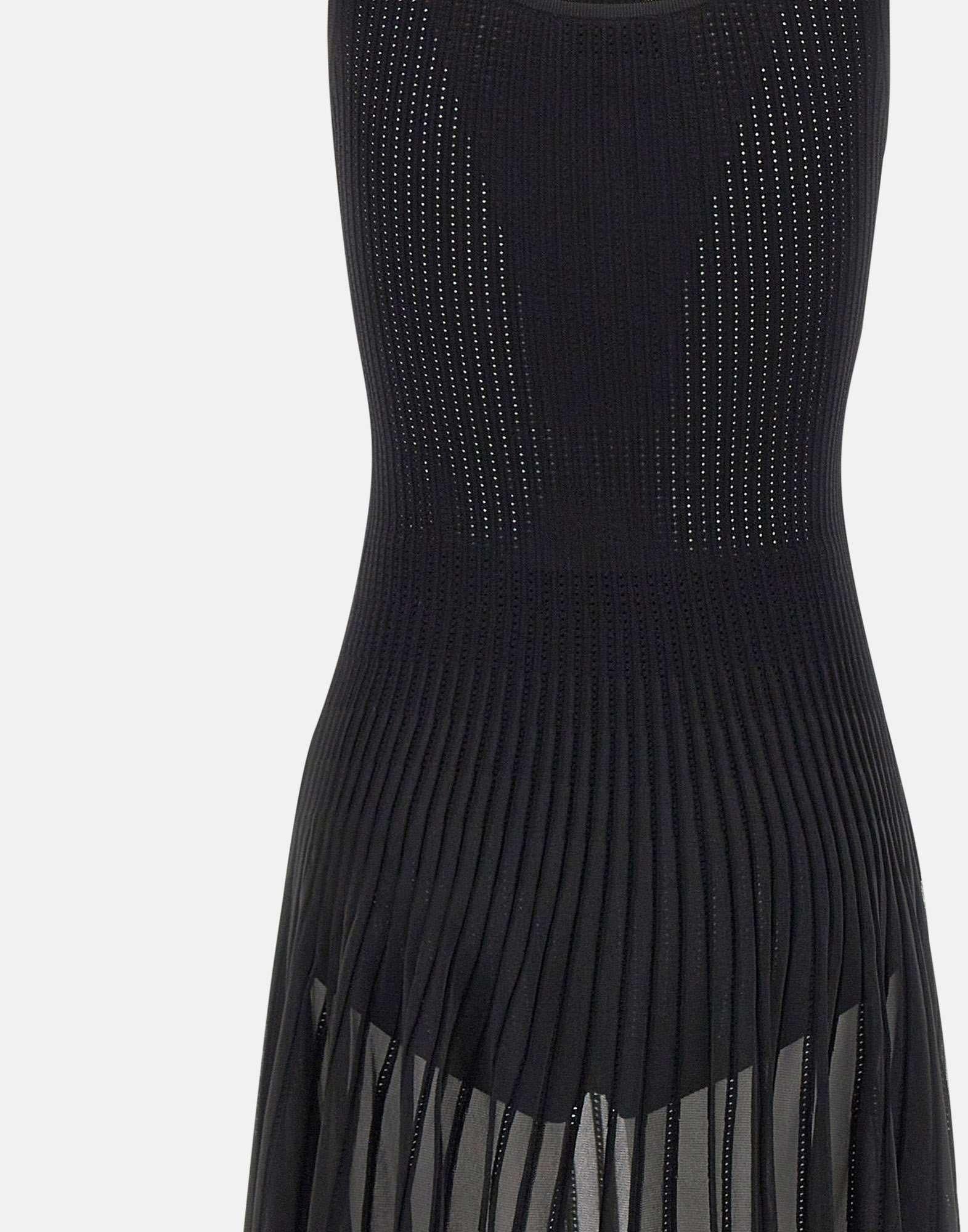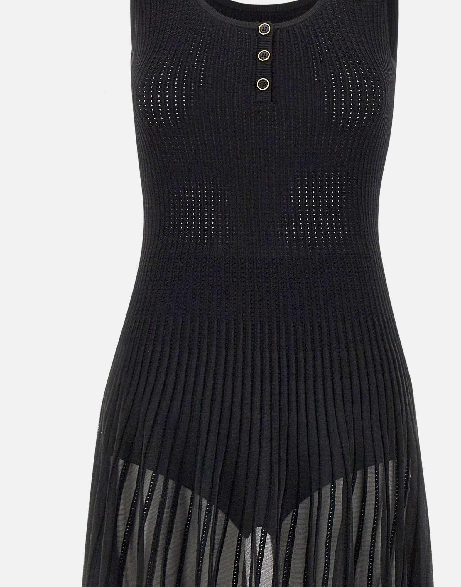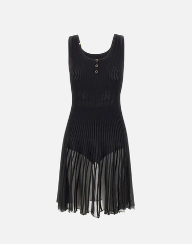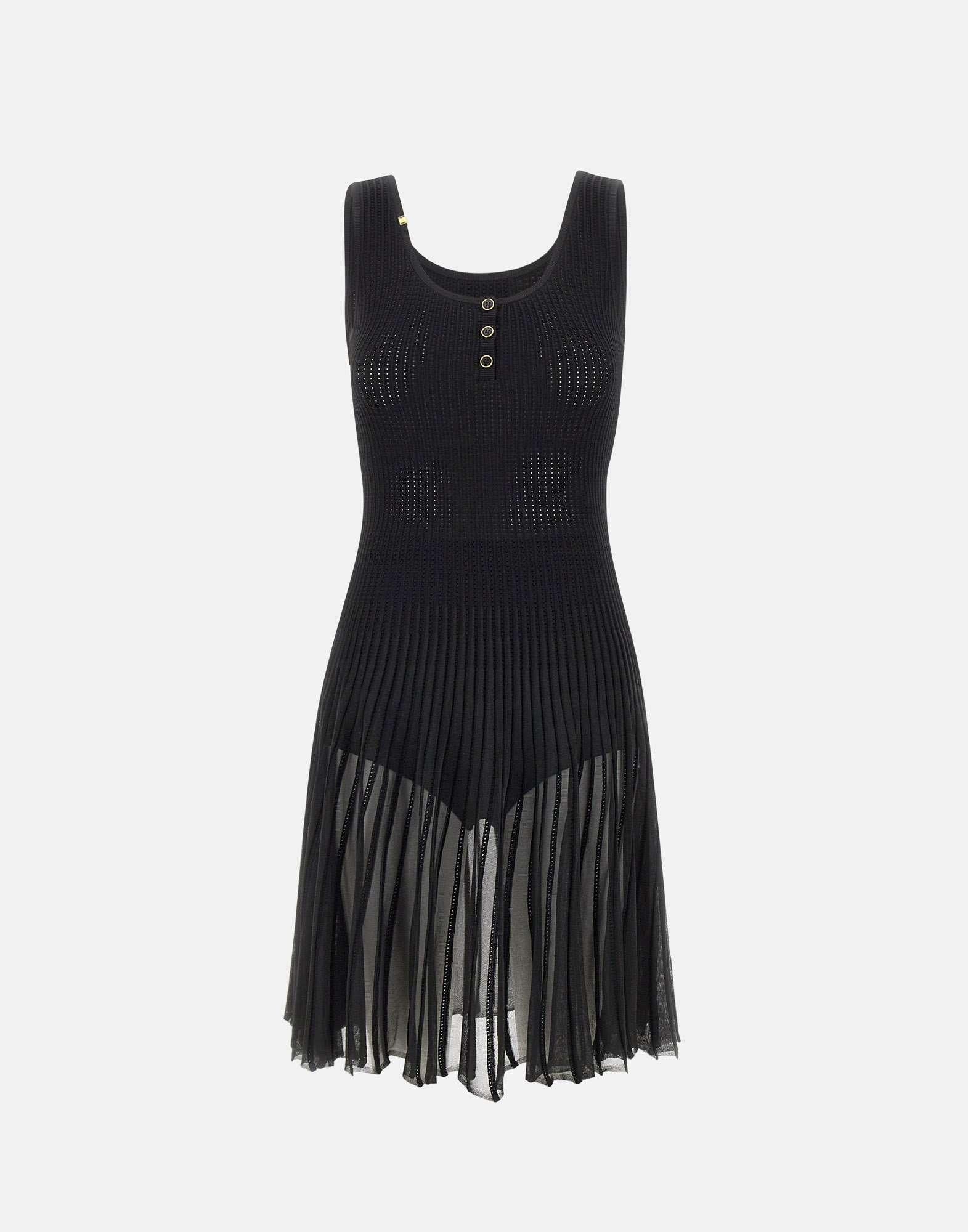 Abito Elisabetta Franchi realizzato in maglia à jour color nero, pensato per valorizzare la figura con una vestibilità aderente. Il modello è smanicato con scollo ampio ed è completato da culotte abbinata per un tocco pratico e contemporaneo. Le lavorazioni a costine traforate con punto à jour si aprono nella gonna creando un effetto plissé, per una trama ricca al tatto e una silhouette dinamica. Sullo scollo spicca un dettaglio in metallo dorato con logo, accompagnato da tre bottoni logati.
