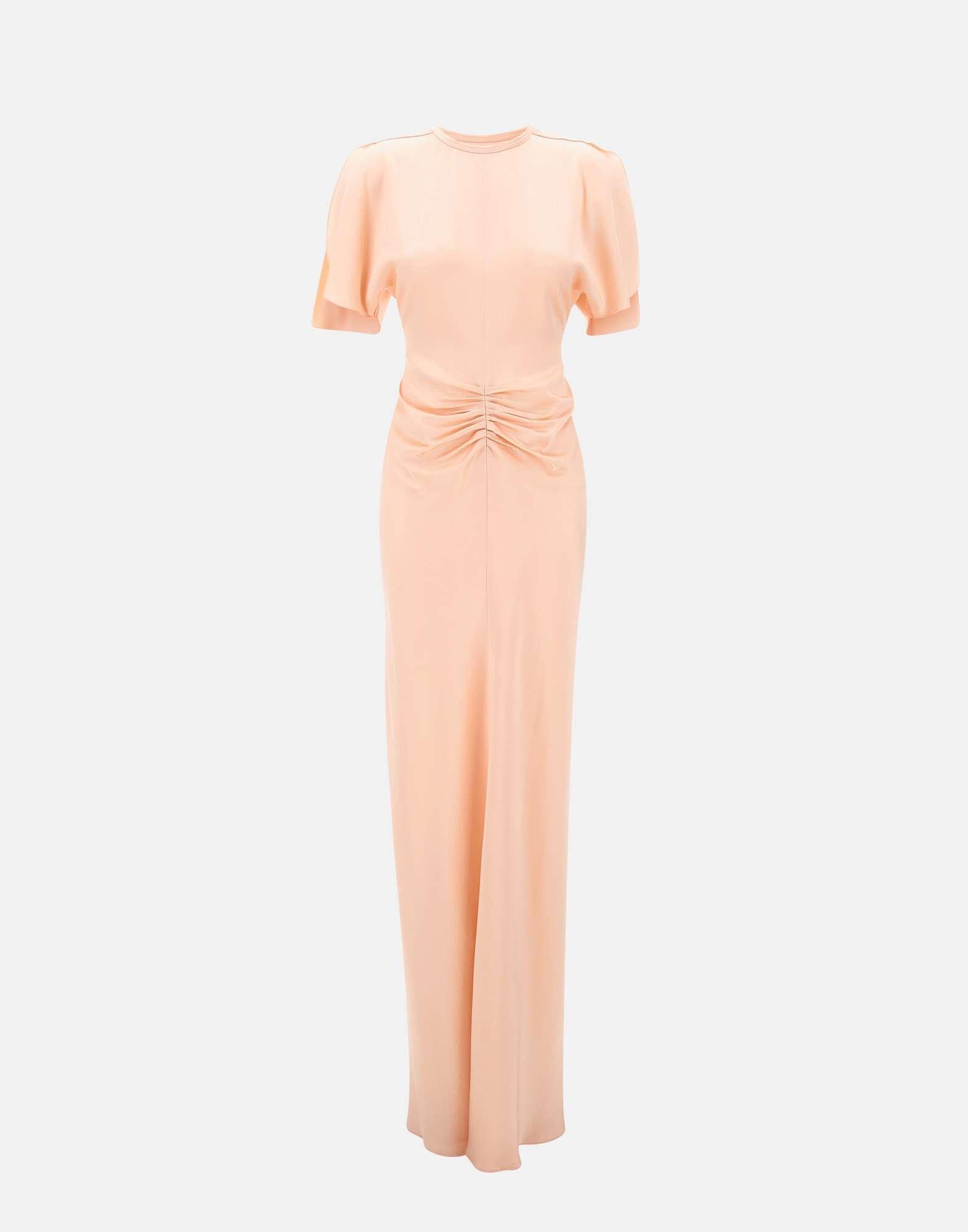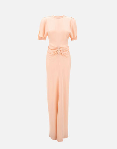 Abito donna Victoria Beckham "Isabella" realizzato in morbido crepe color rosa, tagliato per adattarsi e valorizzare la parte superiore del corpo prima di aprirsi in un orlo che sfiora il pavimento. Questo abito lungo fino a terra presenta vita arricciata, scollatura rotonda discreta e maniche corte fluide con spacchi, completate da una sensuale schiena a V. Le pieghe frontali tattili aggiungono profondità al design e valorizzano la silhouette con un'eleganza essenziale. Vestibilità regolare.