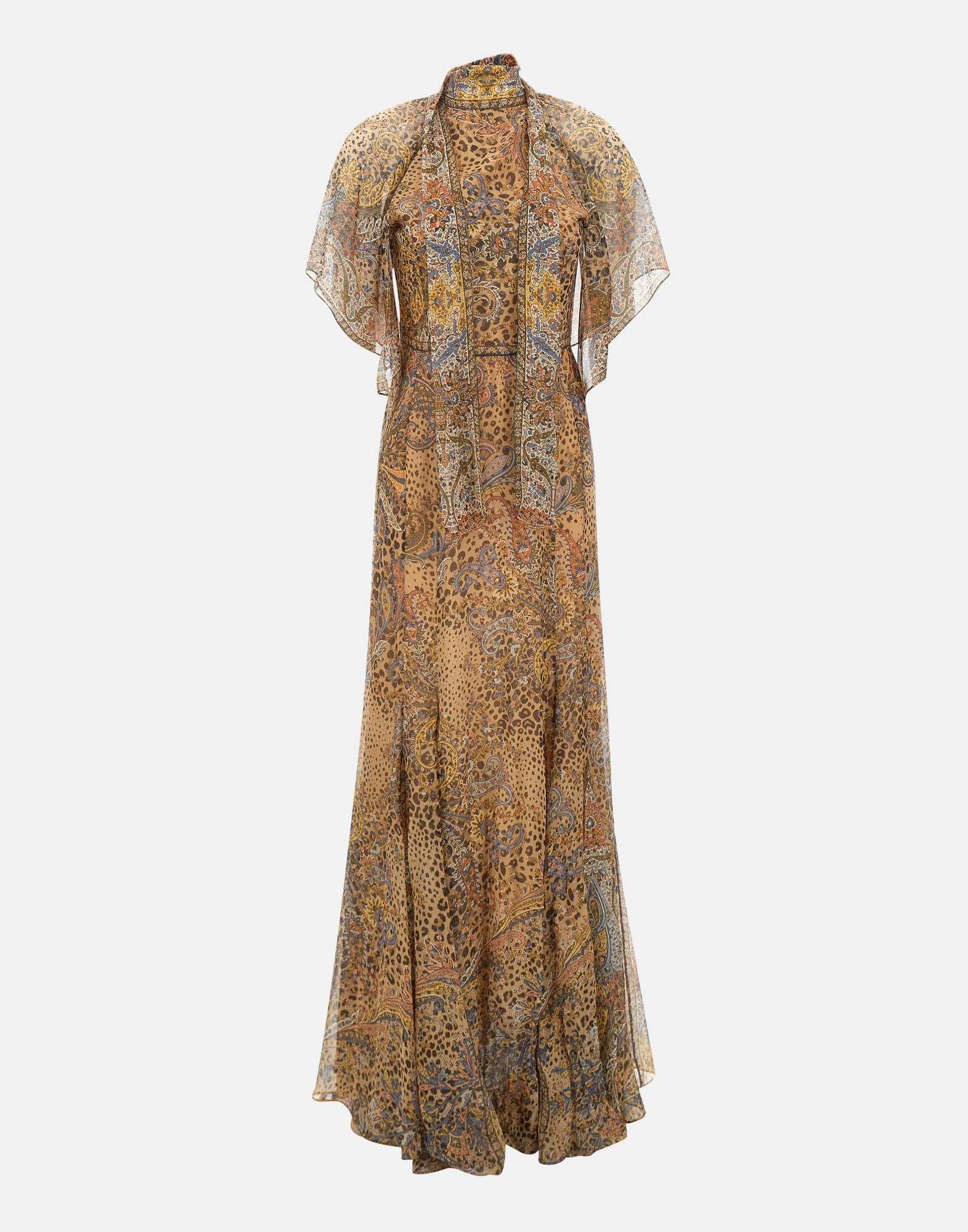 Abito lungo Etro realizzato in chiffon di pura seta multicolor, contraddistinto da un motivo animalier all over cui si sovrappone l'iconico Paisley arricchito con dettagli floreali. Il design scorre leggero e raffinato, con ampie maniche corte dotate di spacchi inferiori che aggiungono movimento alla silhouette. Il modello è completato da un sottile foulard integrato da annodare in un morbido fiocco, per un tocco distintivo e femminile. Chiusura con zip laterale nascosta. Vestibilità regular. Made in Italy.