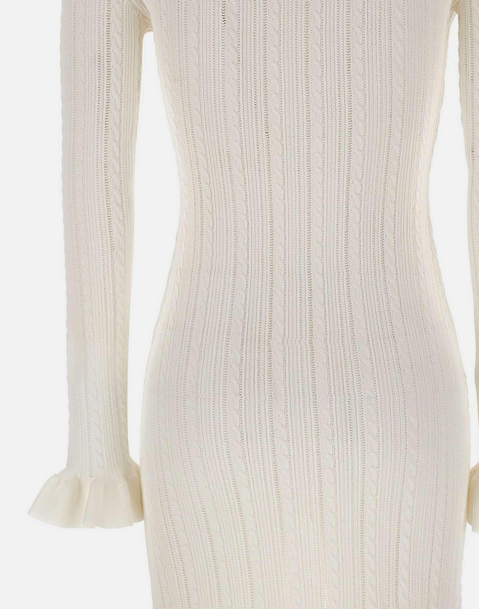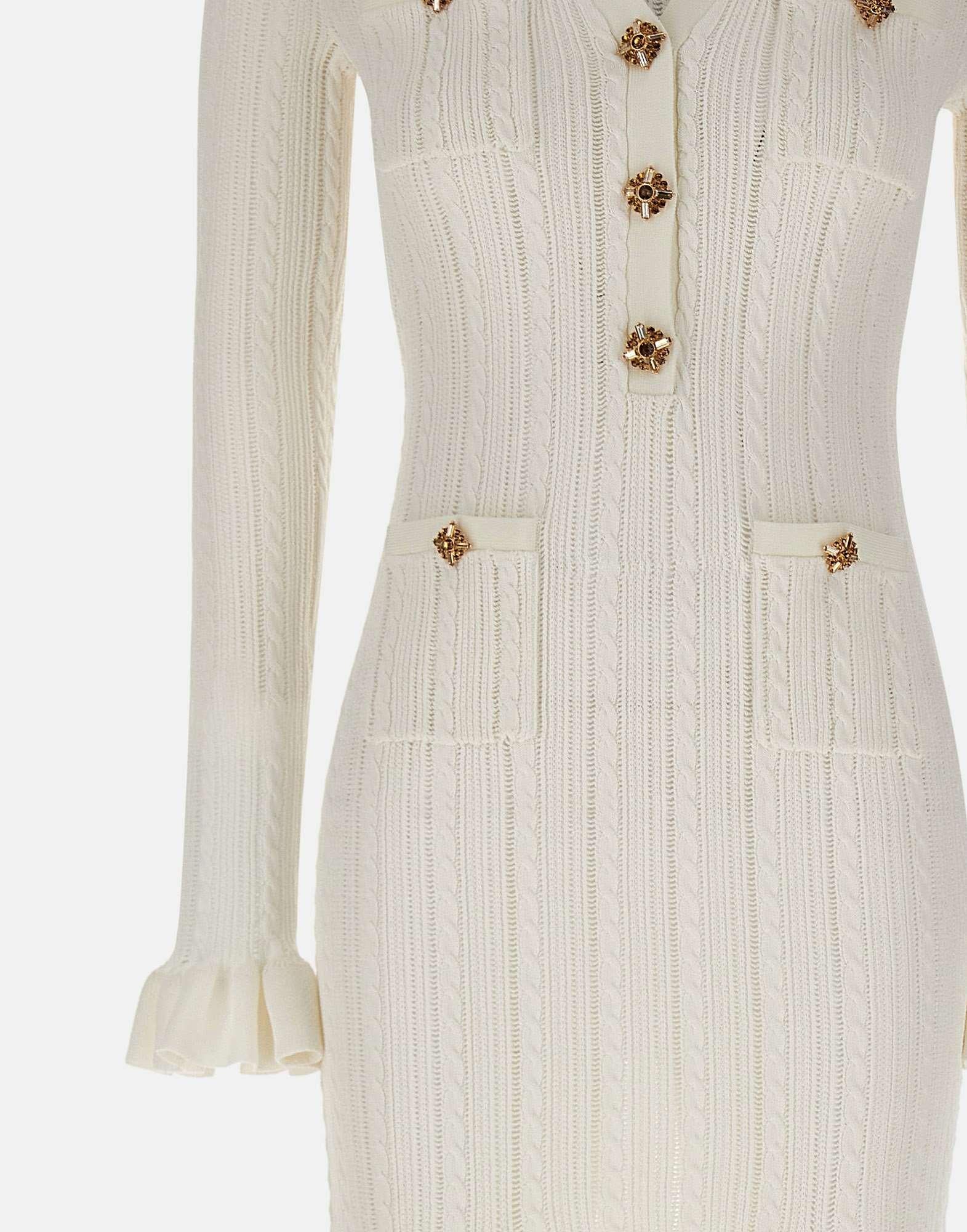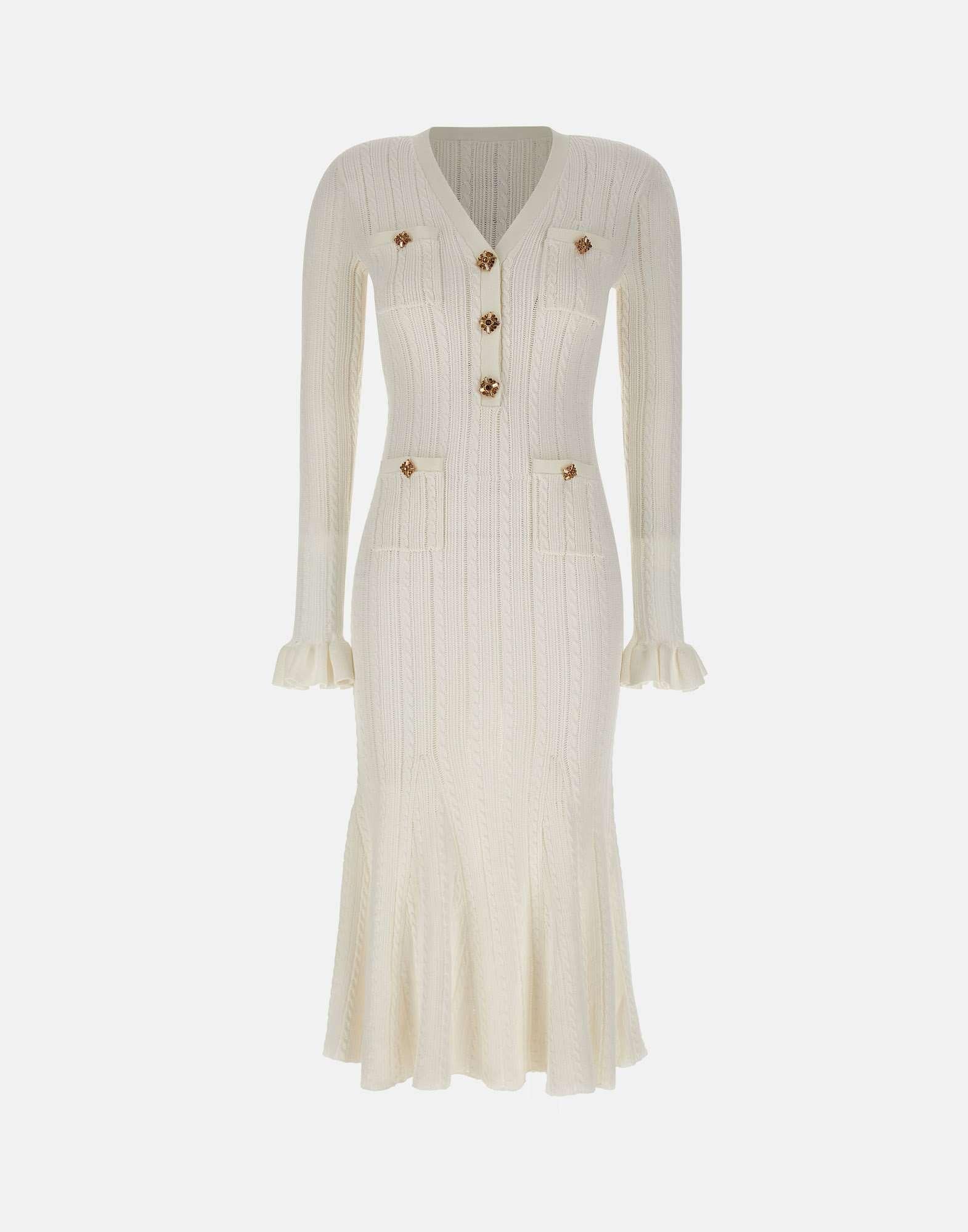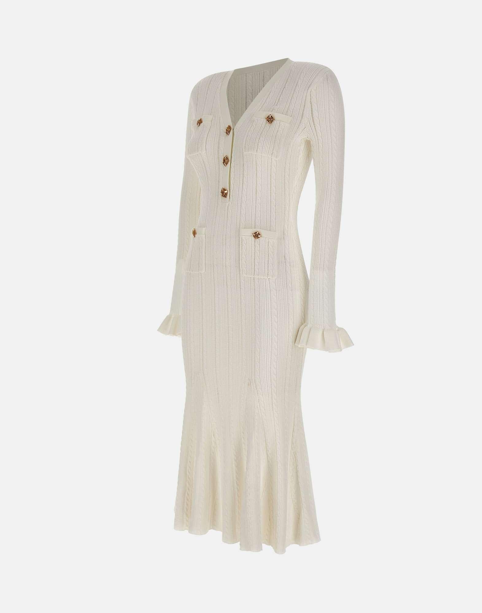 Abito midi donna Self Portait realizzato in maglia di misto viscosa color bianco con lavorazione traforata e intrecciata, pensato per un look femminile e contemporaneo. Il modello presenta scollo a V con tre bottoni gioiello dorati, ripresi anche sui quattro taschini, e una silhouette svasata con maniche eleganti che unisce stile e comfort. I polsini con ruches aggiungono un dettaglio raffinato, mentre all'interno sono presenti spalline rimovibili per una vestibilità personalizzabile. Fedele alle dimensioni, con vestibilita aderente.