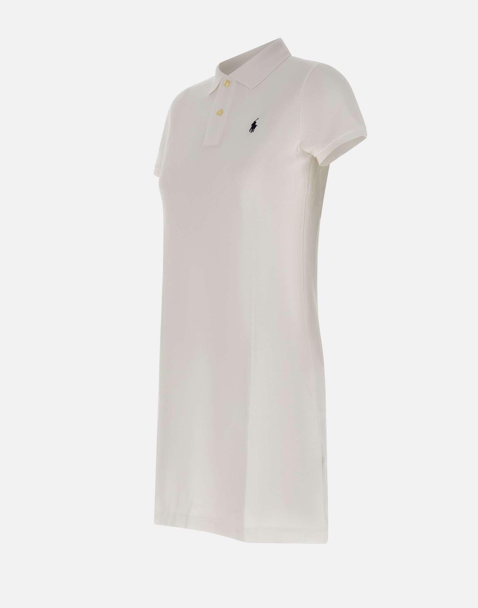 Abito corto donna Polo Ralph Lauern in cotone color bianco, dal design essenziale e sportivo. La silhouette dritta è rifinita con piccoli spacchi laterali per maggiore comfort e libertà di movimento. Sul lato sinistro del torace spicca l'iconico pony ricamato in blu, dettaglio distintivo del brand. Colletto polo a coste, chiusura a due bottoni e maniche corte con fondo manica a coste completano il modello. Vestibilità regolare, ideale per un look casual curato.