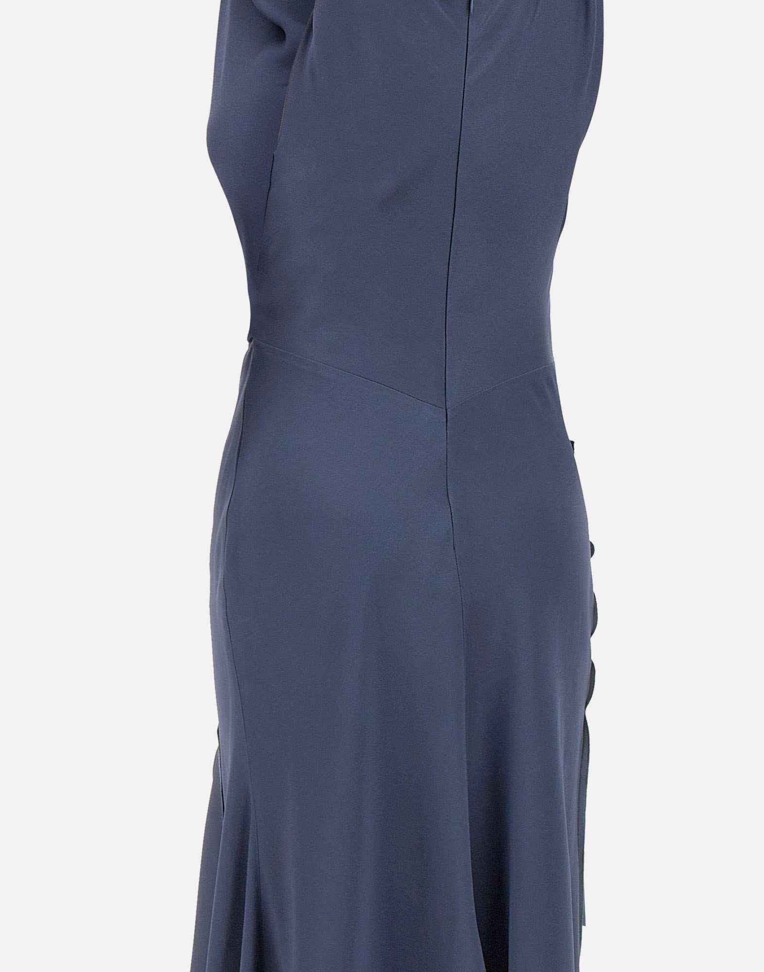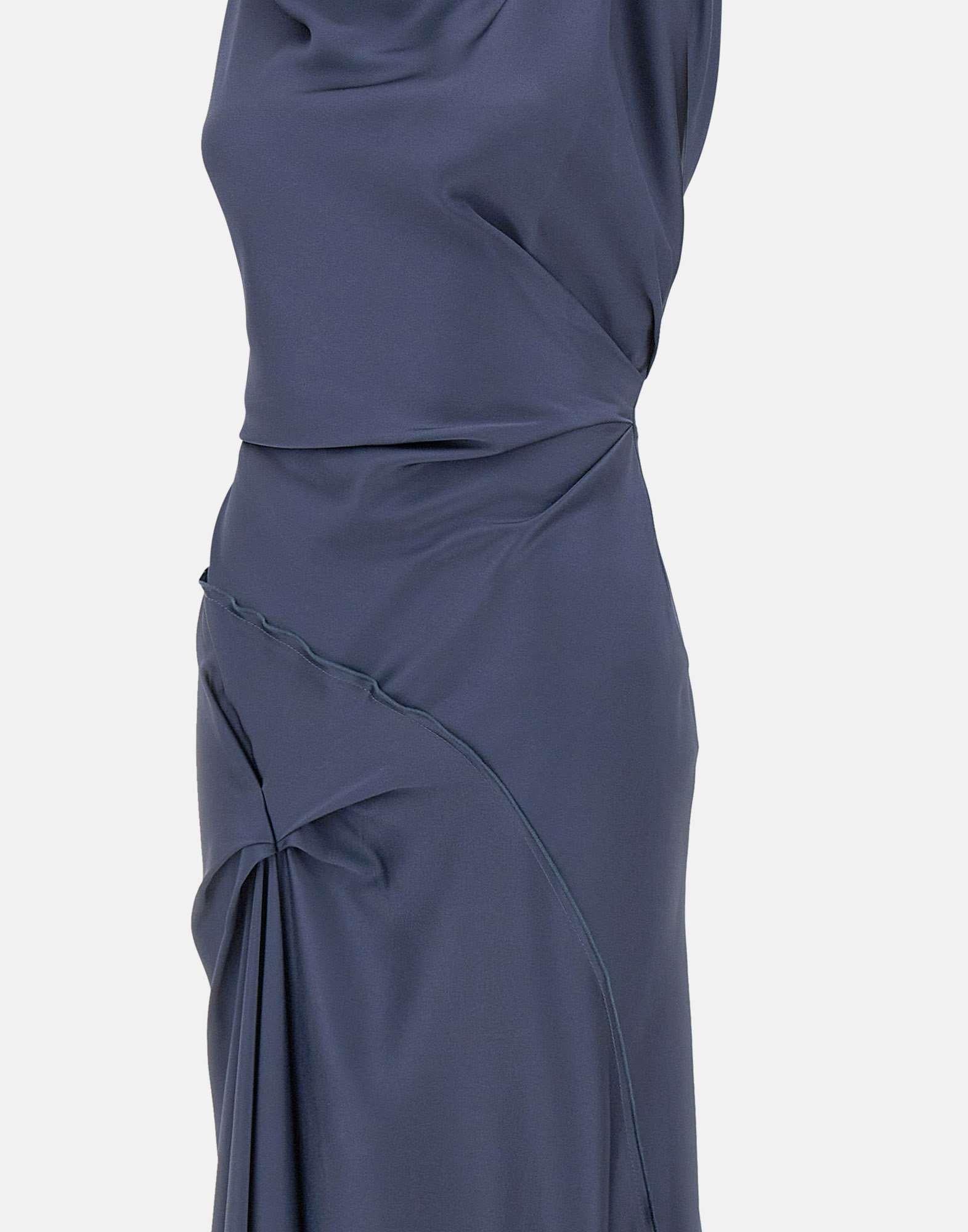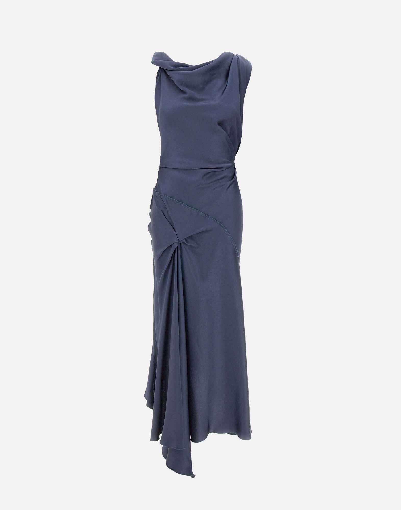 Abito midi Victoria Beckham "Posy" realizzato in raso crêpe back color blu, pensato per una femminilità essenziale e sofisticata. La scollatura anteriore drappeggiata definisce il punto focale del design, mentre la costruzione senza maniche con spalline intrecciate aggiunge un dettaglio raffinato. Presenta un motivo plissettato in vita e sulla gonna anteriore, con orlo asimmetrico che dona fluidità alla silhouette. Le cuciture a vista e le impunture a contrasto valorizzano l'attenzione della maison per dettagli discreti ma di alto livello. Chiusura sul retro con zip nascosta e gancio ad occhiello. Il drappeggio direzionale conferisce una sensuale tattilità all'abito Posy.Vestibilità regolare.
