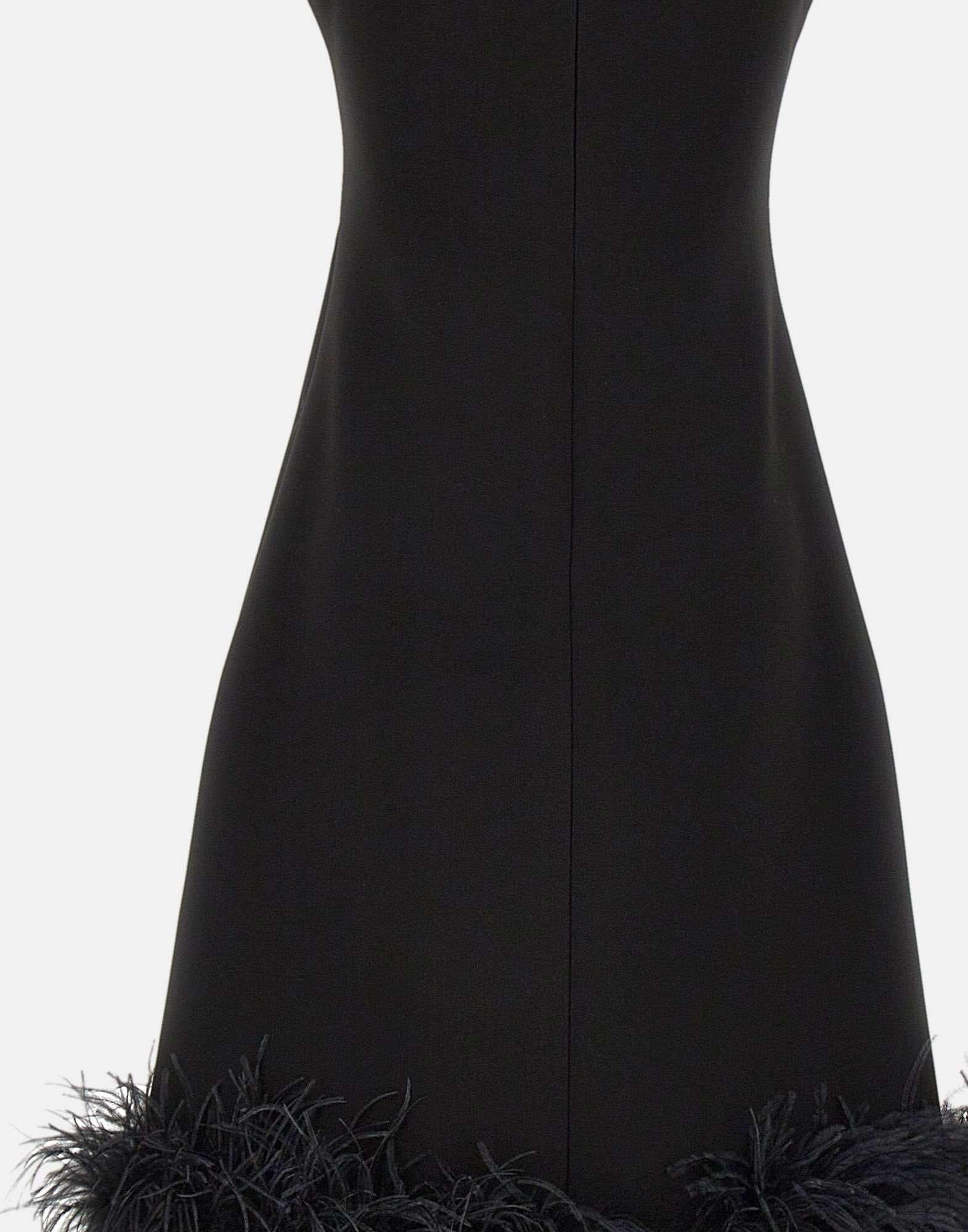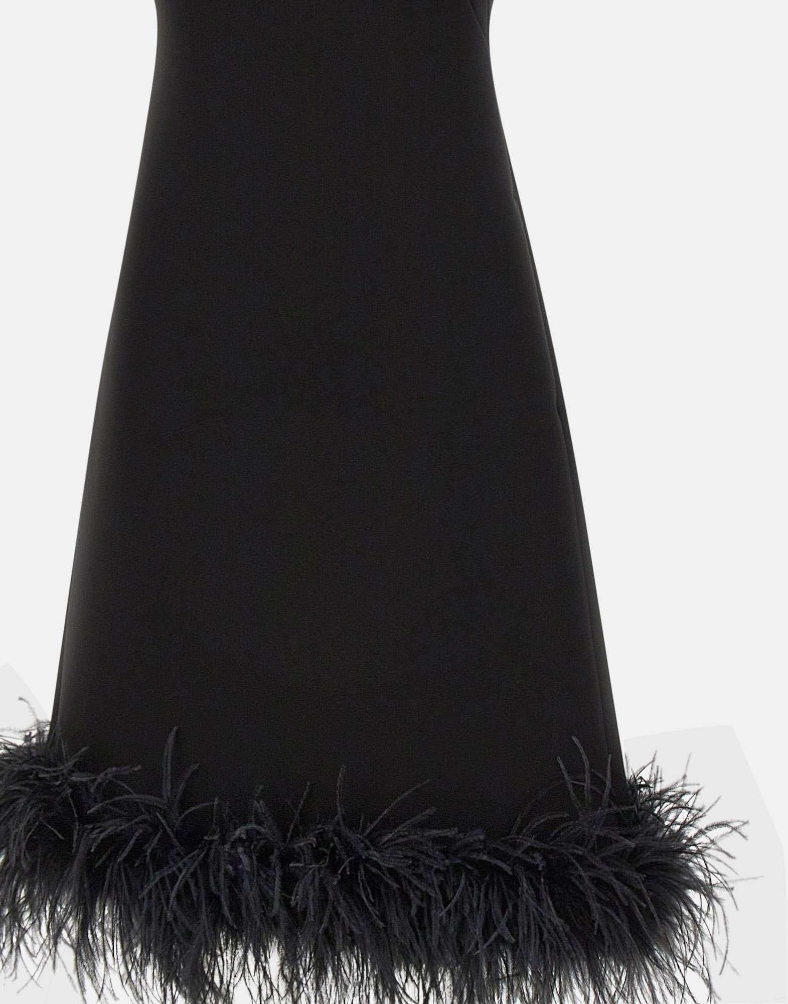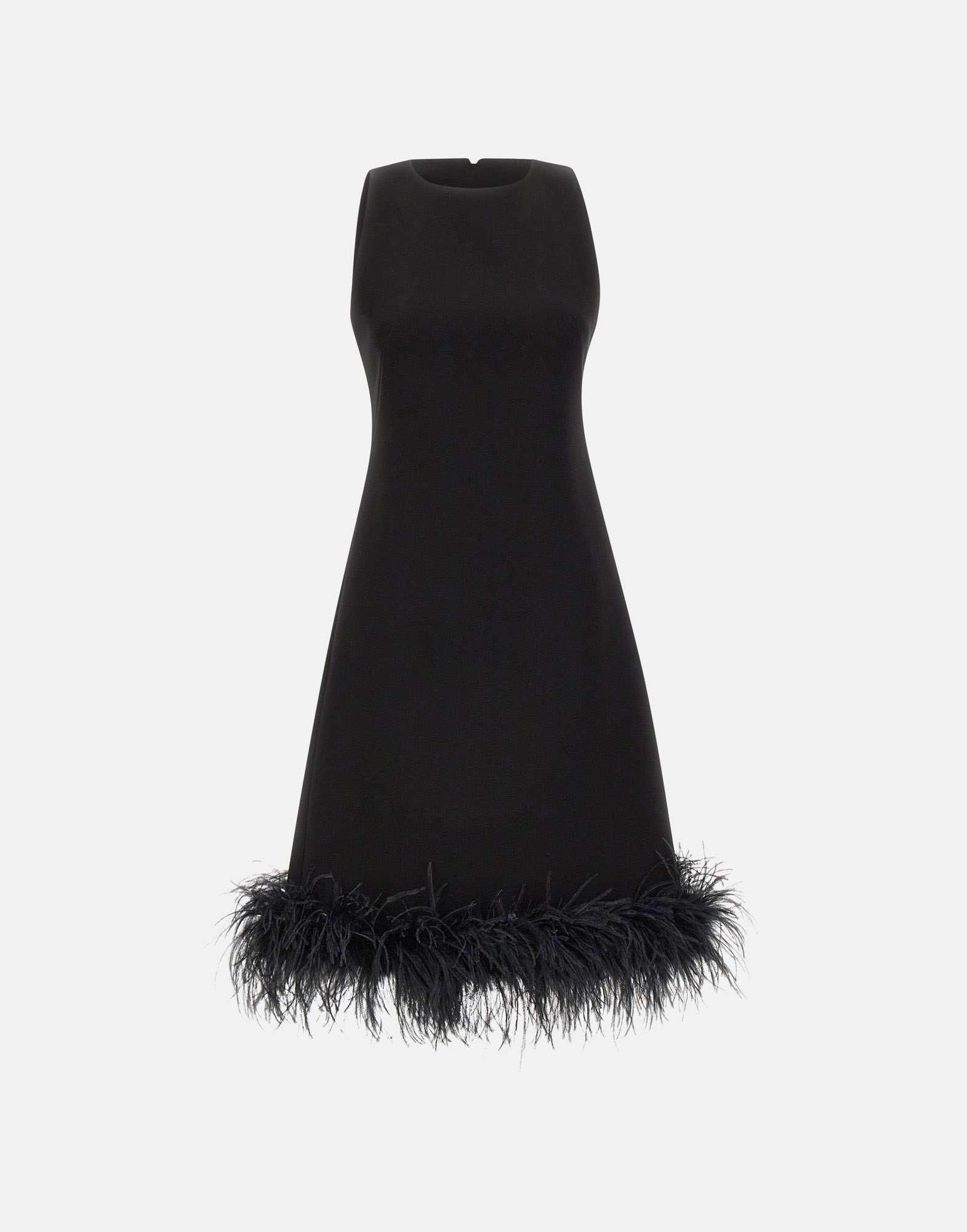 Abito Max Mara Studio "Semito" in tessuto nero, dal taglio midi e linea sartoriale. Caratterizzato da girocollo, maniche a giro e chiusura posteriore con zip nascosta, presenta tasche laterali invisibili per un look pulito e raffinato. L'orlo decorato con vere piume aggiunge un tocco giocoso e sofisticato, rendendo il capo perfetto per serate eleganti o occasioni speciali. Lunghezza al ginocchio e vestibilità regolare completano il design con equilibrio ed eleganza.