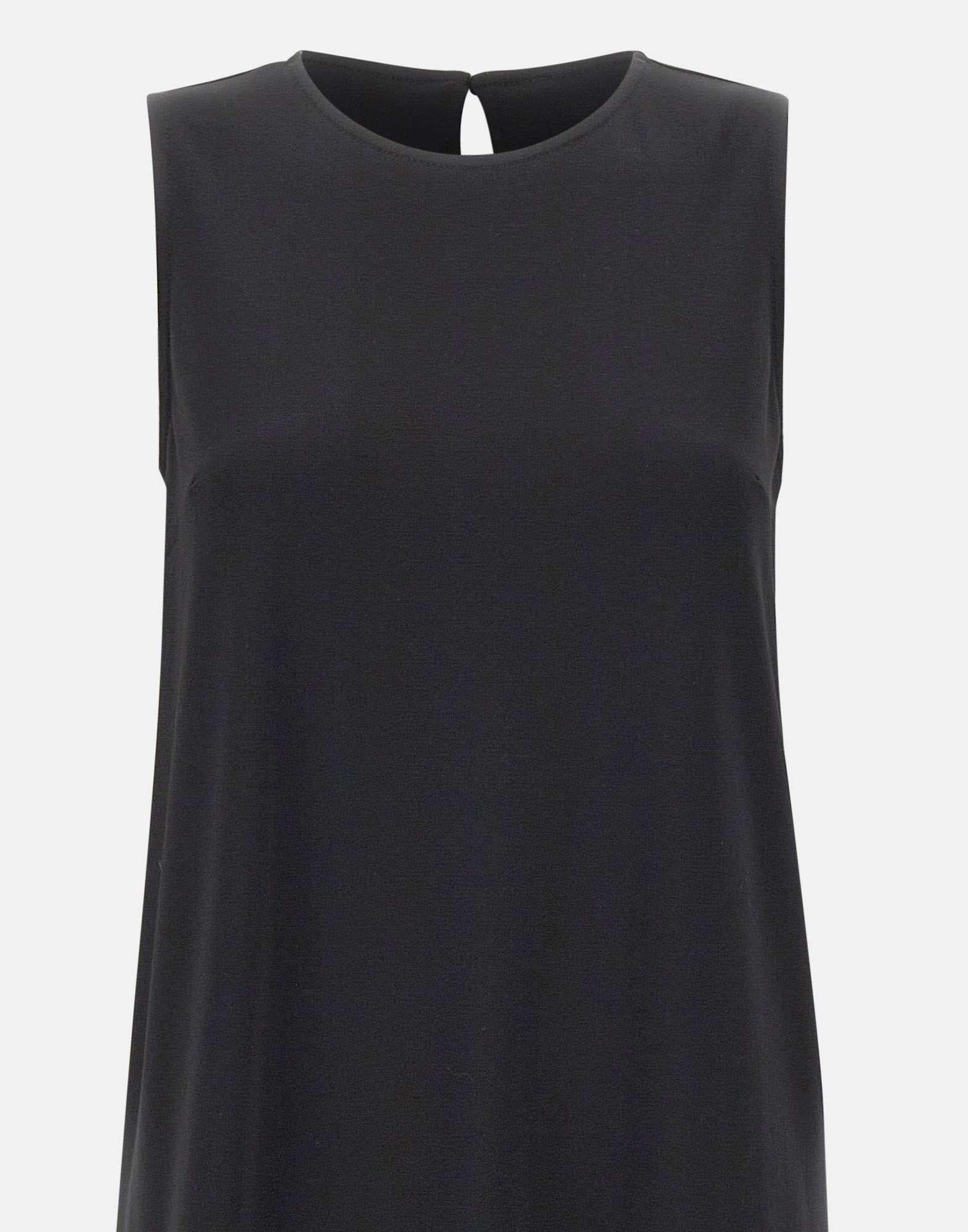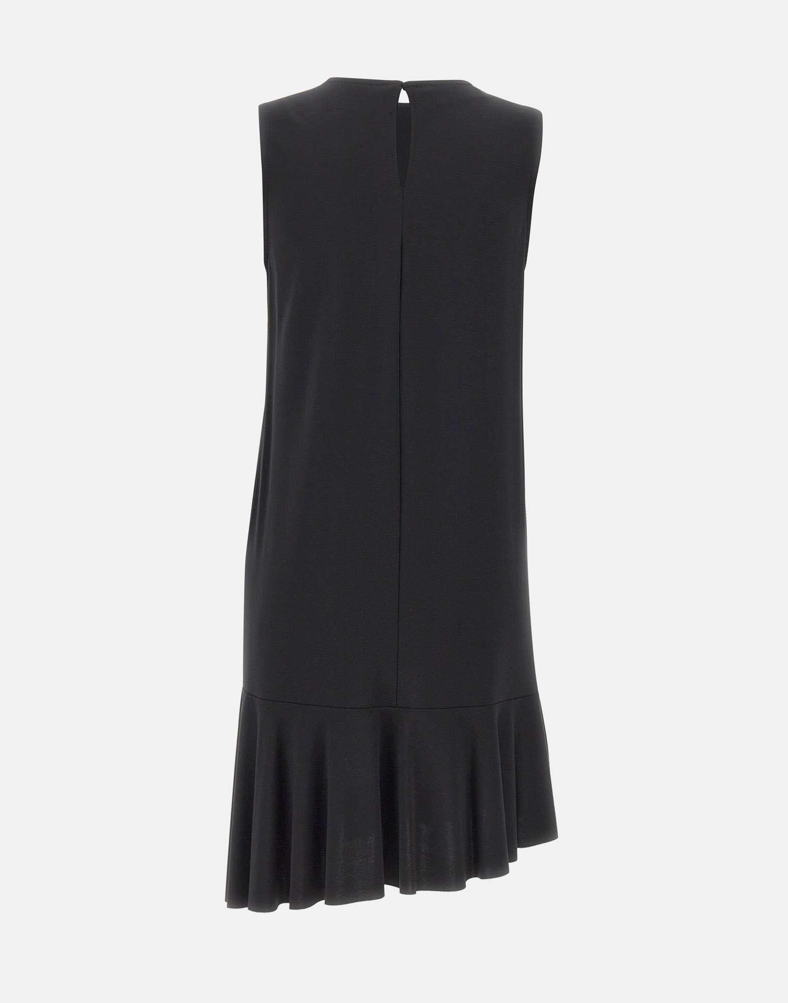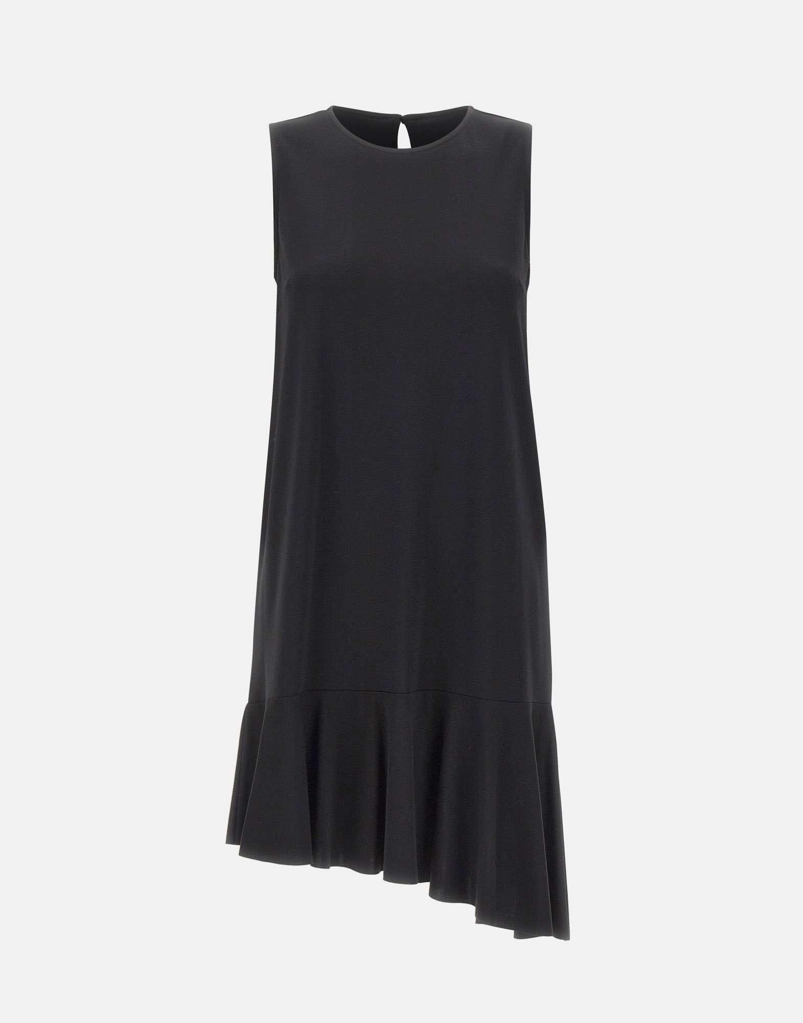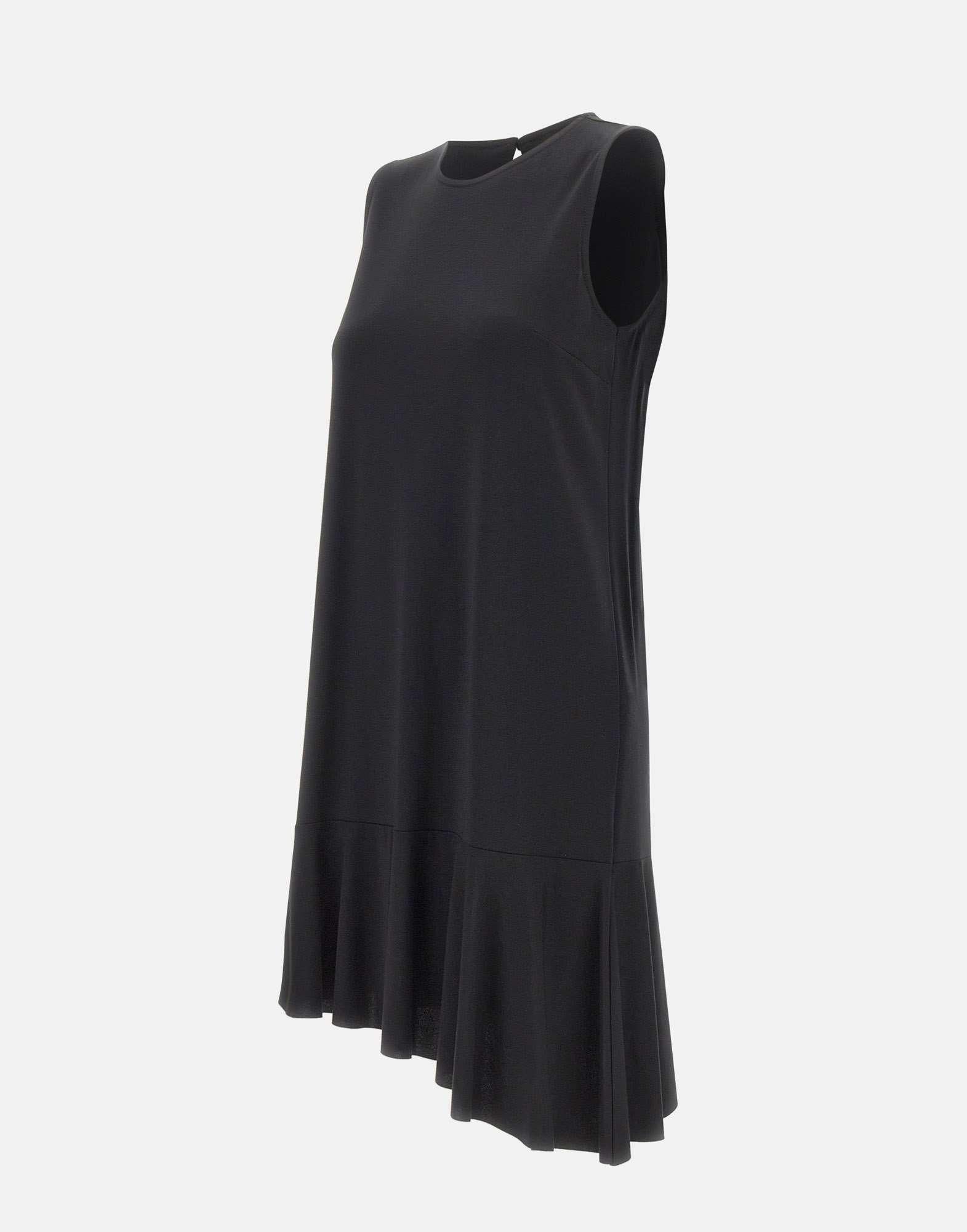 Abito donna Kaos realizzato in misto viscosa elasticizzato color nero, con linea svasata e vestibilità rilassata. Il modello presenta maniche a giro e scollo tondo, mentre sul retro una piccola apertura con bottoncino completa il design con un dettaglio essenziale. Sul fondo, la fascia asimmetrica a balze aggiunge movimento e personalità alla silhouette. Made in Italy.