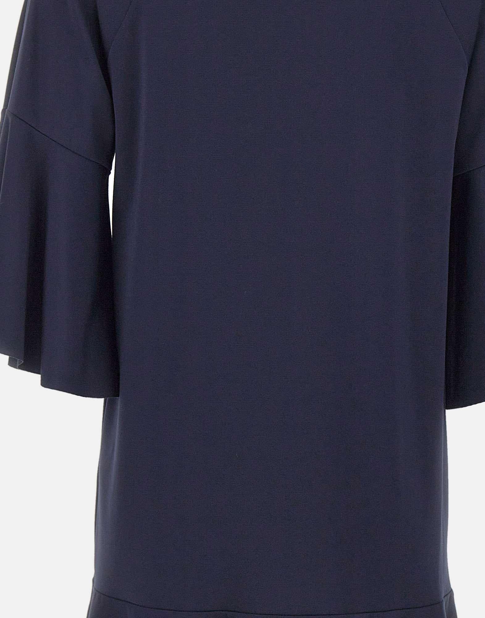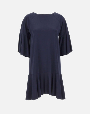 Abito donna Kaos realizzato in misto viscosa elasticizzata color blu, pensato per un'eleganza disinvolta e versatile. Il modello presenta scollo tondo e maniche raglan a 3/4, con una linea svasata che accompagna il movimento con naturalezza. Il fondo e l'orlo delle maniche sono definiti da una fascia a balze, dettaglio che dona ritmo e femminilità alla silhouette. La vestibilità rilassata assicura comfort e un fit fluido, ideale per look da giorno o occasioni piu curate. Made in Italy.