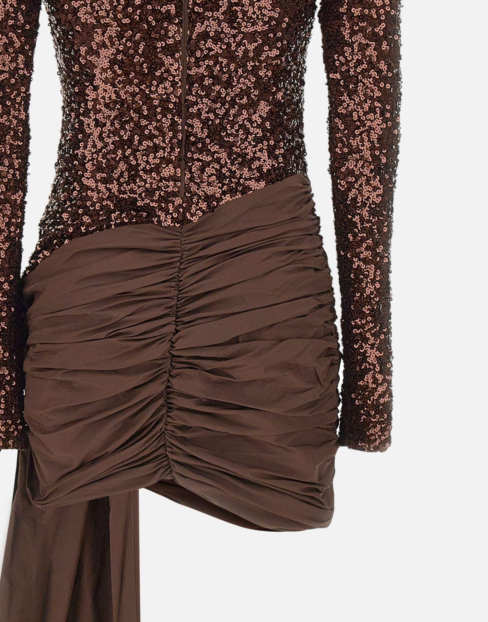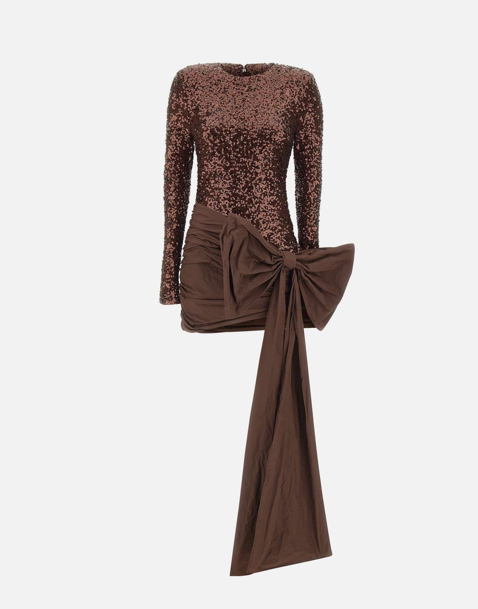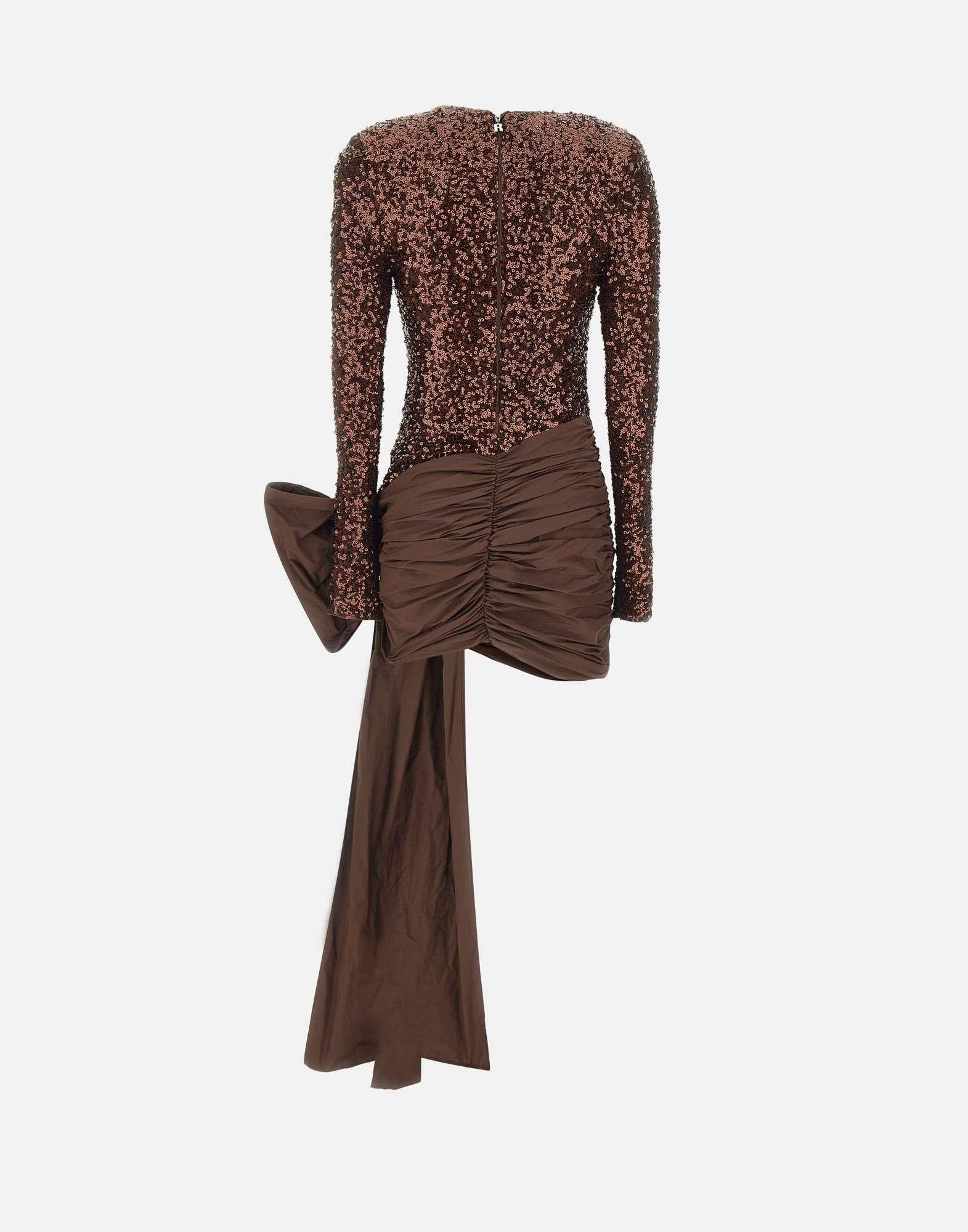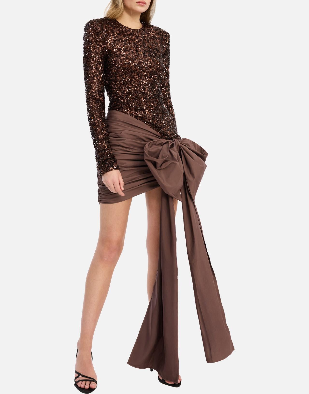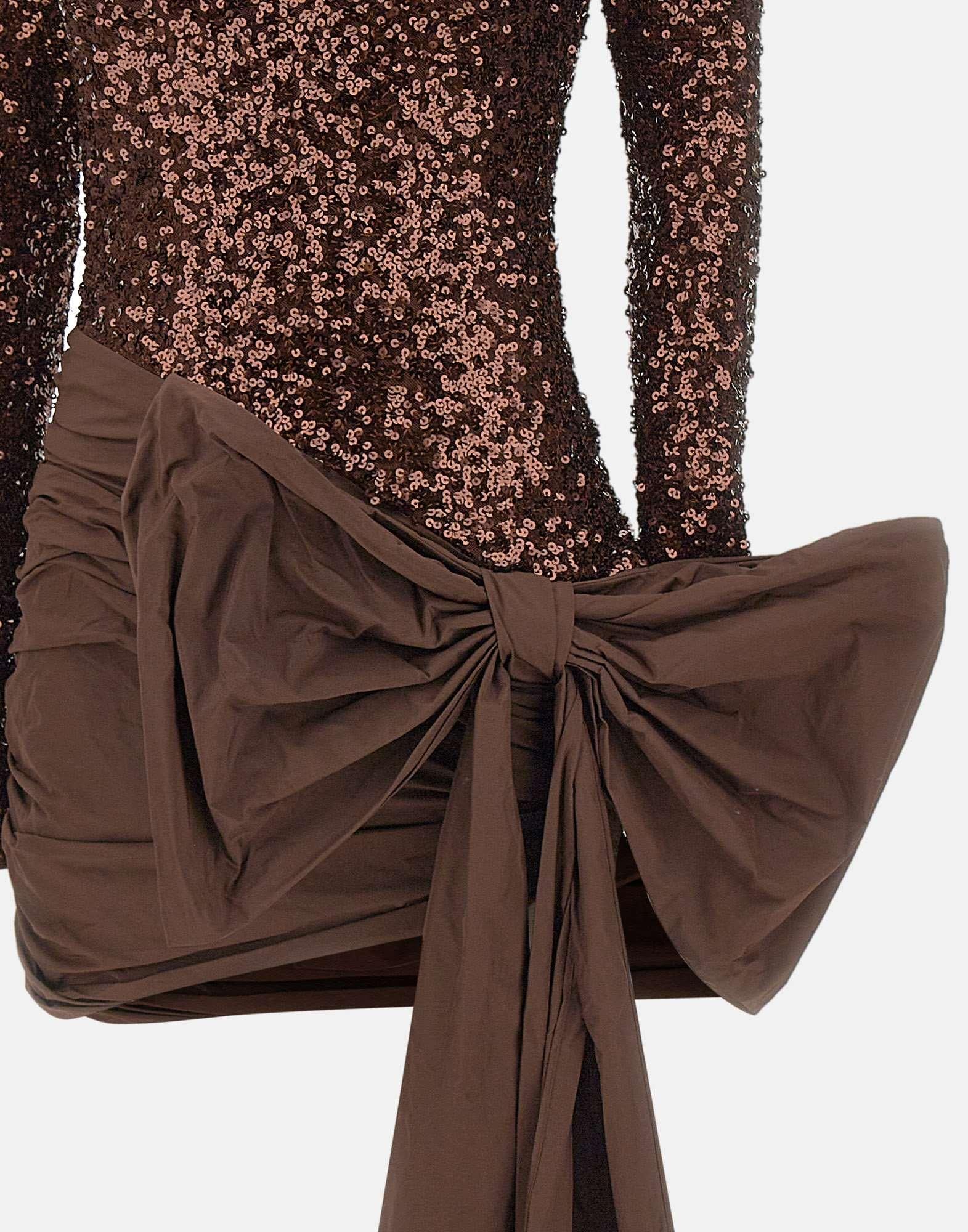 Abito donna Rotate Birger Christensen "Sequins Bow Mini Dress" color tabacco, realizzato in tessuto completamente ricoperto di paillettes per un effetto luminoso e scenografico. Presenta maniche lunghe, scollo rotondo, spalline imbottite e gonna decorata da un maxi fiocco frontale con lunghi lacci che aggiungono movimento e teatralità. Dotato di chiusura con zip posteriore e fodera interna per un comfort perfetto. Parte della Sunday Collection, con vestibilità slim fit che valorizza la silhouette.