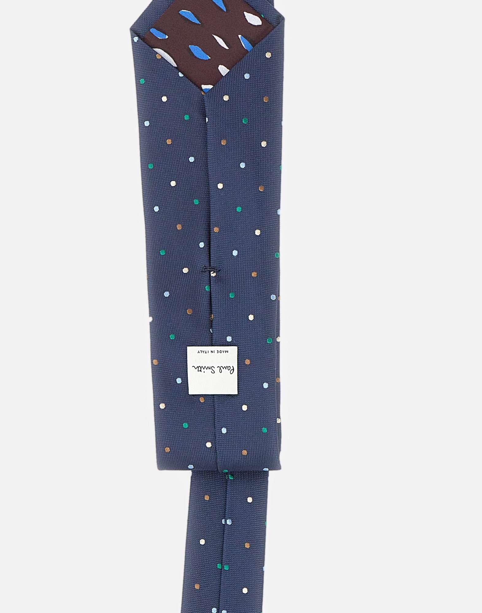 Cravatta Paul Smith "Tie Polka" in seta colore blu, impreziosita da un raffinato motivo a pois e rovescio a contrasto. Con una larghezza di 8 cm, rappresenta un accessorio elegante e distintivo, ideale per completare look formali con un tocco di stile britannico. Made in Italy, sinonimo di qualità e artigianalità.