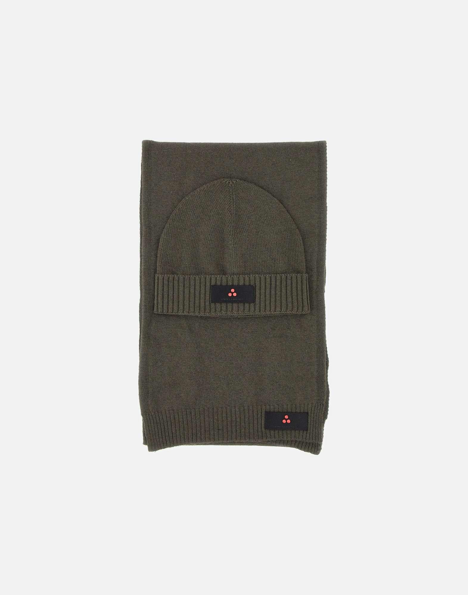 Kit Peuterey "Silli05" composto da sciarpa e berretto in misto cashmere color verde bosco. Entrambi i pezzi presentano bordi a coste e logo discreto, in taglia unica. Un set perfetto da regalare o regalarsi, elegante e versatile.