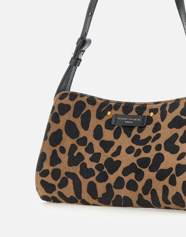 Borsa a spalla "Keira" Gianni Chiarini in pelle effetto cavallino, fantasia animalier sui toni del marrone e nero, manico superiore, galvanica oro, chiusura superiore con zip, scomparto unico,tracolla regolabile e removibile 110cm circa, logo frontale, tasca a bustina interna, made in Italy, dustbag inclusa, misure: 25cm lunghezza , 7cm profondità, 15cm altezza.