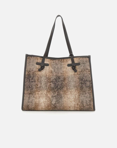 Borsa a spalla Marcella Club Gianni Chiarini "Marcella" in tessuto con effetto sfumato, caffè espresso, profili in pelle liscia tono su tono, doppio manico superiore con dettaglio nodi, chiusura con bottone a pressione, pochette chiusa da zip inclusa, scomparto unico, dustbag inclusa, misure: 31cm altezza, lunghezza 38cm, 16cm profondità, dustbag inclusa, made in Italy