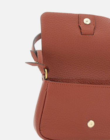 Borsa a spalla "Marisol" in pelle grana maxi, rosso mattone, manico superiore, galvanica oro, chiusura con patta e bottone a pressione, scomparto unico, tracolla regolabile e removibile, logo oro sul retro, misure: 14cm altezza, 21cm lunghezza max, profondità 5cm, dustbag inclusa, made in Italy, dustbag inclusa.