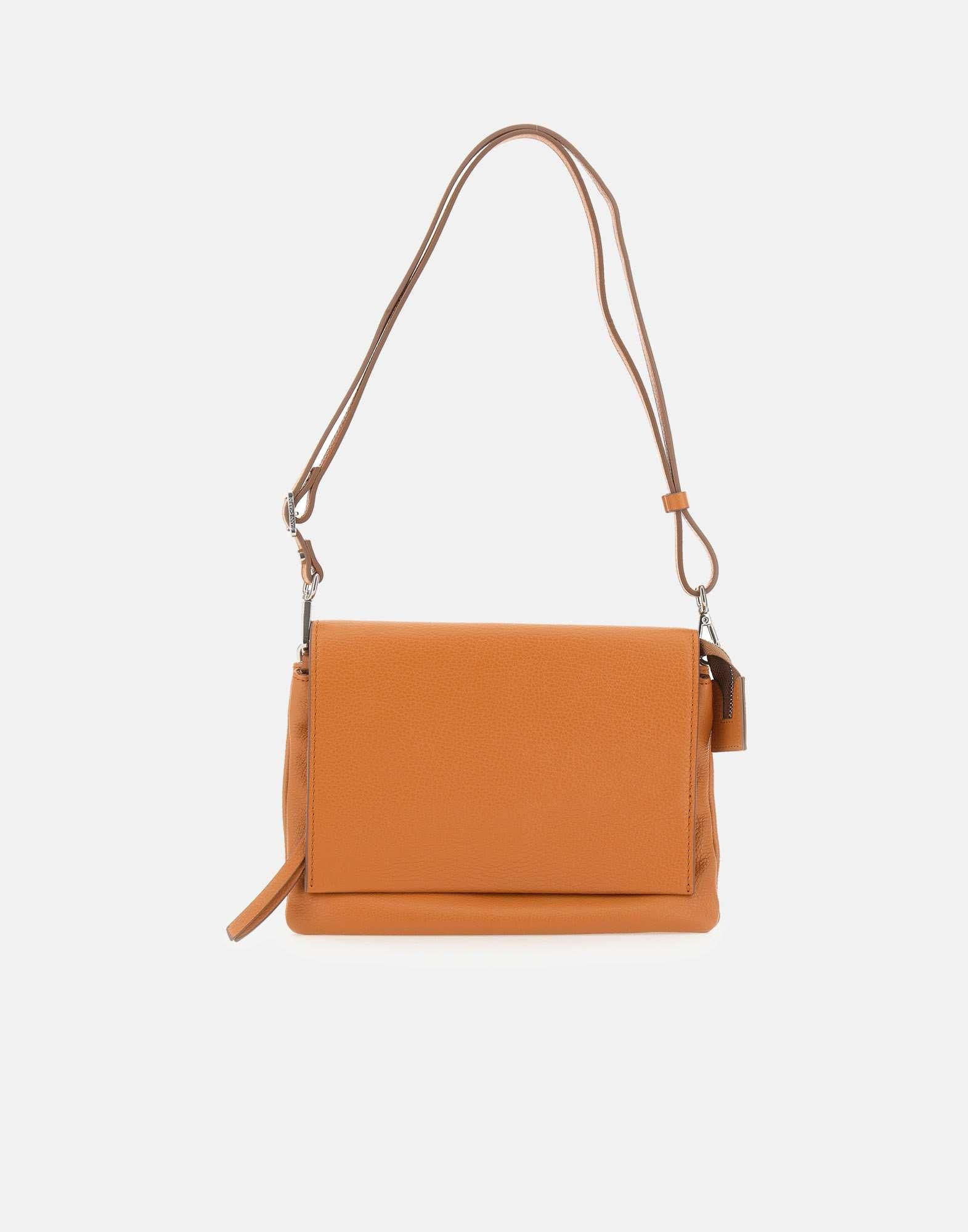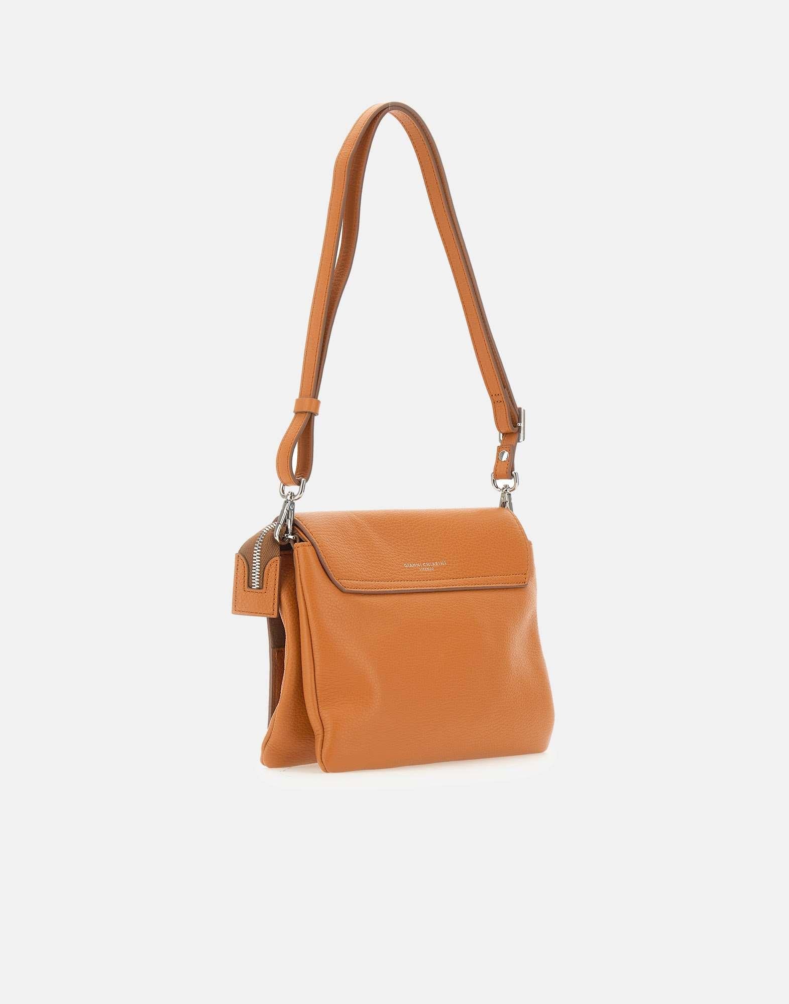 Borsa a tracolla "Three" Gianni Chiarini realizzata in pelle martellata color arancione, ideale per dare carattere ai look quotidiani. Presenta chiusura con patta e bottone magnetico e una tasca con zip sotto la patta, pensata per una gestione pratica degli essenziali. L'interno è organizzato con due scomparti, mentre la tracolla regolabile e removibile consente di indossarla crossbody. Logo stampato in argento sul retro. Include dust bag. Dimensioni: 25x20x7 cm.