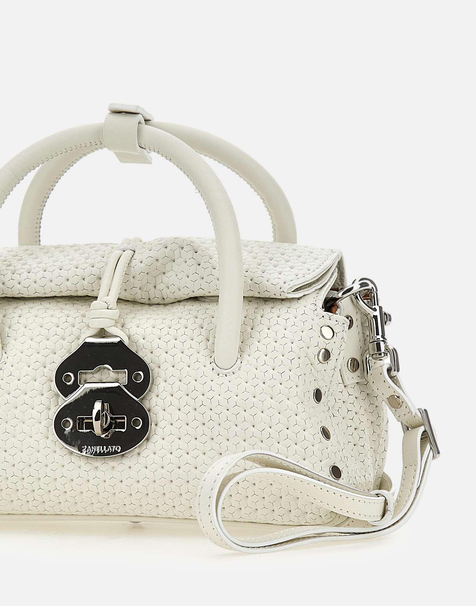 Borsa a tracolla Zanellato "Dotta Casa Venissa" realizzata in pelle bianca caratterizzata da un raffinato design a trama con piccoli fori decorativi. Il modello presenta due manici superiori e tracolla removibile e regolabile, per una portabilita versatile. La chiusura con patta magnetica e meccanismo metallico a girella assicura funzionalita e riconoscibilita iconica. L' interno in tessuto e dotato di due scomparti con una tasca a bustina per lorganizzazione degli oggetti essenziali. Completano il design i dettagli silver, i bottoncini laterali e i piedini metallici al fondo. Dimensioni: altezza 14 cm, larghezza 20 cm, profondita 10 cm. Dustbag inclusa. Made in Italy.