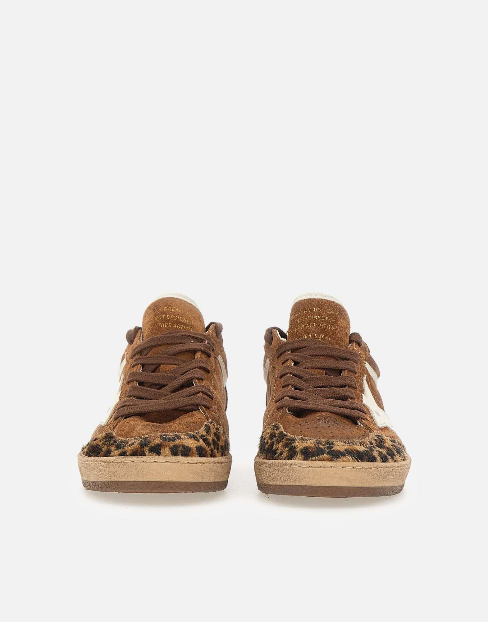 Sneakers donna Golden Goose "Ball star" in pelle scamosciata marrone, con inserti in cavallino leopardato su punta e tallone e iconica stella bianca sul lato esterno. Presentano chiusura con lacci in cotone marrone, fori traspiranti sulla punta e scritte dorate "KERS" sul tallone e "GGDB/BALLSTAR" sul lato. La suola in gomma alta 3 cm completa il design dal fascino vintage sportivo, simbolo dello stile Golden Goose che unisce artigianalità e attitudine urbana.