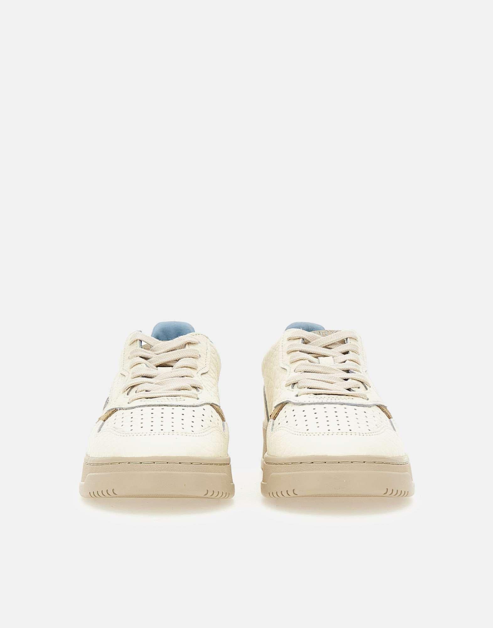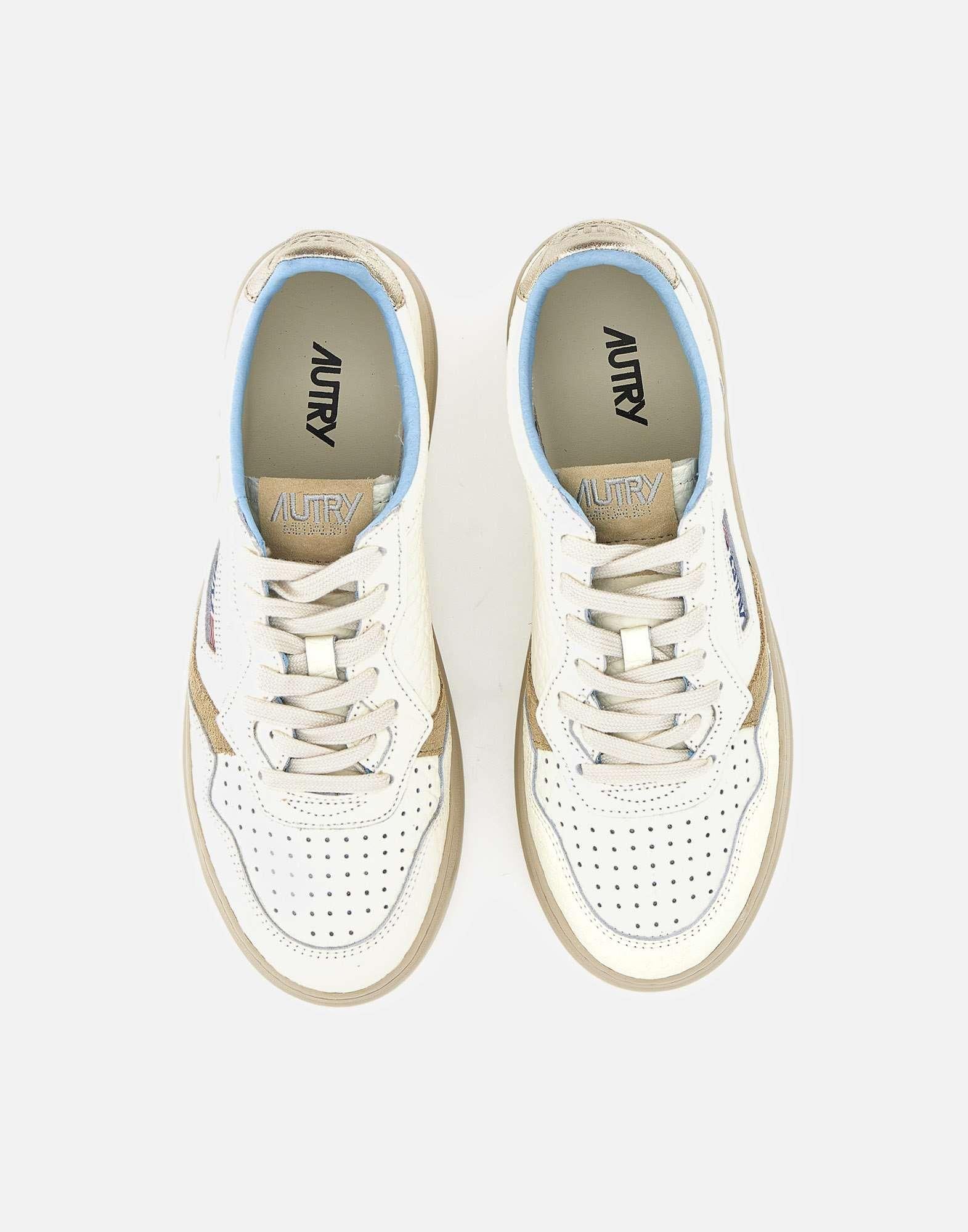 Sneakers donna Autry "Medalsit Low" in pelle bianca a grana naturale, morbida e dall'aspetto autentico, arricchita da piccoli dettagli laterali in suede beige e punta traforata per una perfetta traspirabilità. Il tallone in pelle laminata color platino con logo impresso aggiunge un tocco luminoso, mentre l'inserto laterale con logo Autry jacquard completa il design. Lacci piatti in cotone color panna e suola in gomma beige leggermente più scura, alta 3,5 cm. Un mix raffinato di texture e materiali per una sneaker dall'equilibrio perfetto tra stile iconico e contemporaneità.