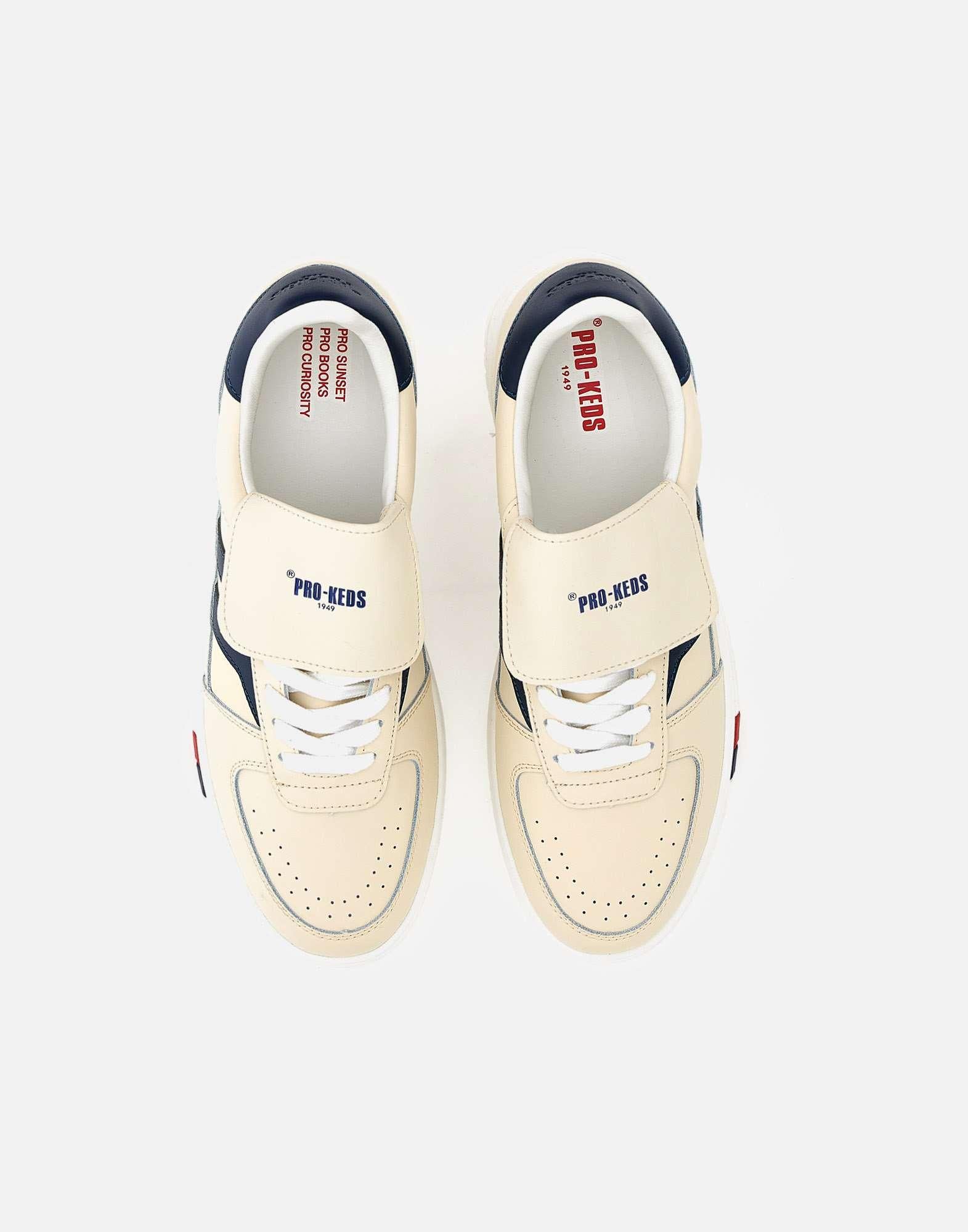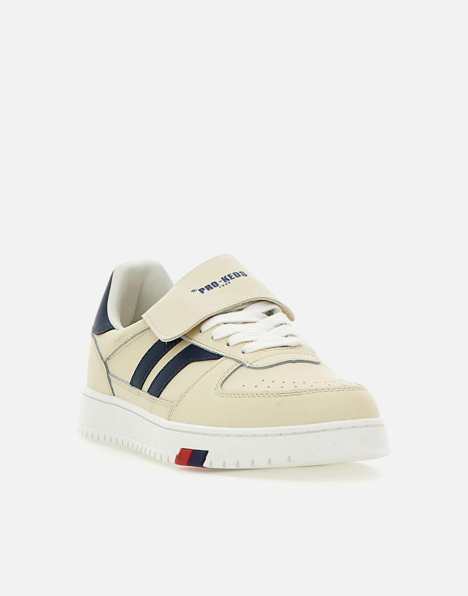 Sneakers "Field King" Pro-Keds 1949, tomaia in pelle, color burro e blu notte, iconica linguetta con doppia portabilità, lacci cerati in cotone, fodera in pelle, punta traforata, logo impresso sul tallone, suola dentellata in gomma, altezza 3cm. Calzata regolare, custodia inclusa.