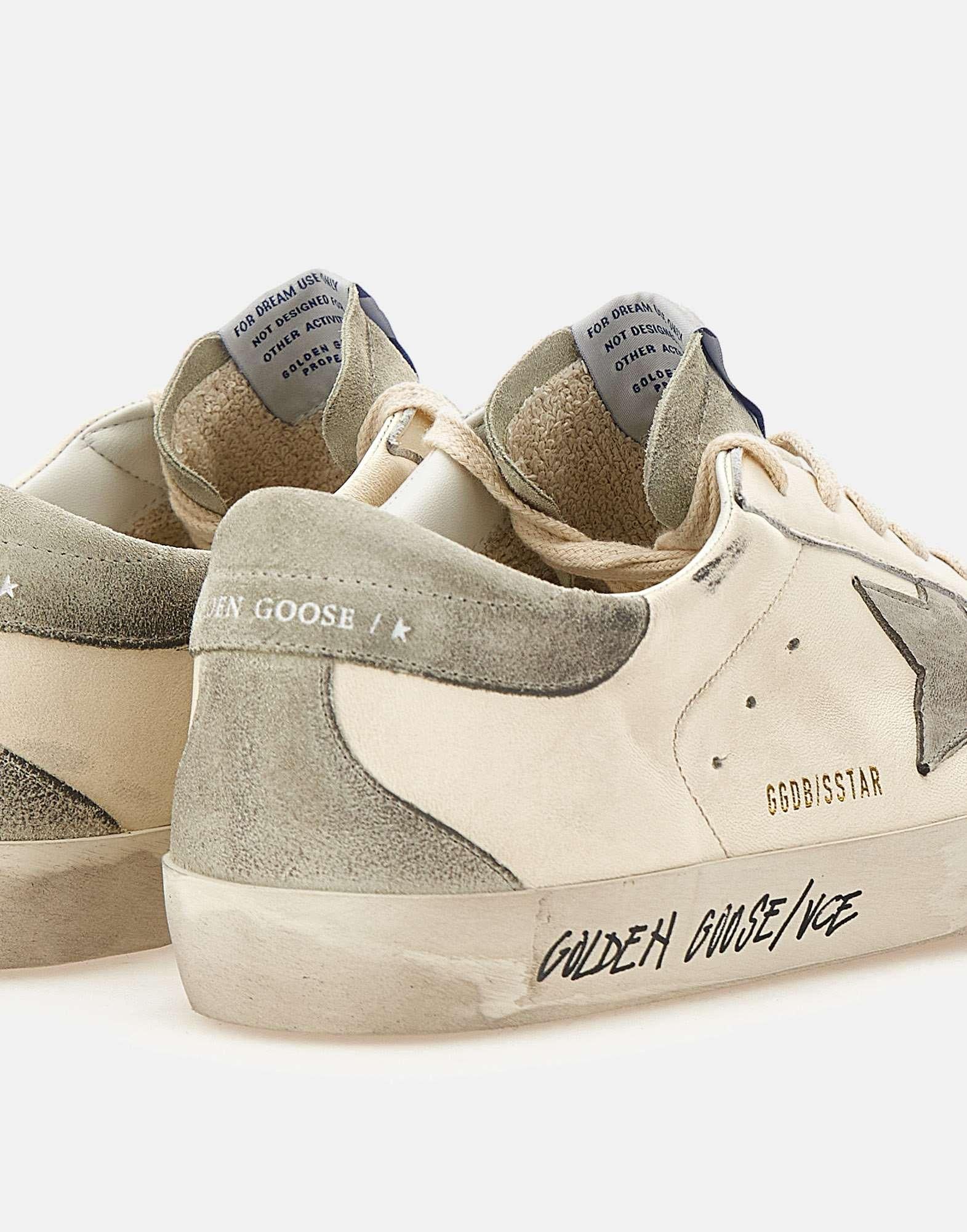Sneakers uomo Golden Goose "Superstar Classic" in pelle, panna e grigio, effetto used, lacci piatti, etichetta logo a colori blu sulla linguetta, logo sul talloncino, iconica stella laterale, cuciture a vista, fori per traspirazione, punta tonda, suola in gomma con scritte alta 2,5 cm. Custodia in tessuto inclusa. Made in Italy.Calzata regolare. Per chi solitamente opta per il mezzo numero è consigliabile salire di una taglia poiché il brand non utilizza mezze misure.