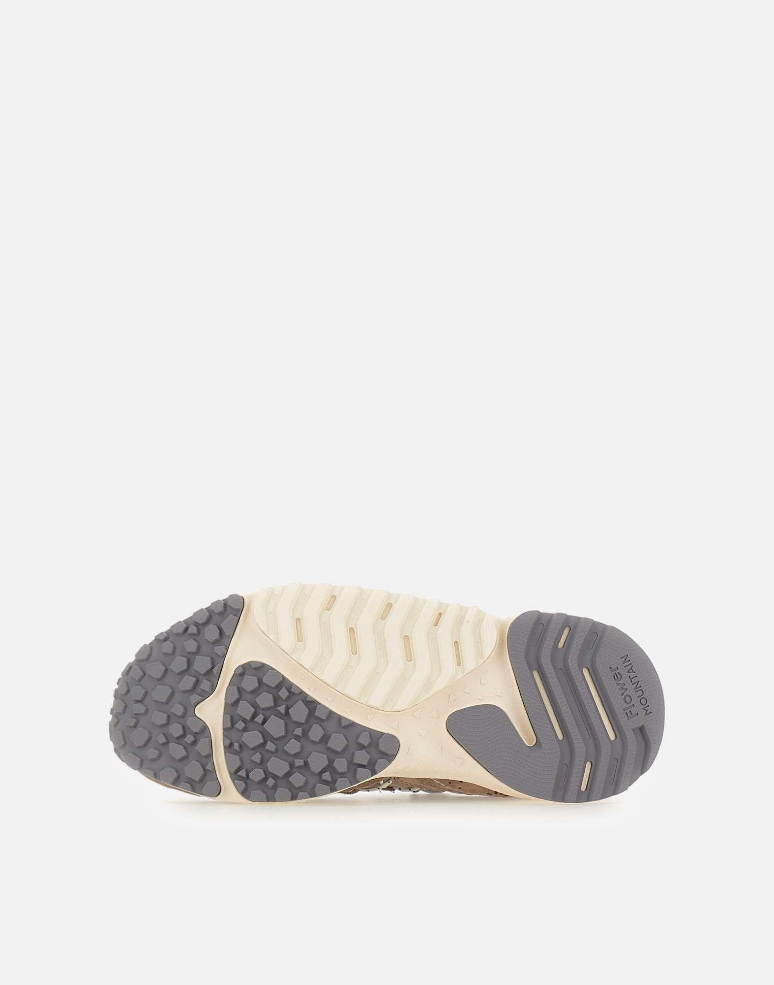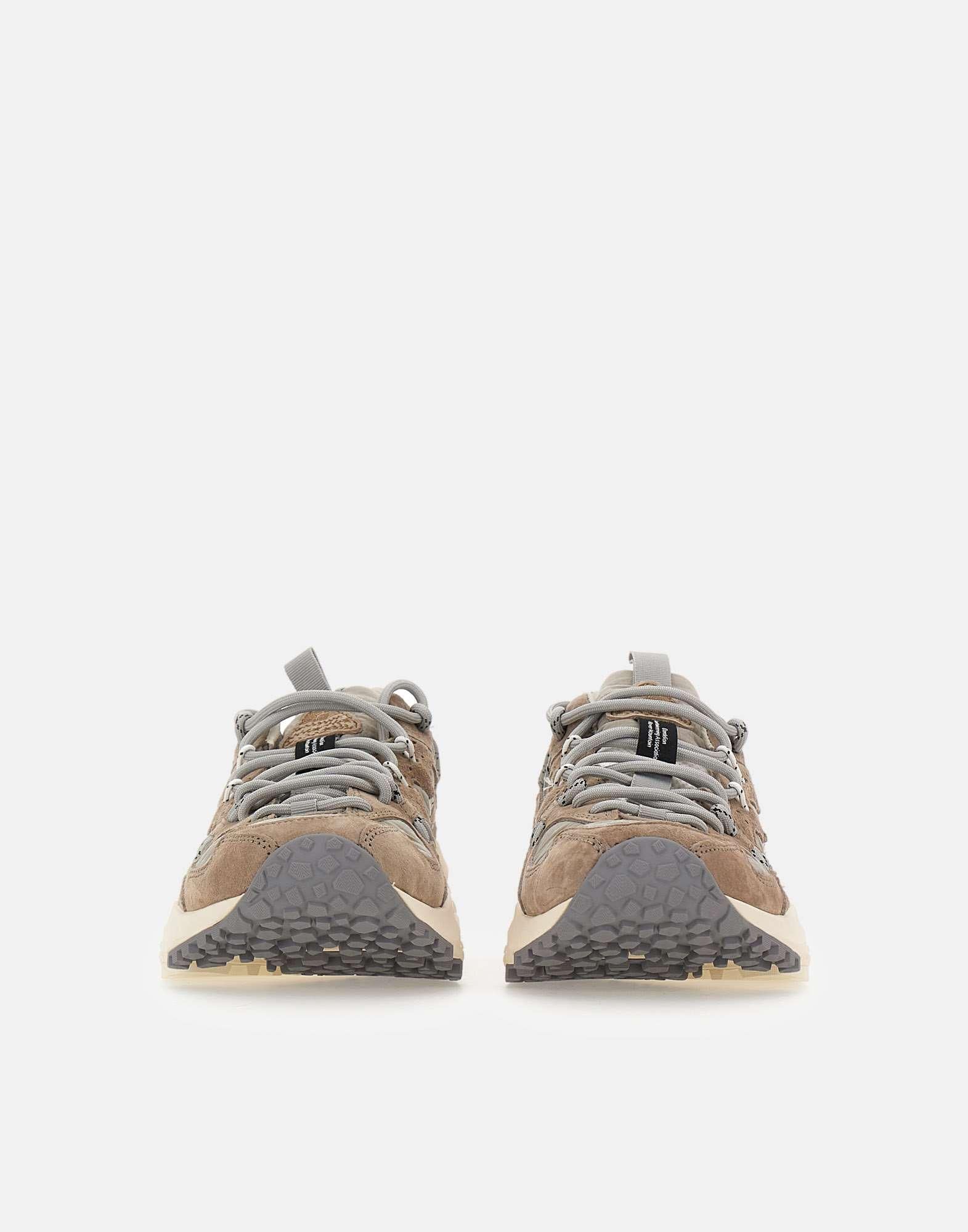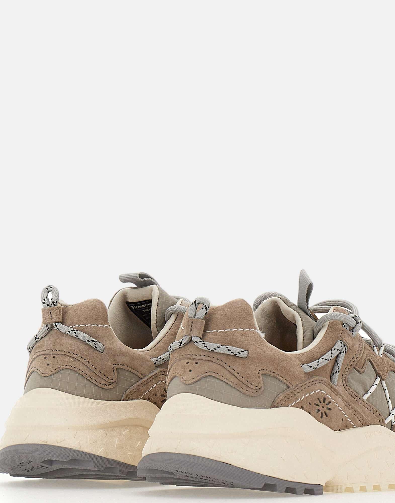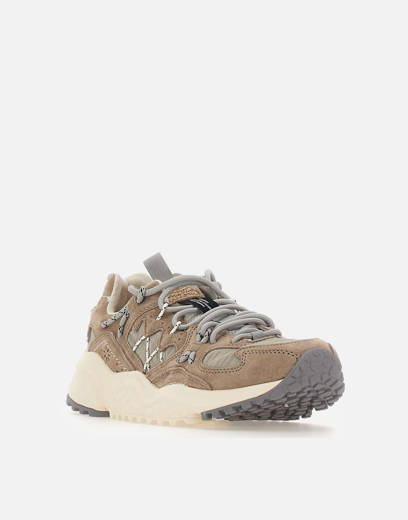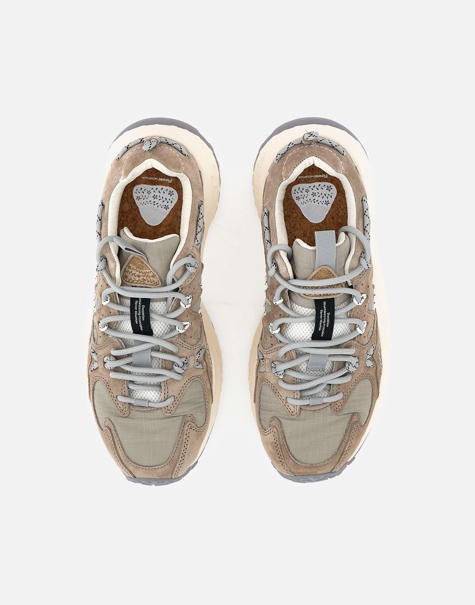 Sneakers Flower Mountain "Yamabushi Uni", sabbia e grigio chiaro, ispirate al mondo outdoor, con tomaia in tessuto ripstop e inserti sagomati in suede tono su tono lavorati con tecnica overlapping. Le stringhe tubolari laterali creano un originale gioco di occhielli a contrasto, donando carattere e dinamismo al design. Presentano fodera in pelle e tessuto, soletta anatomica in sughero naturale antibatterico e suola in gomma con sagomature e battistrada dentellato per un grip ottimale. Calzata regolare.