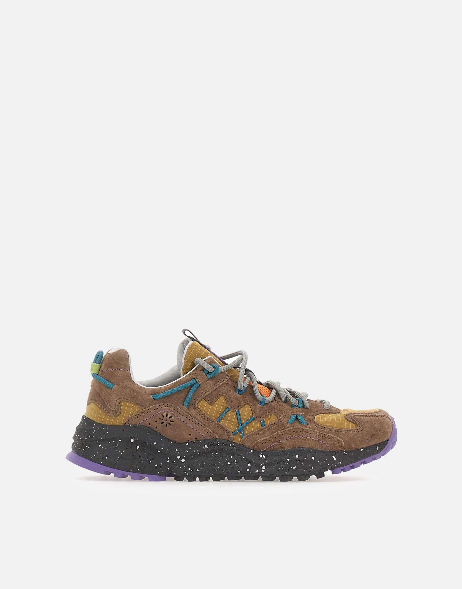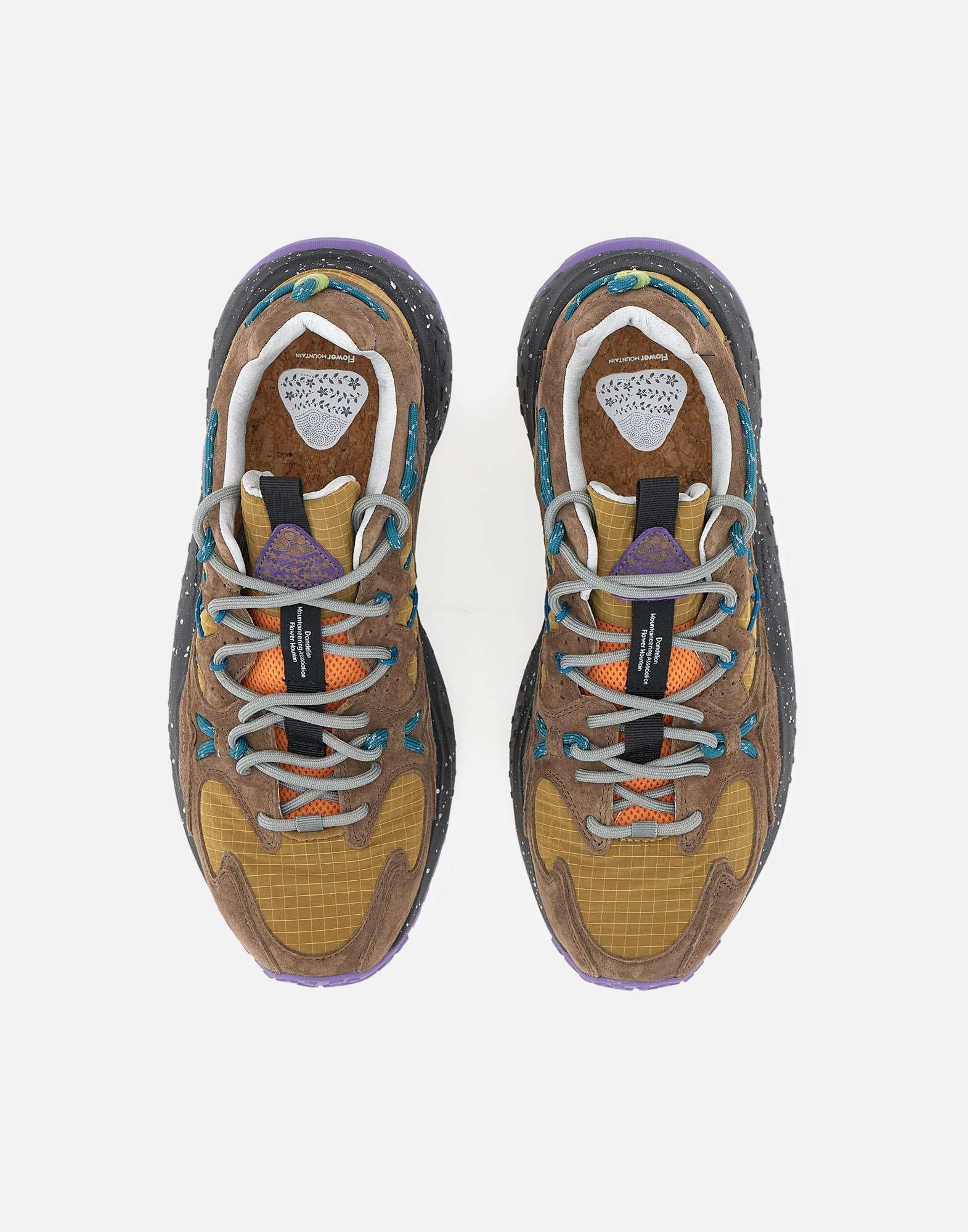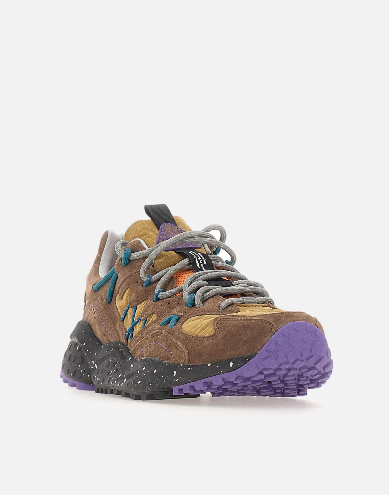 Sneakers Flower Mountain "Yamabushi Uni", tortora con dettagli a contrasto arancio, viola e petrolio, ispirate al mondo outdoor, con tomaia in tessuto ripstop e inserti sagomati in suede tono su tono lavorati con tecnica overlapping. Le stringhe tubolari laterali creano un originale gioco di occhielli a contrasto, donando carattere e dinamismo al design. Presentano fodera in pelle e tessuto, soletta anatomica in sughero naturale antibatterico e suola in gomma con sagomature e battistrada dentellato per un grip ottimale. Calzata regolare.