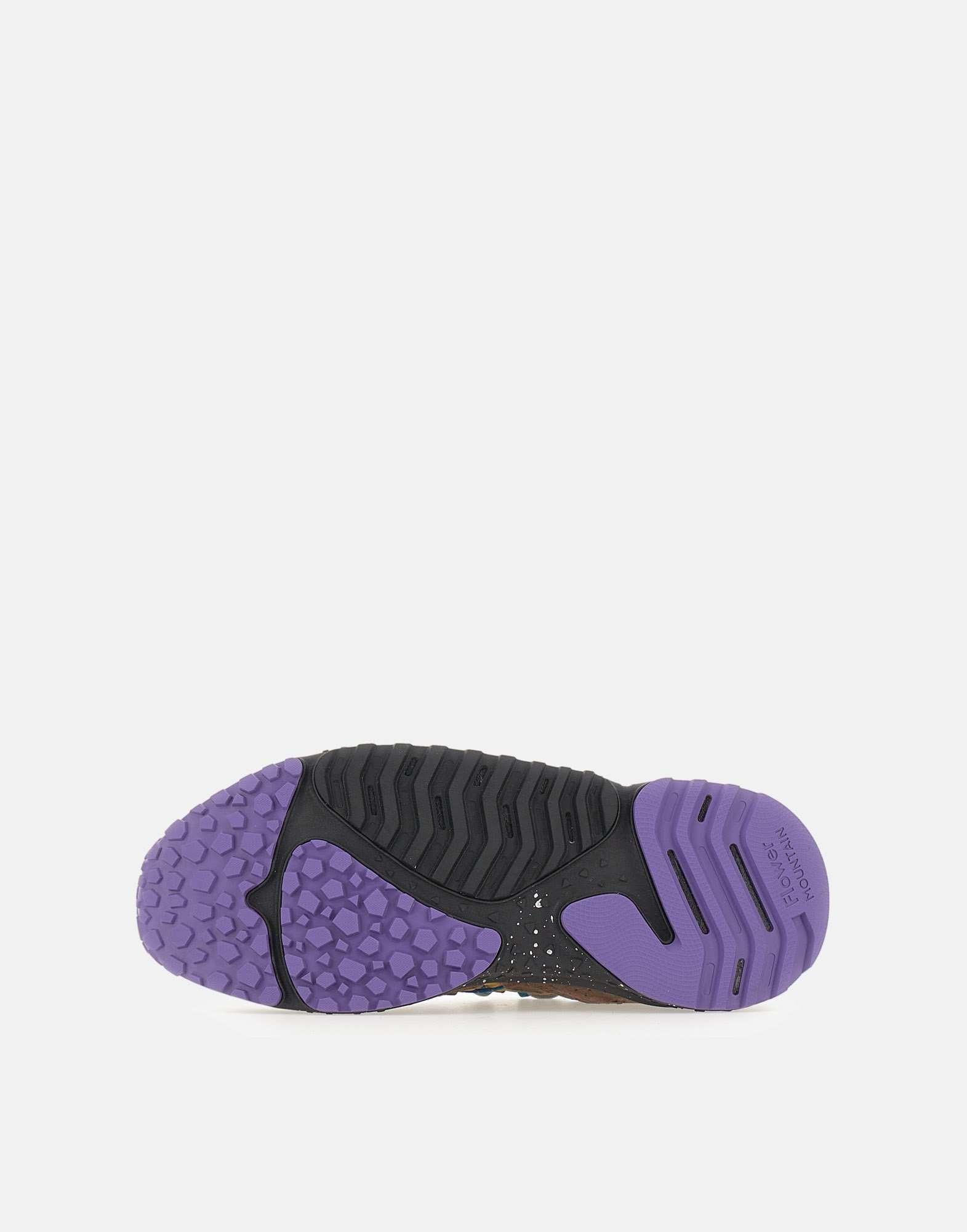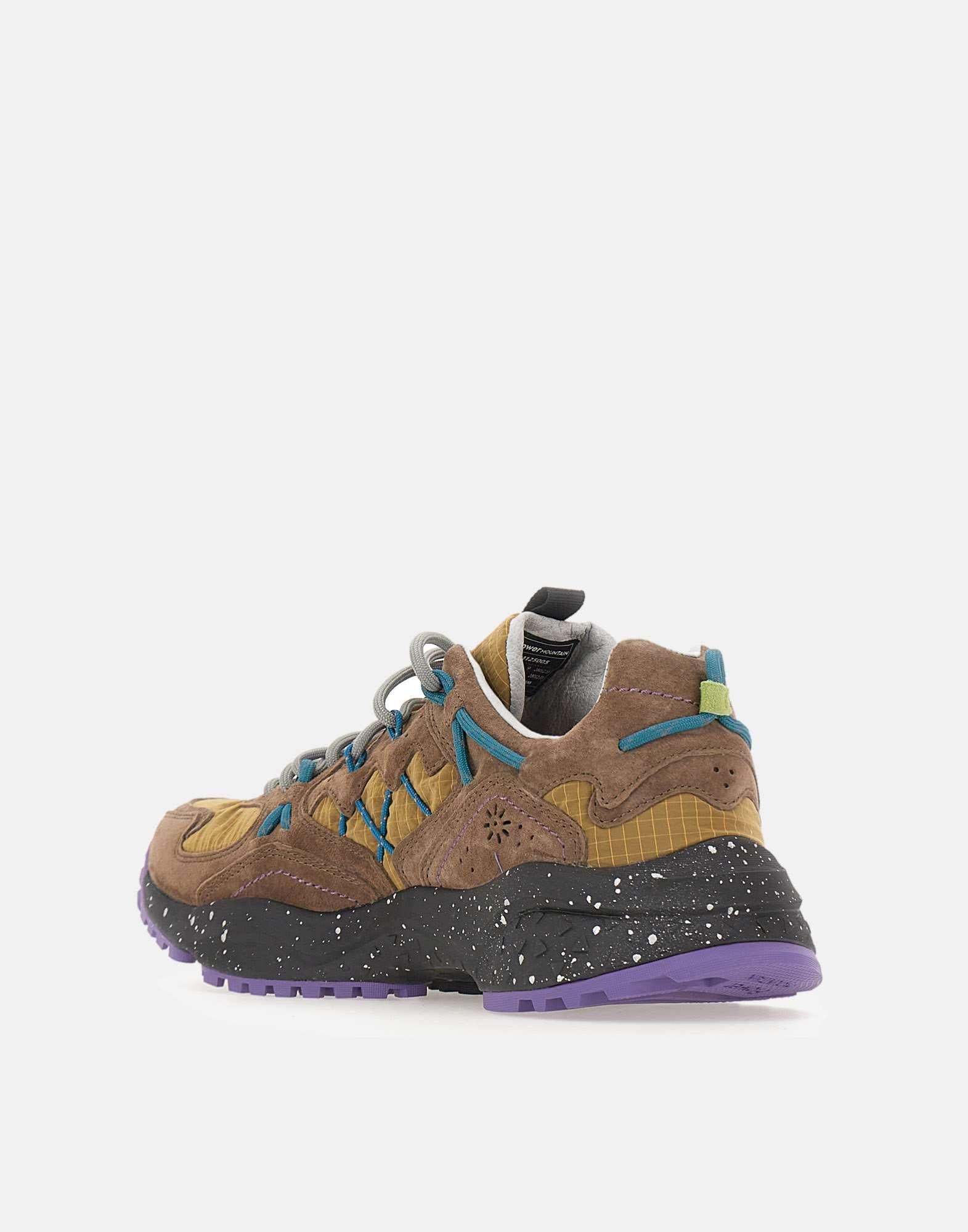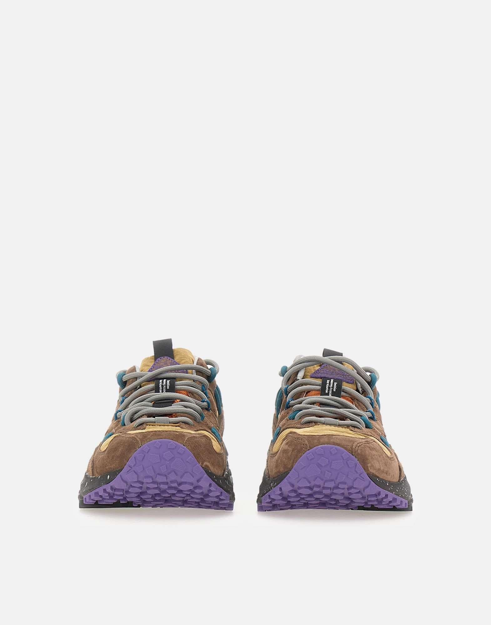 Sneakers Flower Mountain "Yamabushi Uni", tortora con dettagli a contrasto arancio, viola e petrolio, ispirate al mondo outdoor, con tomaia in tessuto ripstop e inserti sagomati in suede tono su tono lavorati con tecnica overlapping. Le stringhe tubolari laterali creano un originale gioco di occhielli a contrasto, donando carattere e dinamismo al design. Presentano fodera in pelle e tessuto, soletta anatomica in sughero naturale antibatterico e suola in gomma con sagomature e battistrada dentellato per un grip ottimale. Calzata regolare.
