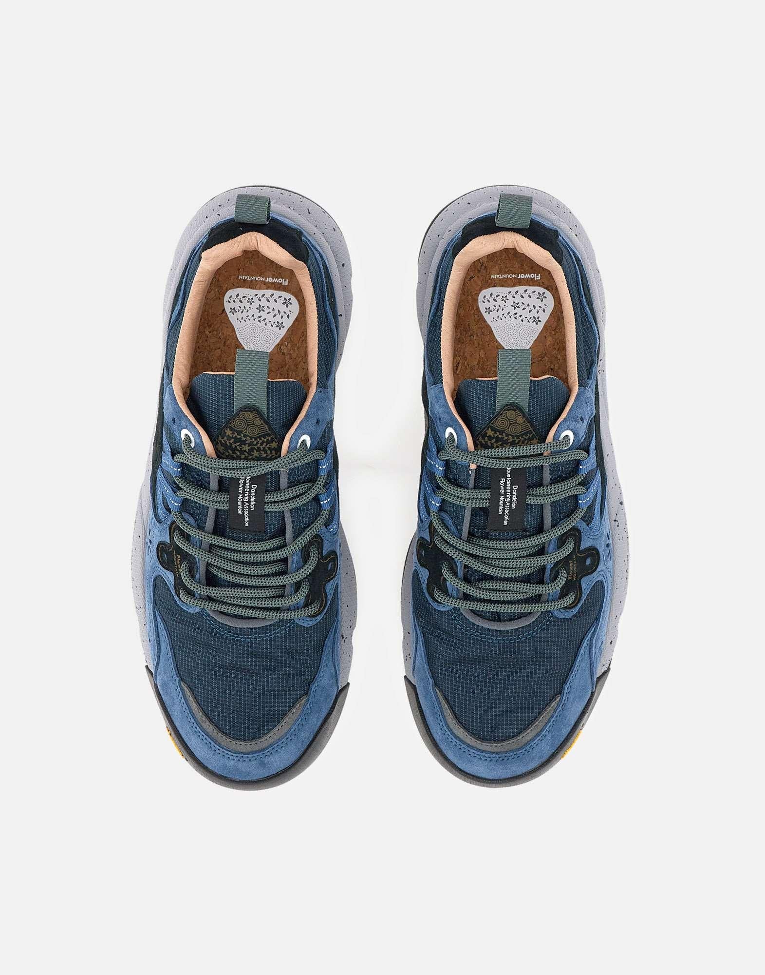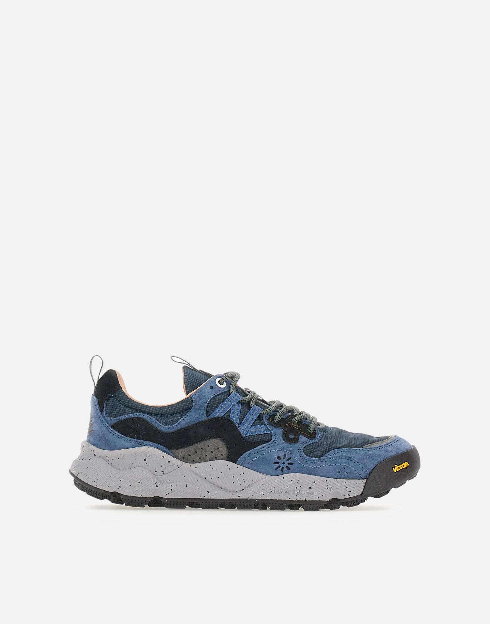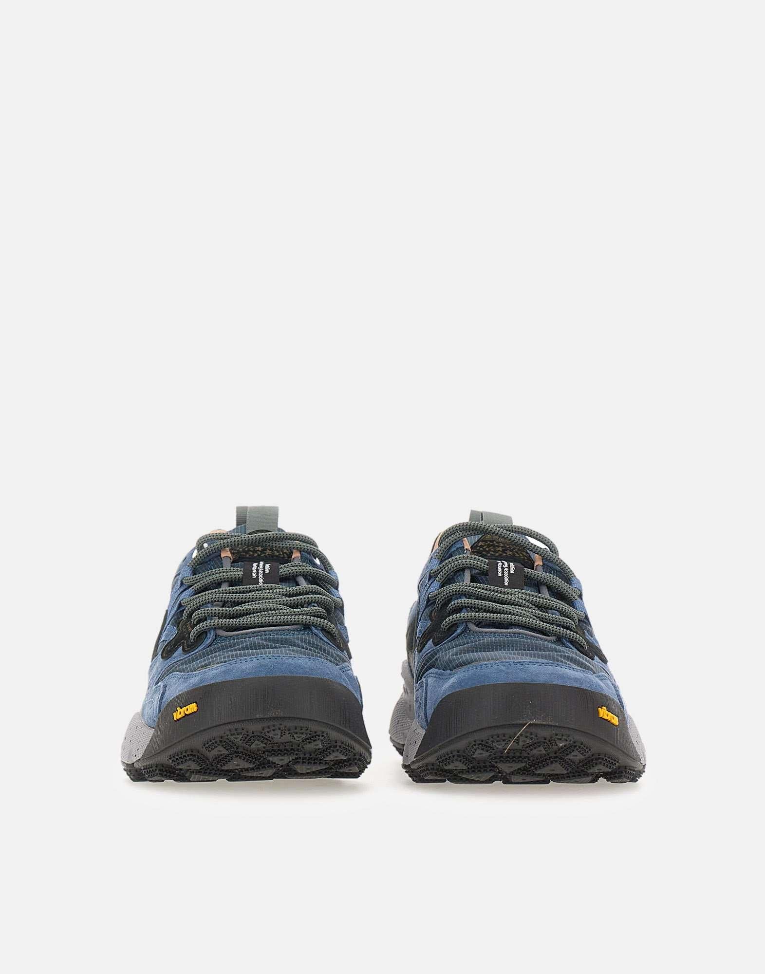 Sneakers Flower Mountain "Yamano 3 Uni" nei toni del blu, dal design sportivo e contemporaneo. La tomaia in tessuto è arricchita da inserti multicolor in suede lavorati con tecnica overlapping, mentre la chiusura con stringhe trekking bicolori e occhielli dalla sagomatura floreale richiama lo stile outdoor del brand. Presentano fodera in tessuto e pelle, soletta interna in sughero naturale antibatterico e suola in gomma ultraleggera con battistrada dentellato per massima aderenza e comfort. Calzata regolare.