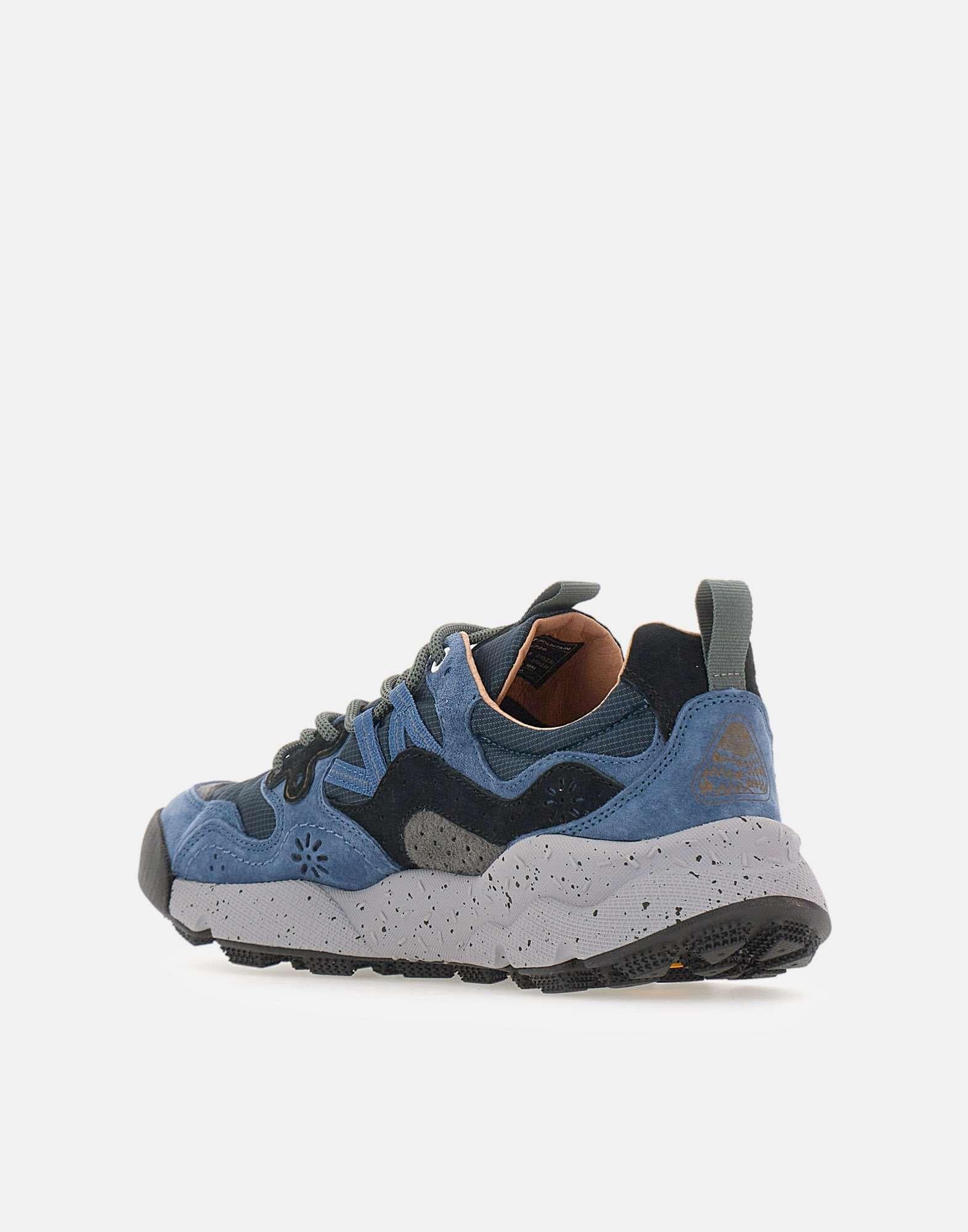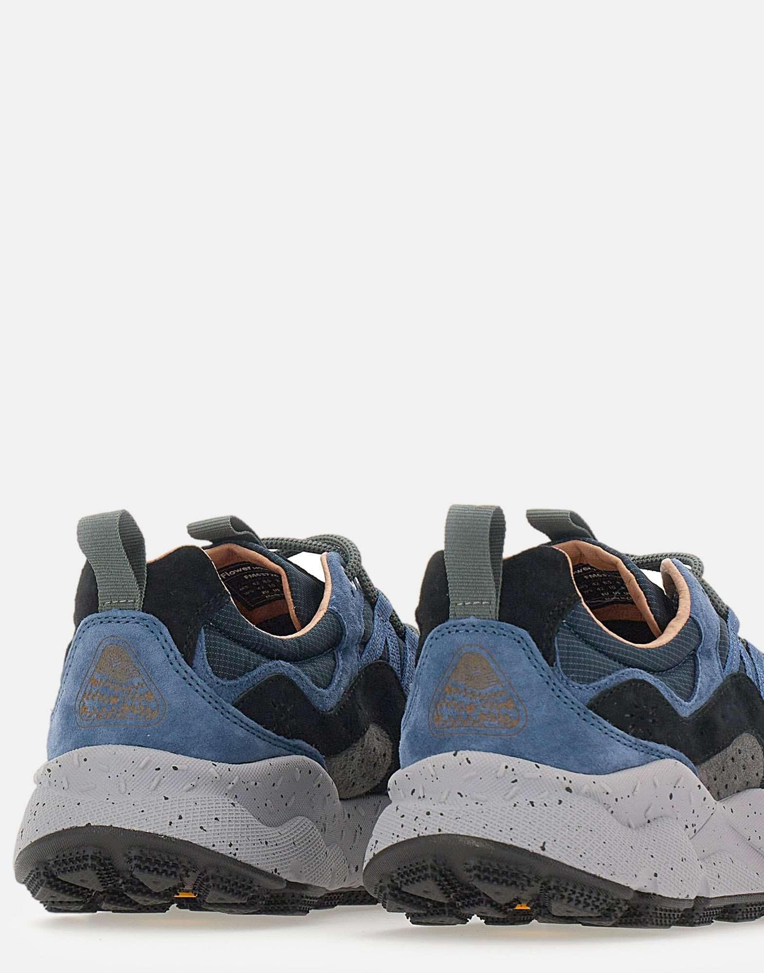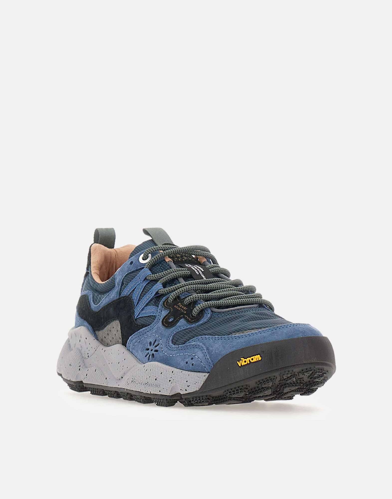 Sneakers Flower Mountain "Yamano 3 Uni" nei toni del blu, dal design sportivo e contemporaneo. La tomaia in tessuto è arricchita da inserti multicolor in suede lavorati con tecnica overlapping, mentre la chiusura con stringhe trekking bicolori e occhielli dalla sagomatura floreale richiama lo stile outdoor del brand. Presentano fodera in tessuto e pelle, soletta interna in sughero naturale antibatterico e suola in gomma ultraleggera con battistrada dentellato per massima aderenza e comfort. Calzata regolare.