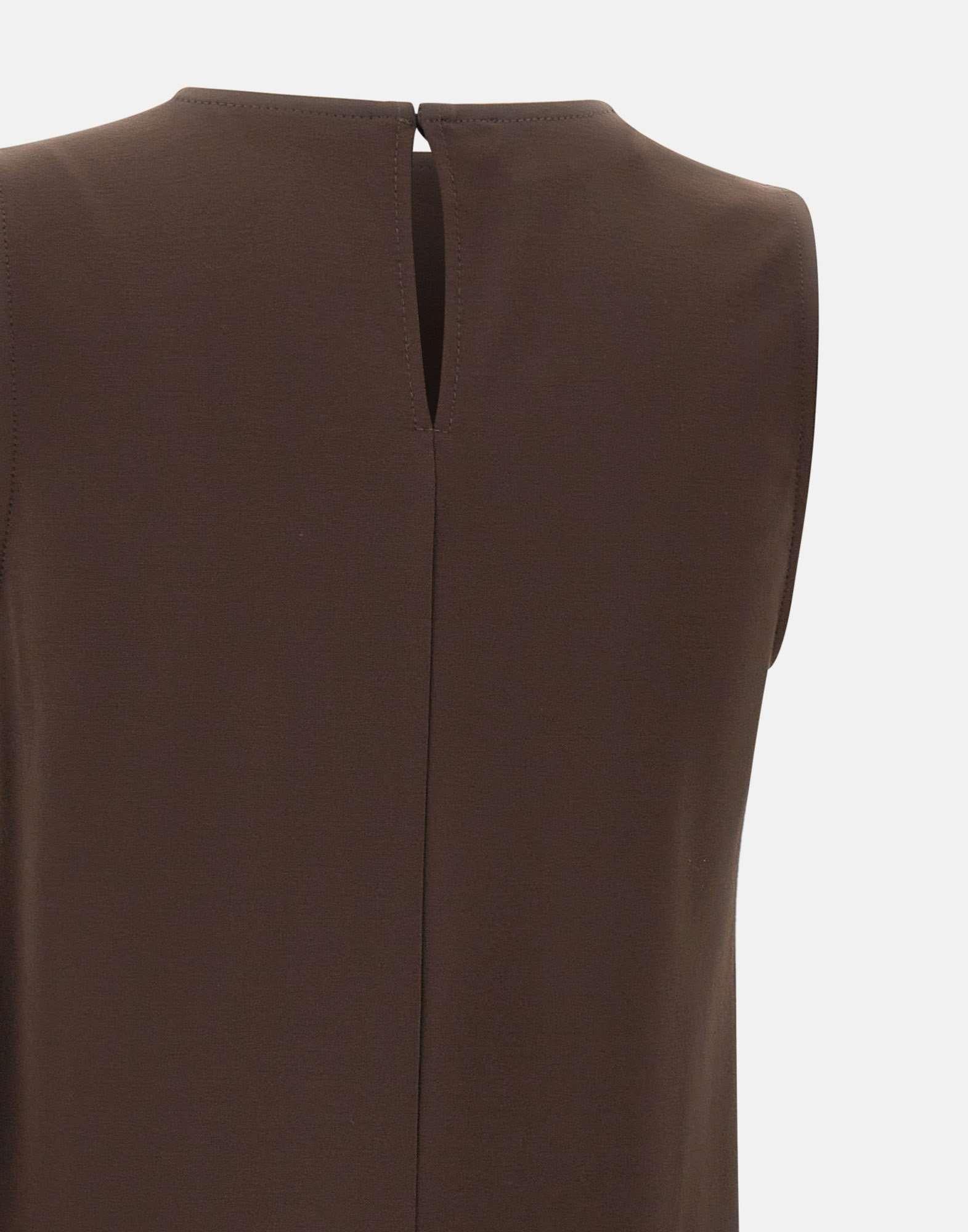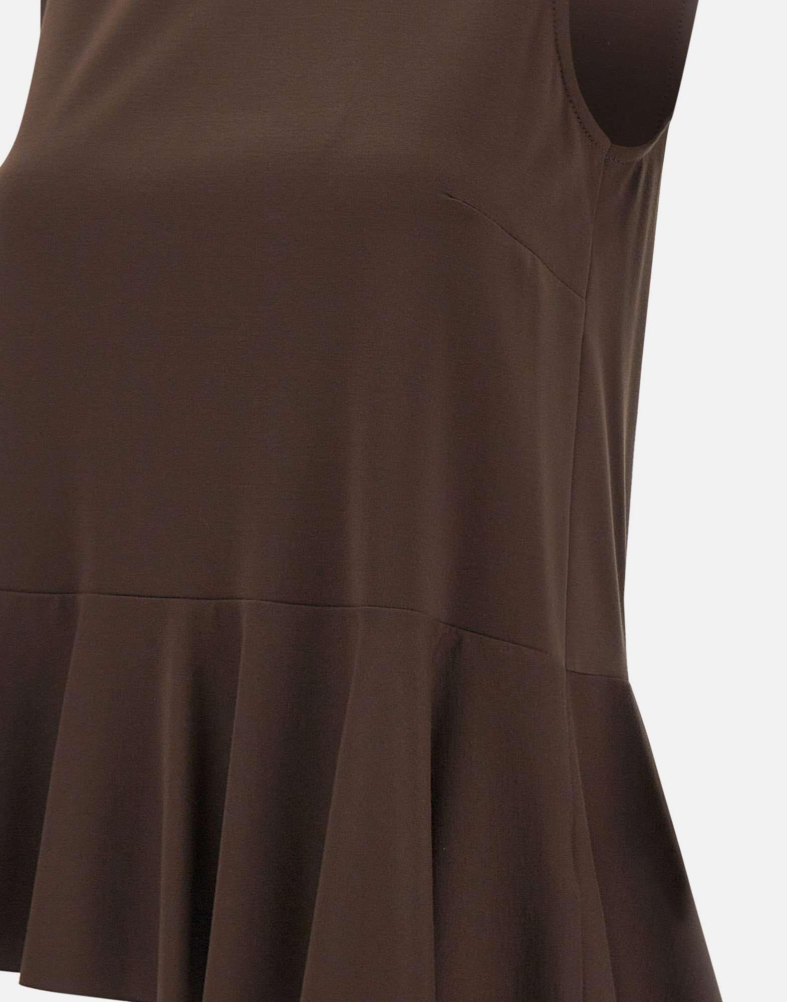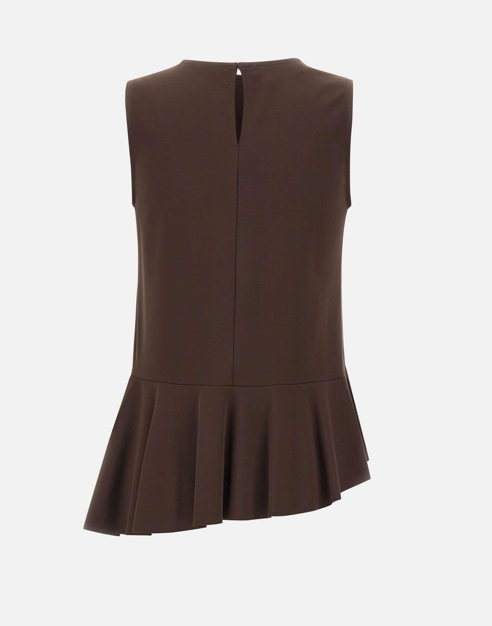 Blusa Kaos realizzata in misto viscosa elasticizzato color cioccolato, con linea svasata e vestibilità rilassata. Il modello smanicato presenta scollo tondo e una piccola apertura sul retro con bottoncino, per un dettaglio essenziale e raffinato. Sul fondo, la fascia asimmetrica con balze aggiunge movimento e definisce il design. Made in Italy.