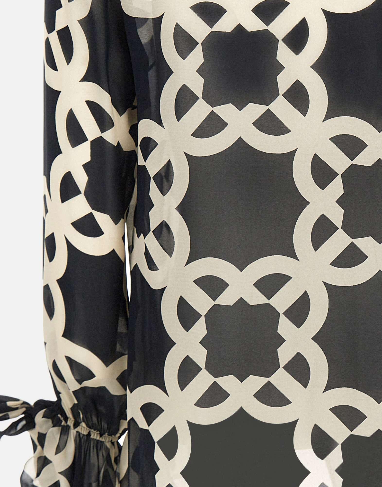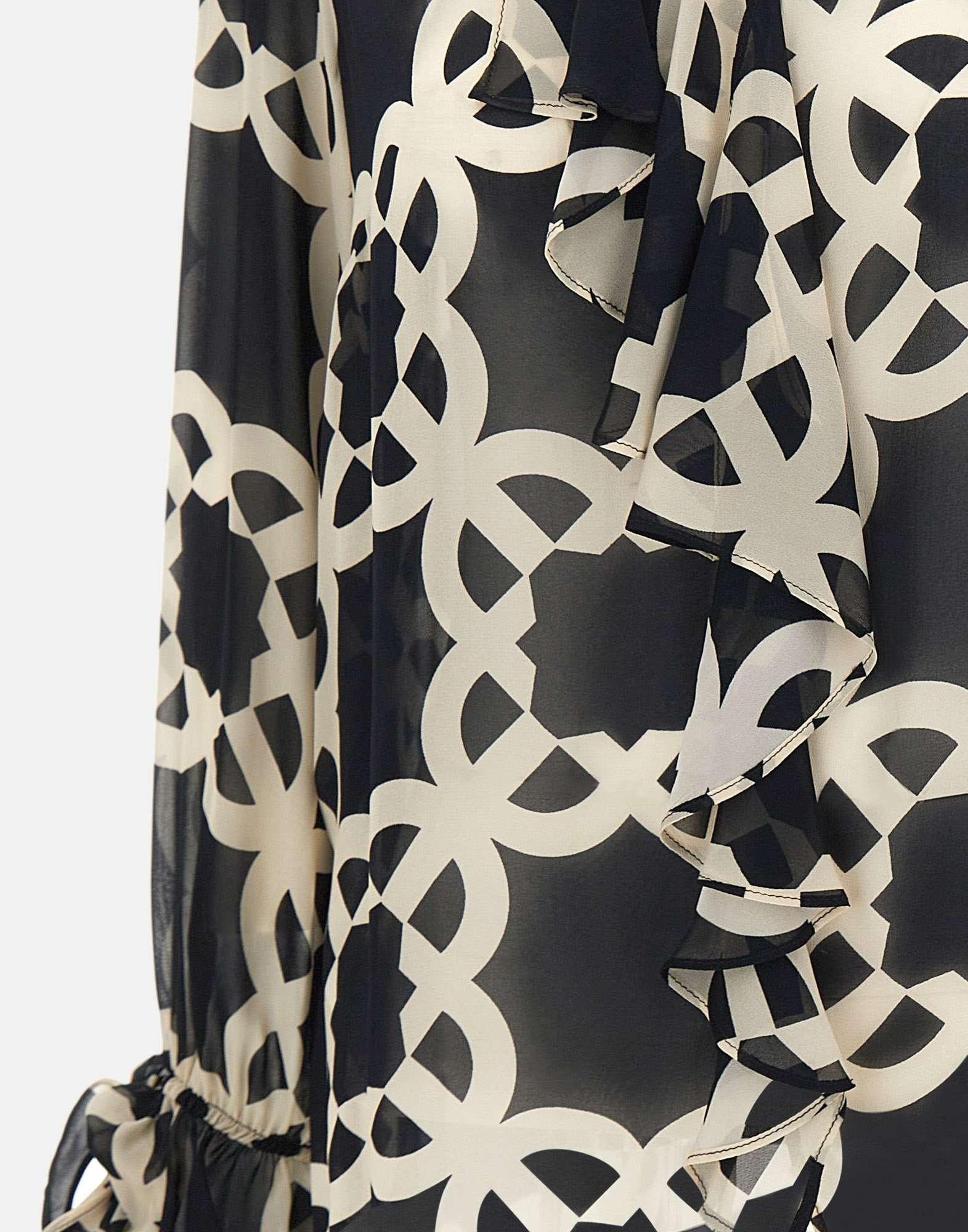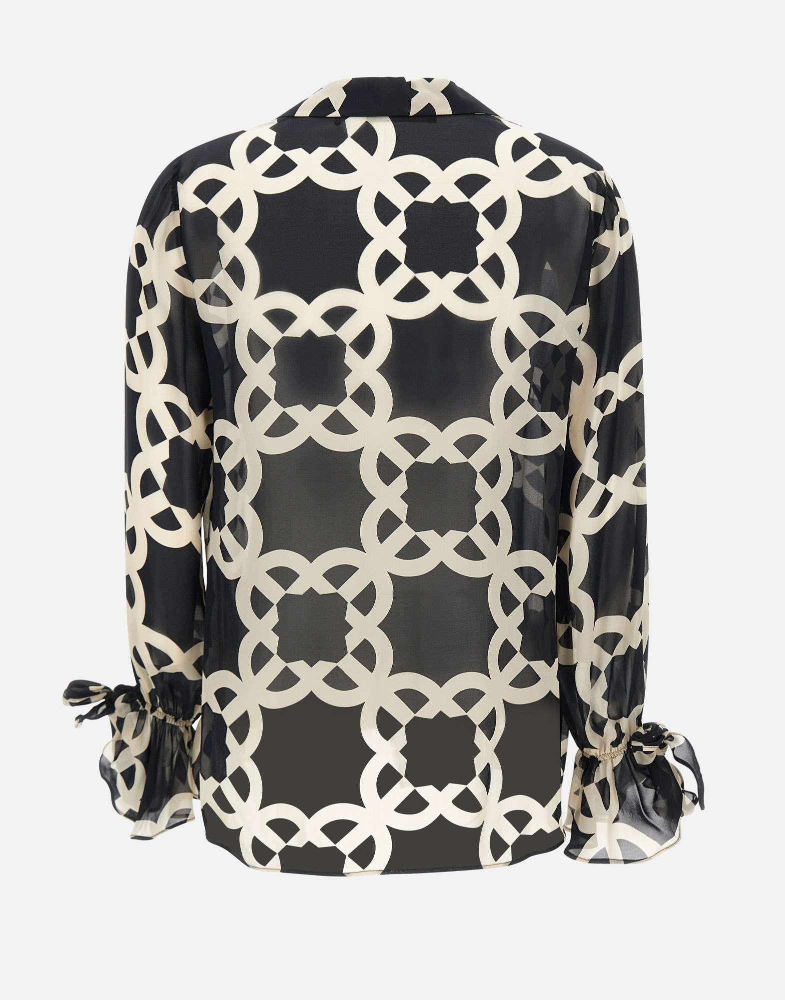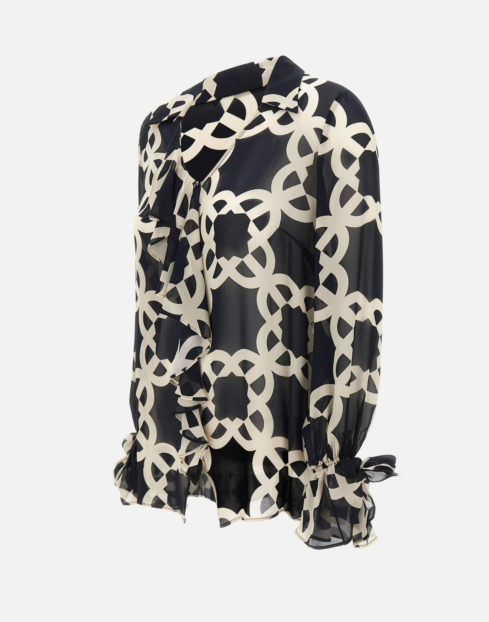 Camicia Elena Mirò in crepe di viscosa, fantasia optical nei toni del bianco e nero, dallo stile elegante e femminile. Presenta maniche lunghe, scollo a V, polsini con arricciatura e rouches sul davanti che donano movimento e raffinatezza. La vestibilità regular fit assicura comfort e versatilità, perfetta per look da giorno o da ufficio.